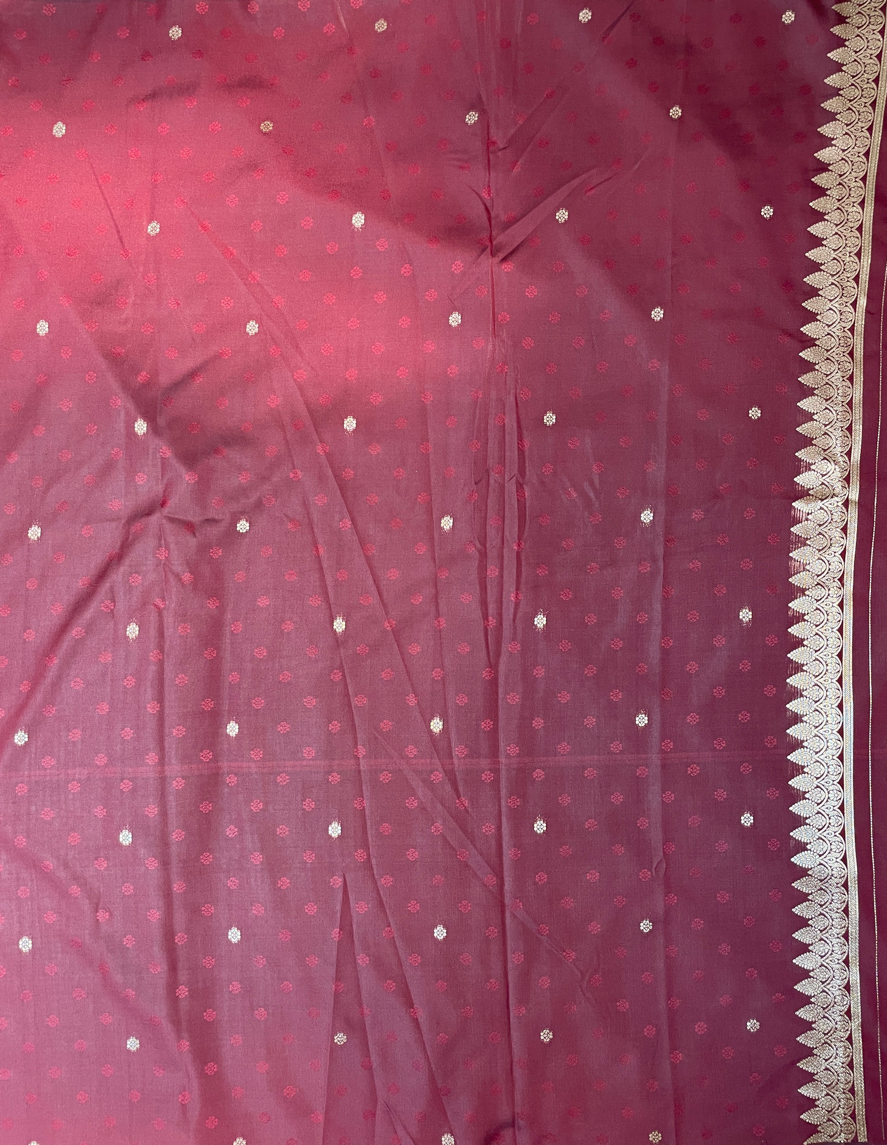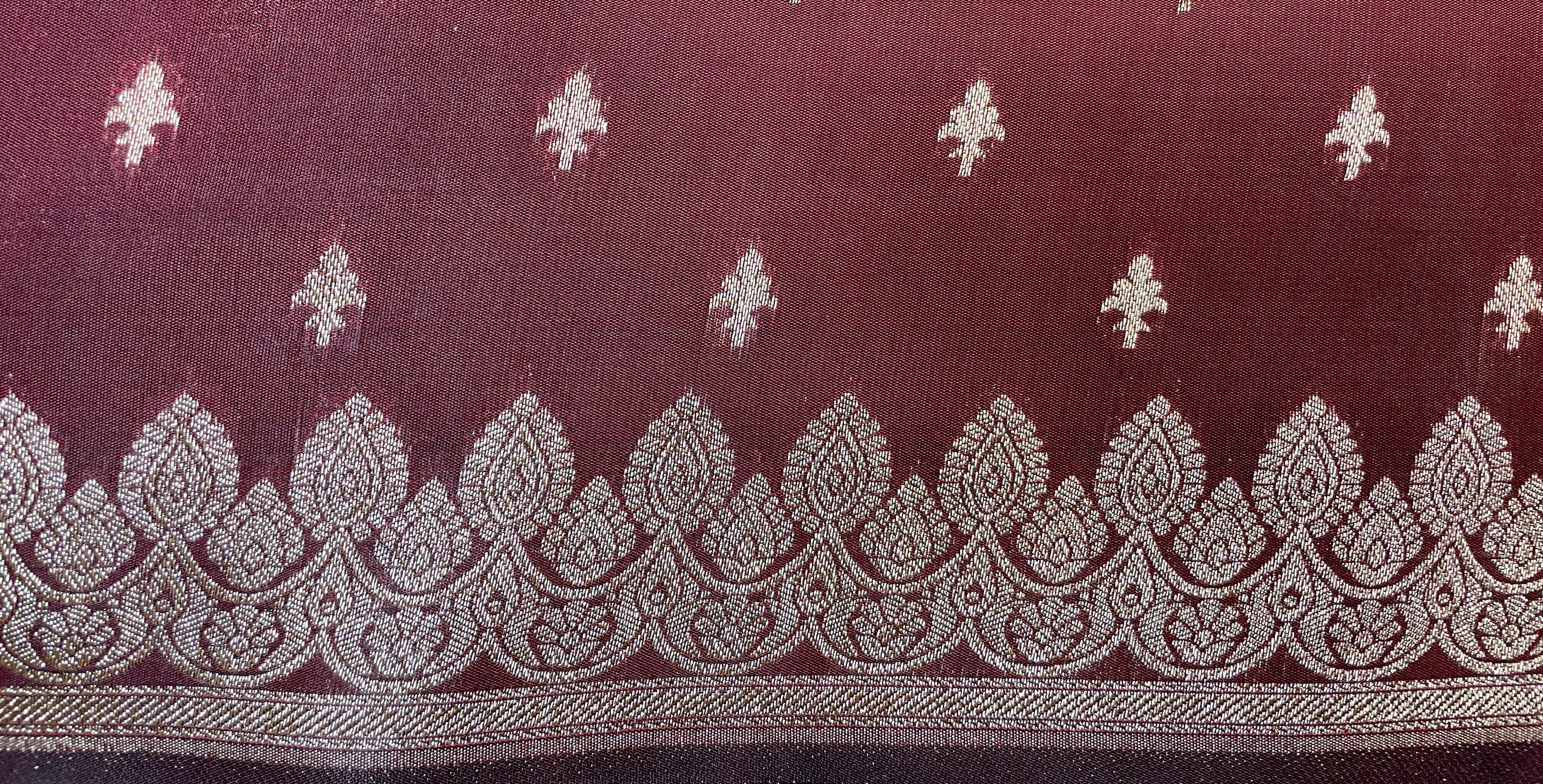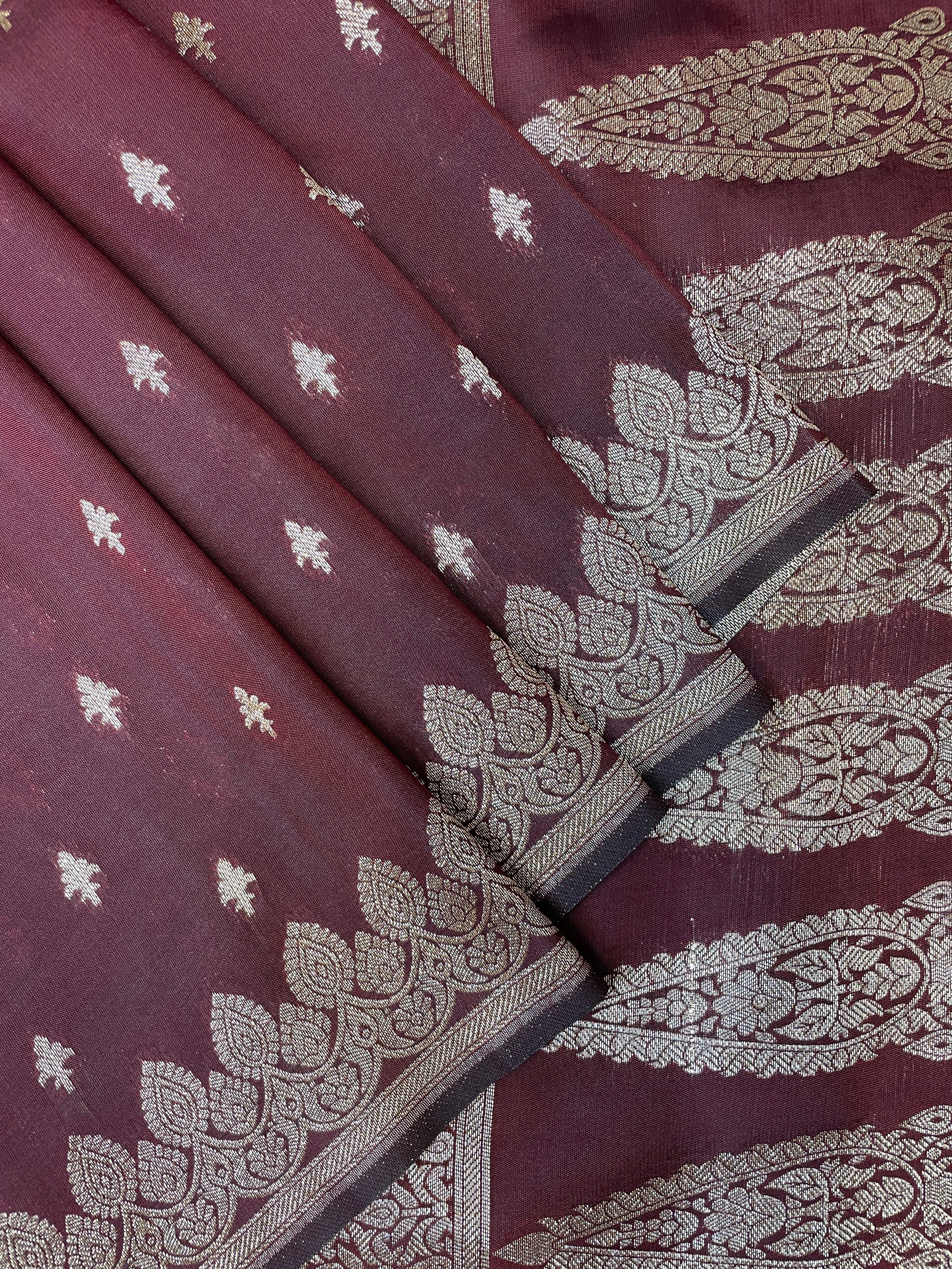 Brown Banaras Katan Viscose Saree with Silver Zari Floral Weaving And Grand Pallu B0541ds