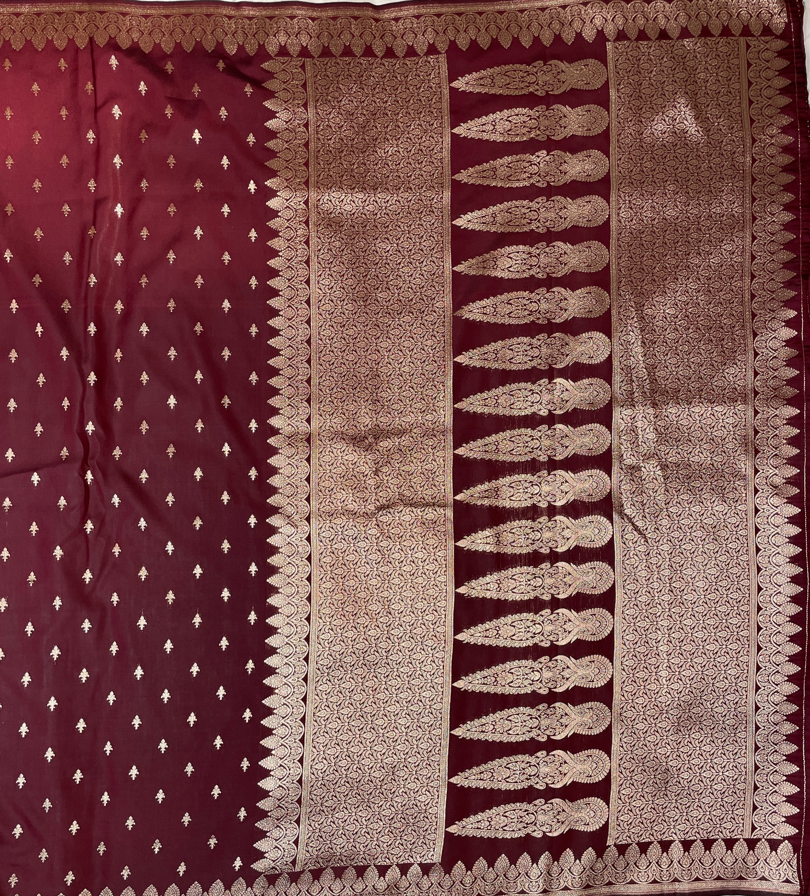 Drape yourself in timeless elegance with this exquisite emerald green Banarasi silk saree, adorned with delicate silver zari motifs throughout the body. The saree features an intricately woven floral and paisley border, complemented by a regal pallu with detailed brocade craftsmanship that reflects the rich heritage of Banaras. Perfect for weddings, festive occasions, and grand celebrations, this saree brings together tradition and luxury in every drape. The lustrous silk fabric adds a graceful fall and sheen, while the silver zari creates a stunning contrast that enhances its royal charm. For fabric care we advise dry clean