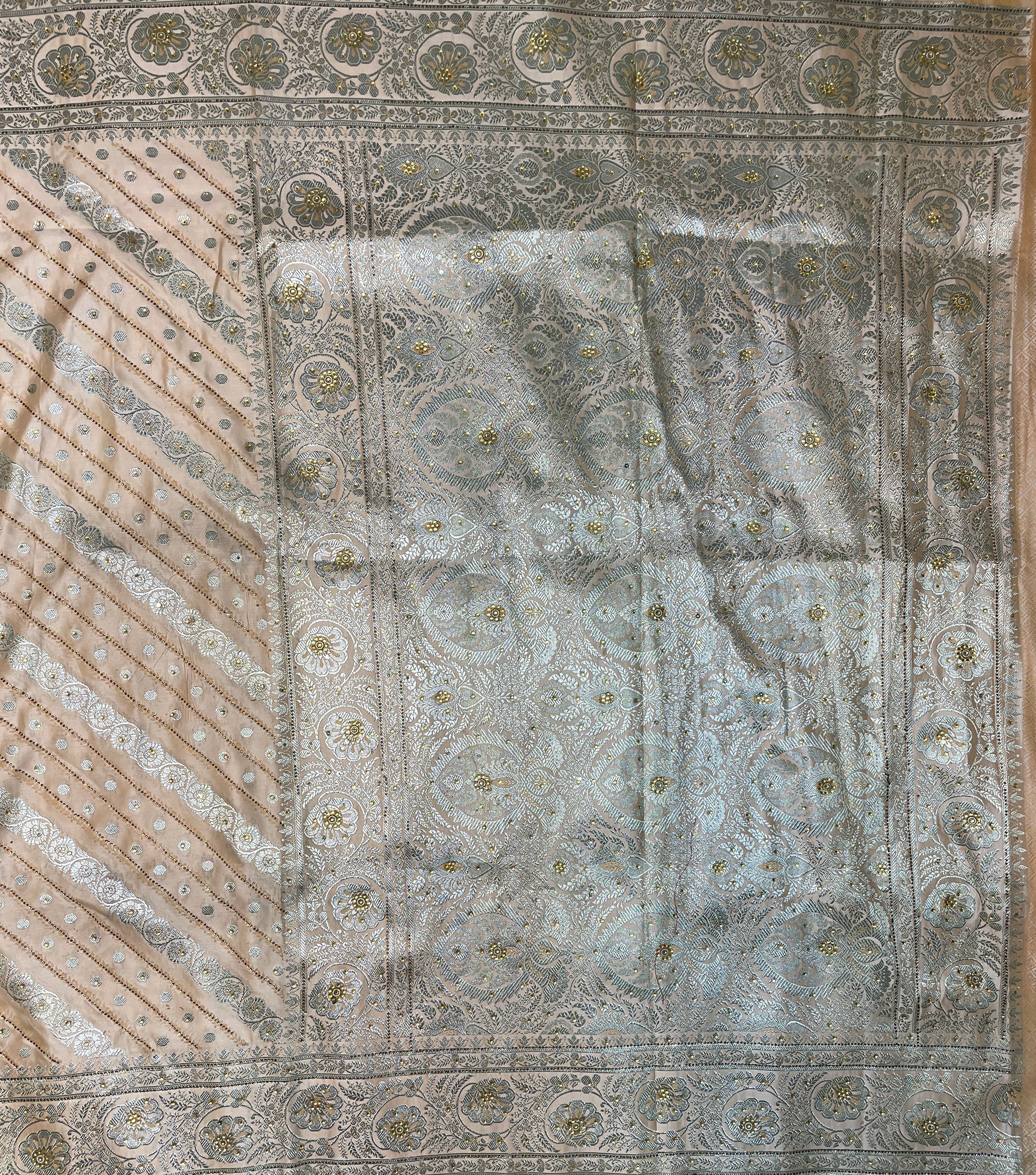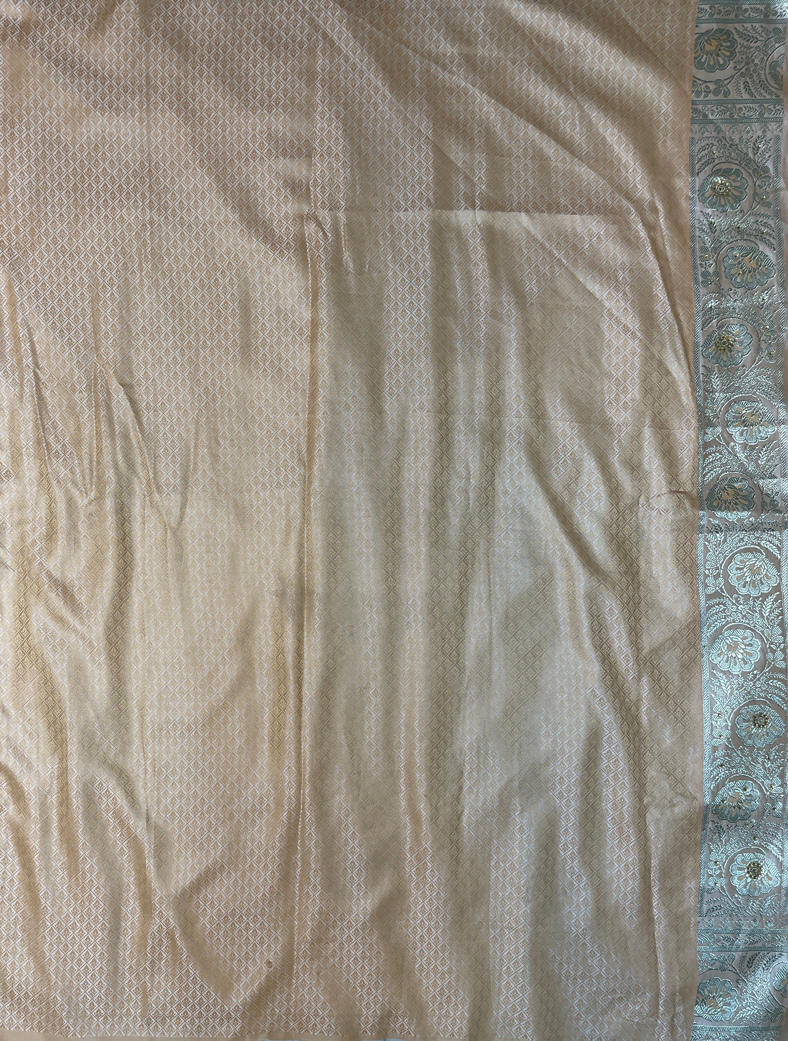 Cream Katan Banarasi Saree with Silver Zari Floral Weaving And Grand Pallu B0594ds