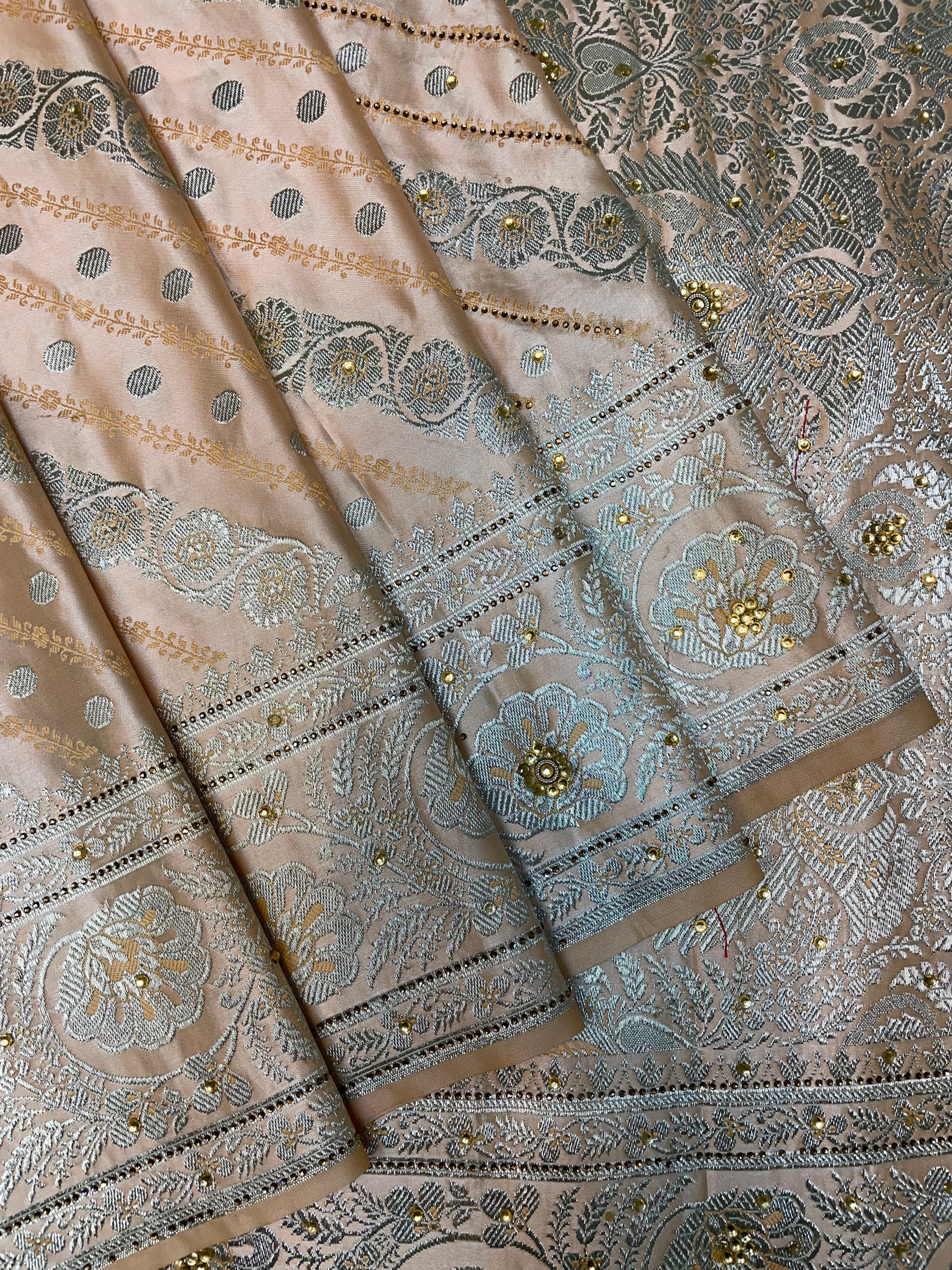 Drape yourself in timeless elegance with this exquisite emerald green Banarasi silk saree, adorned with delicate silver zari motifs throughout the body. The saree features an intricately woven floral and paisley border, complemented by a regal pallu with detailed brocade craftsmanship that reflects the rich heritage of Banaras.Perfect for weddings, festive occasions, and grand celebrations, this saree brings together tradition and luxury in every drape. The lustrous silk fabric adds a graceful fall and sheen, while the silver zari creates a stunning contrast that enhances its royal charm.