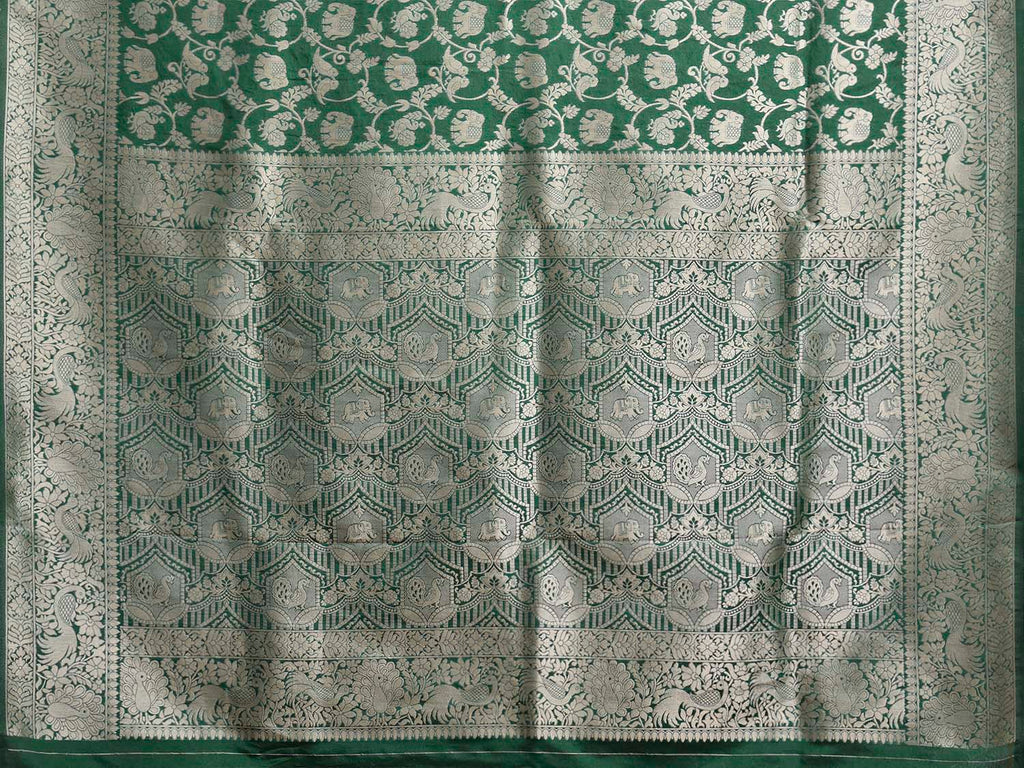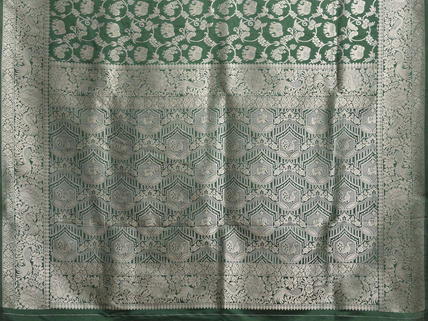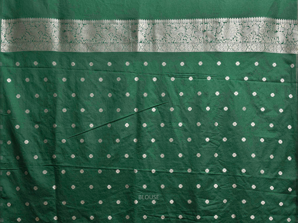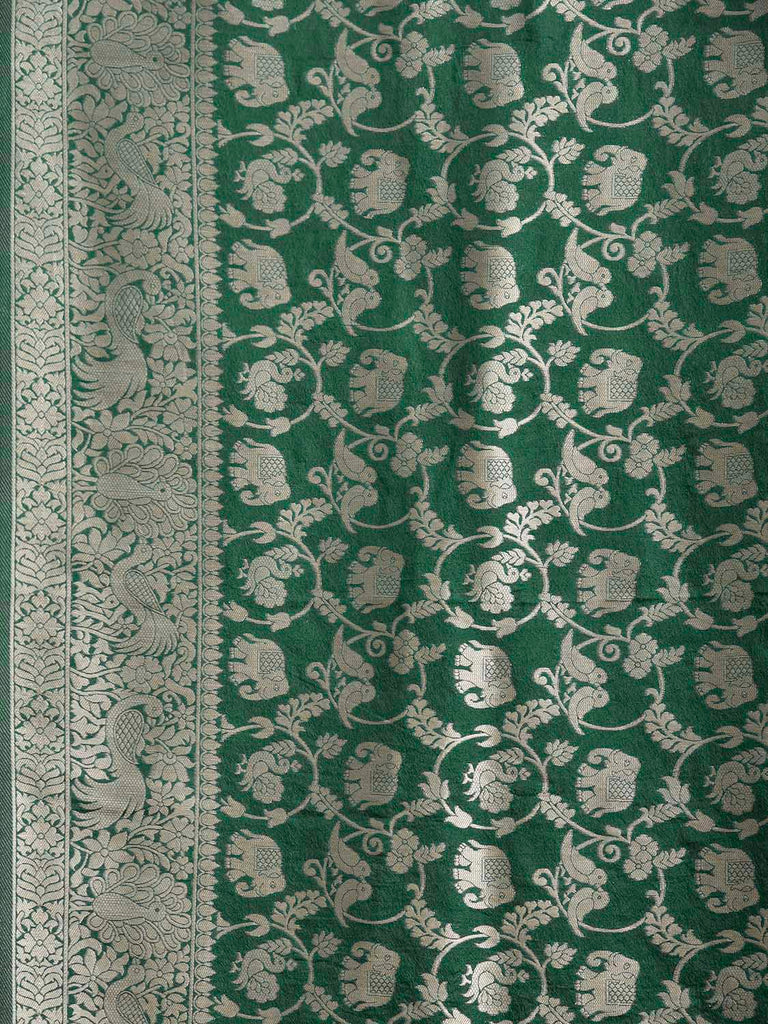 Green Banaras Katan Viscose Saree with All Over and Border Design. Banaras Sarees are considered one of finest sarees with gold or silver zari work, and colorful design makes it the saree for various occassions. For fabric care we advise dry clean.