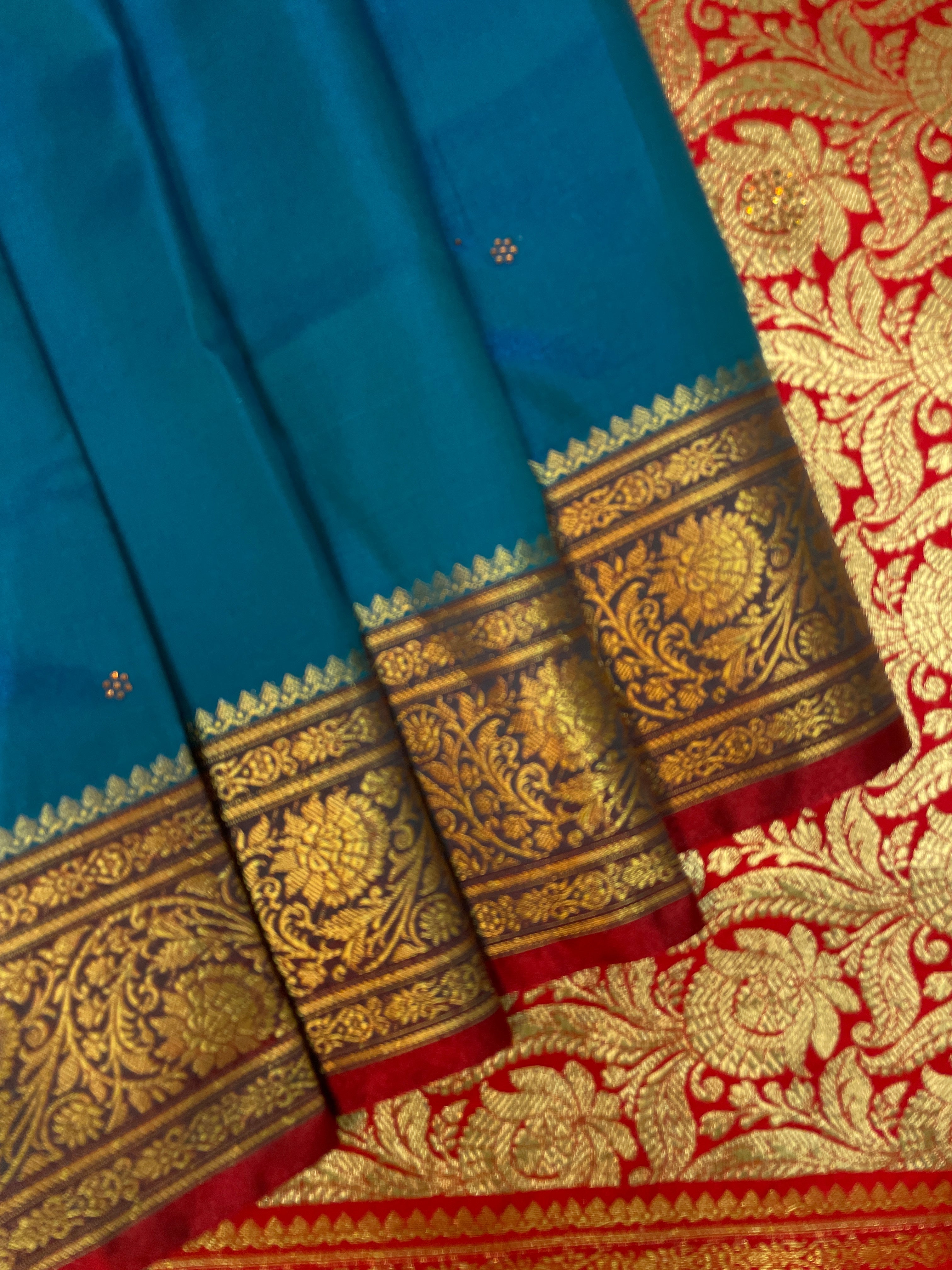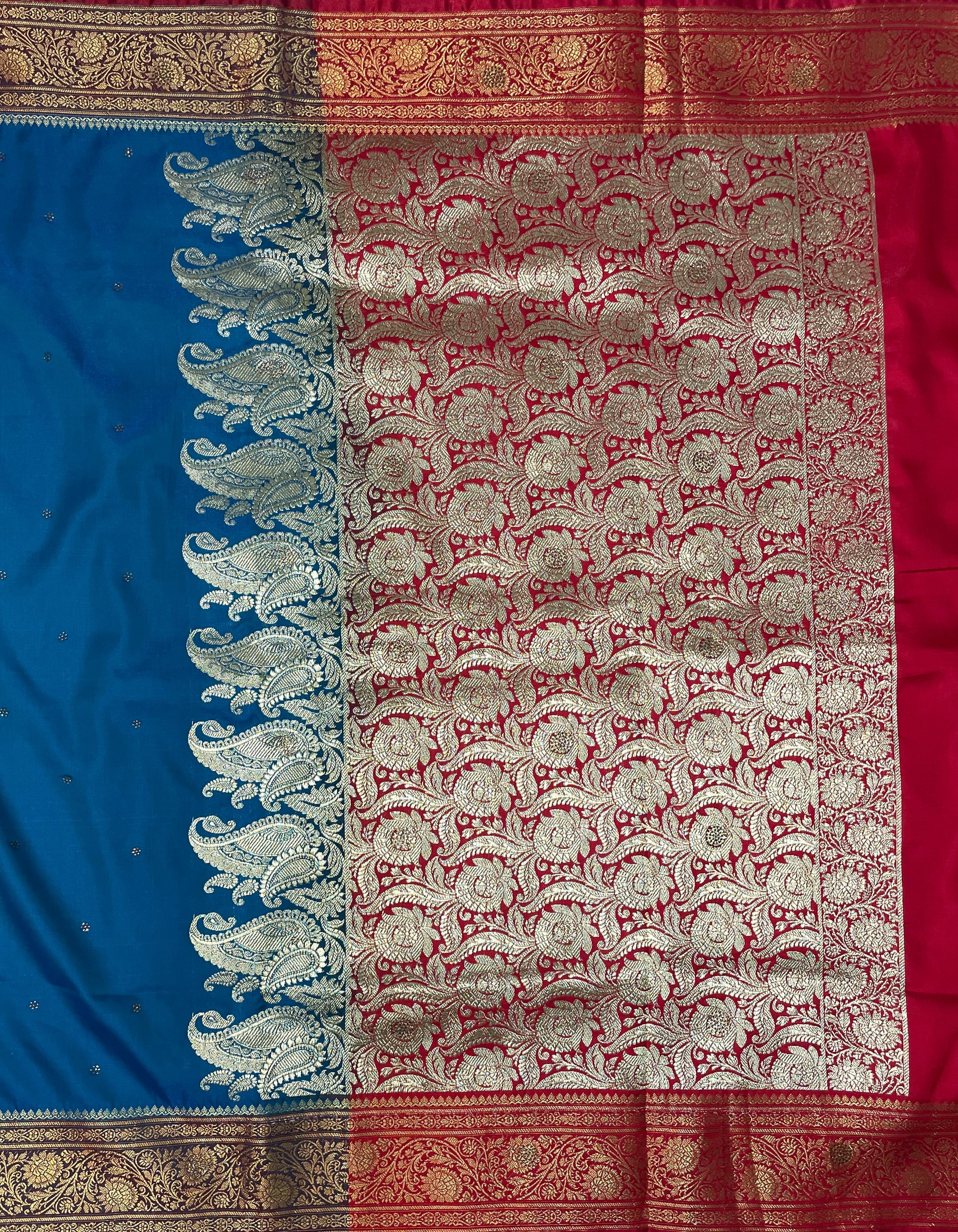Light Blue And Red Katan Banarasi Saree with Silver Zari Floral Weaving And Grand Pallu B0616ds