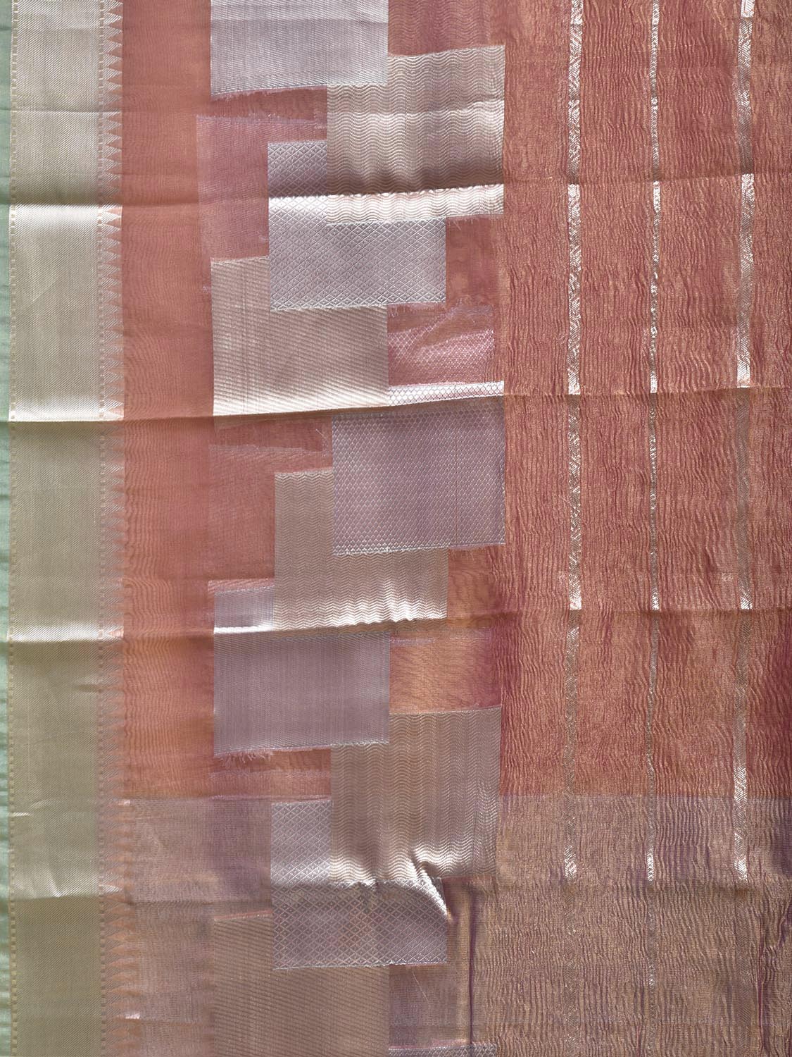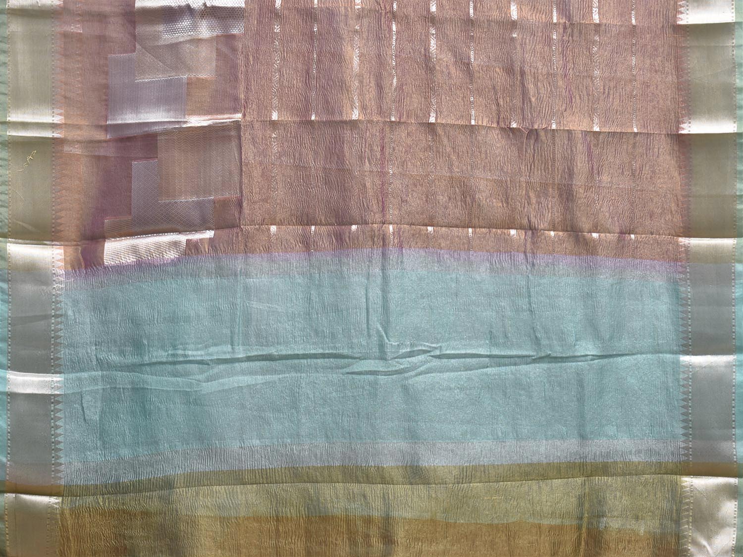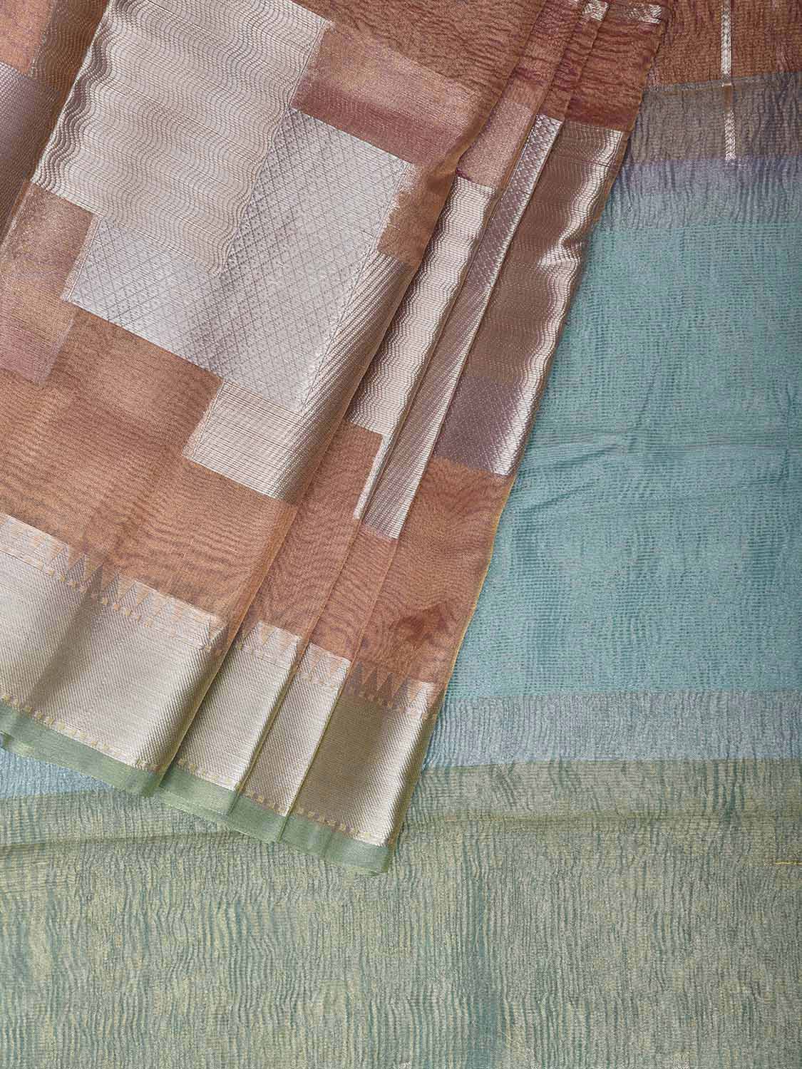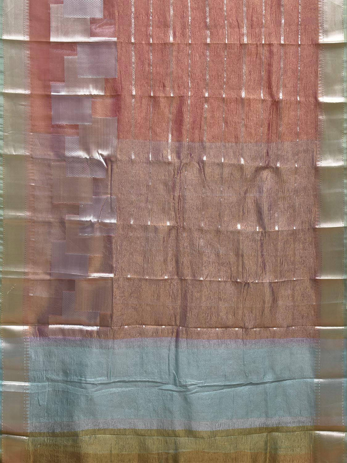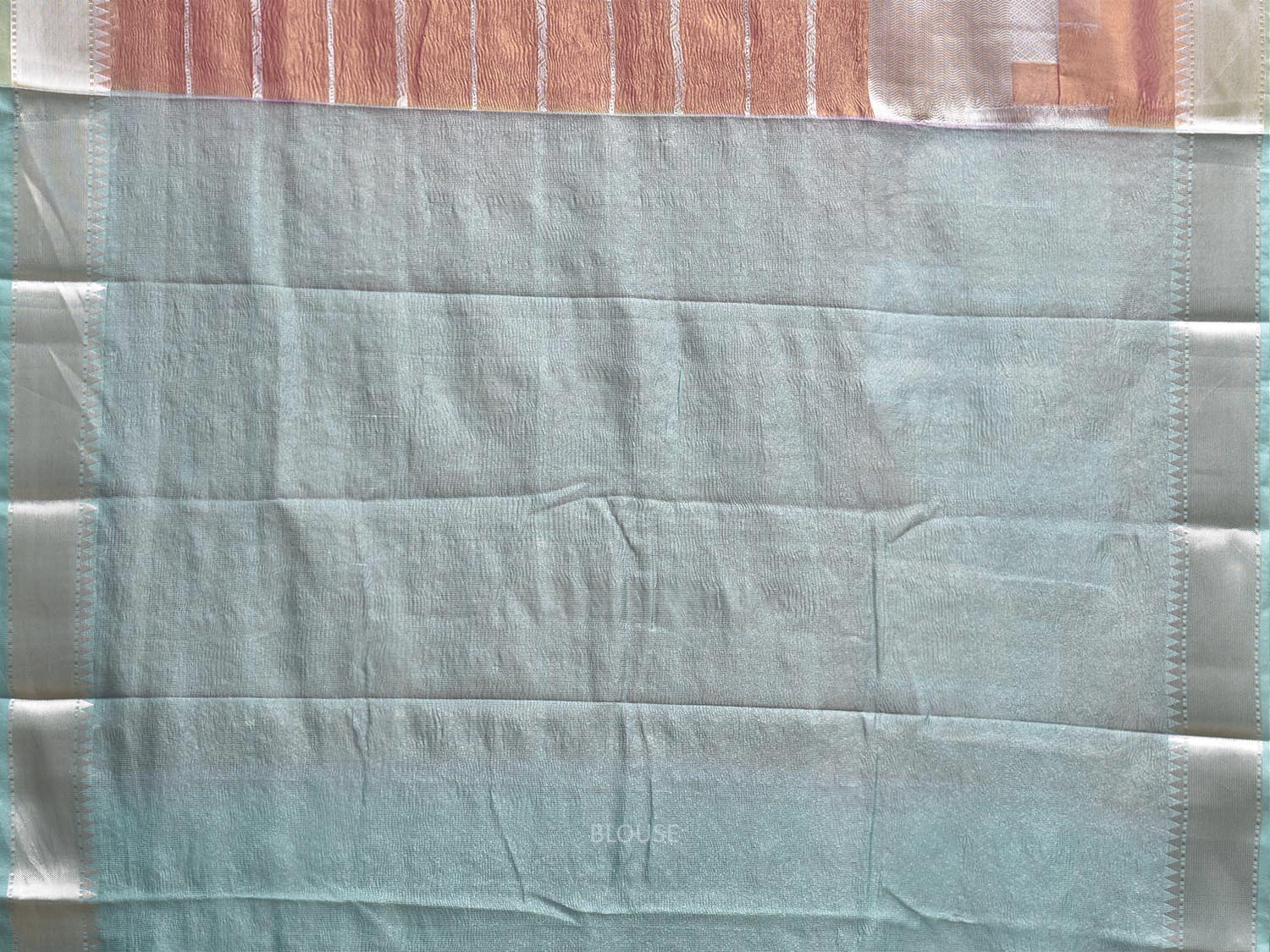Peach and Light Blue Banaras Tissue Saree with Strips Design. Banaras Sarees are considered one of finest sarees with gold or silver zari work, and colorful design makes it the saree for various occassions. For fabric care we advise dry clean.