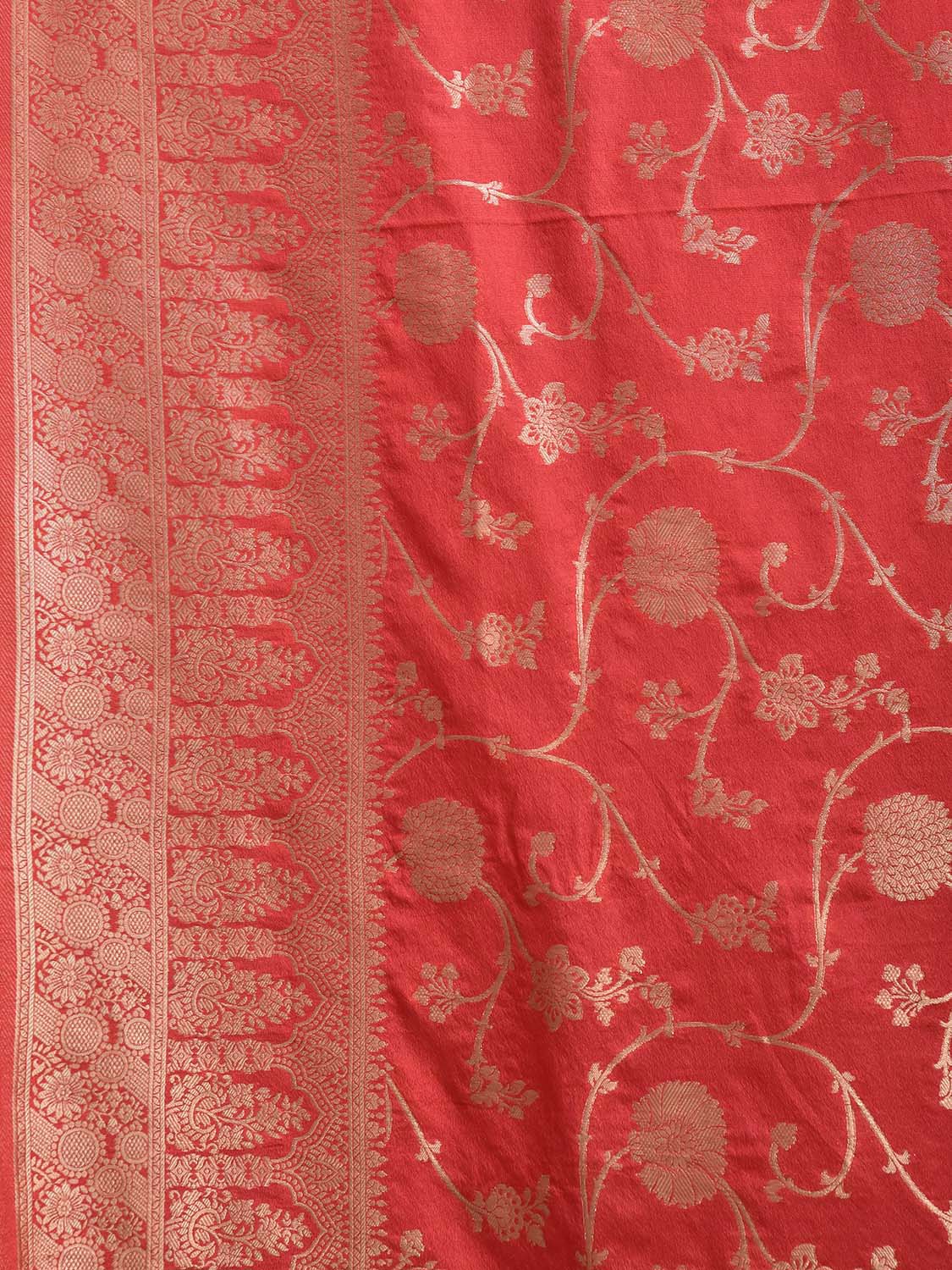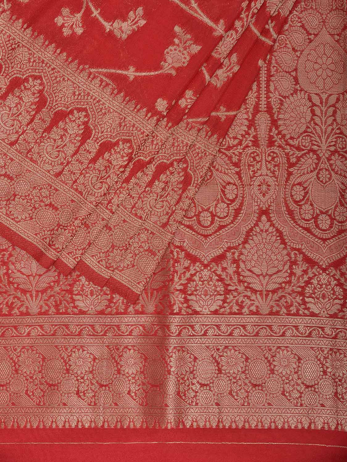 Red Banaras Viscose Silk Saree with Floral Body and Pallu Design. Banaras Sarees are considered one of finest sarees with gold or silver zari work, and colorful design makes it the saree for various occassions. For fabric care we advise dry clean.