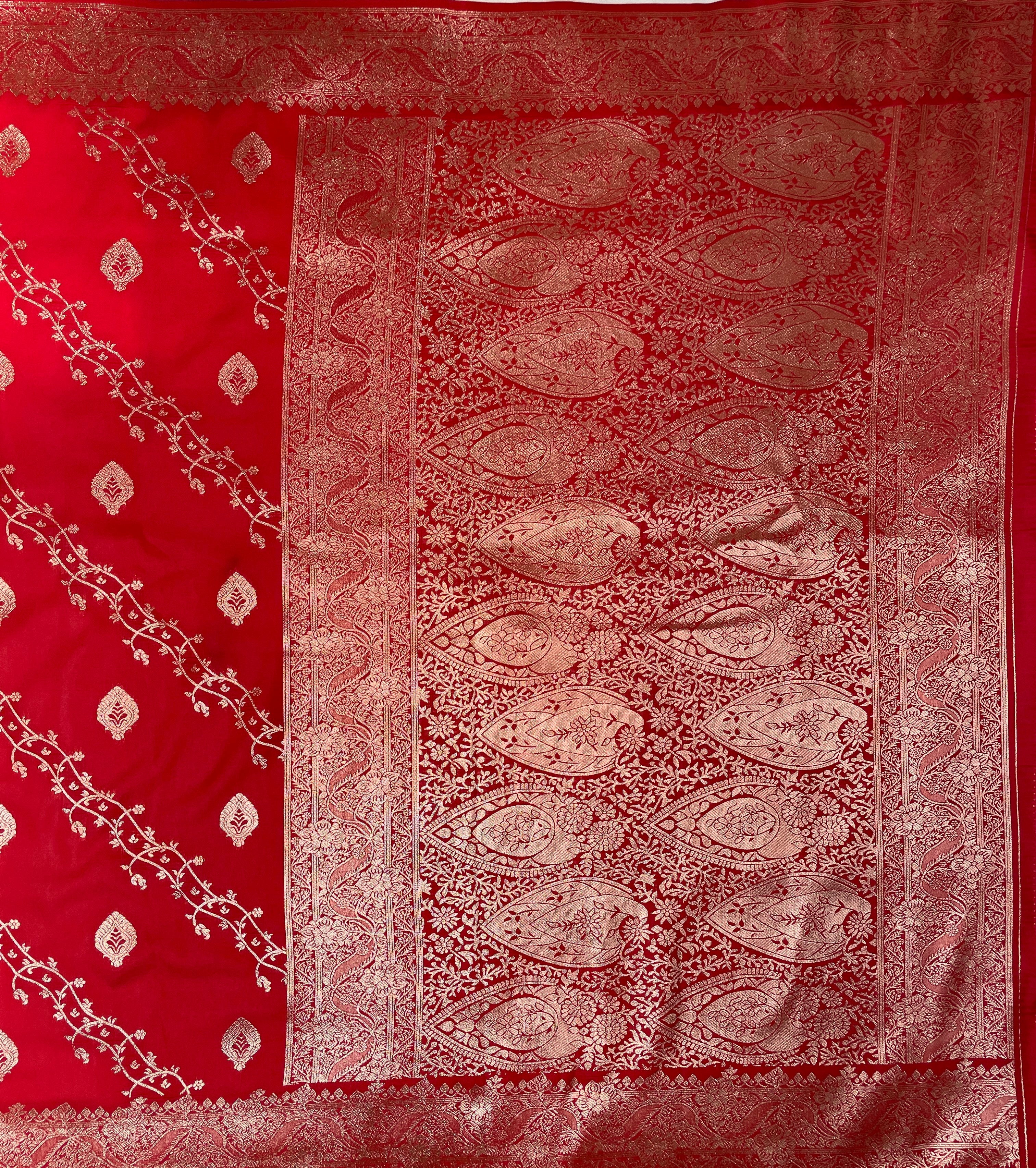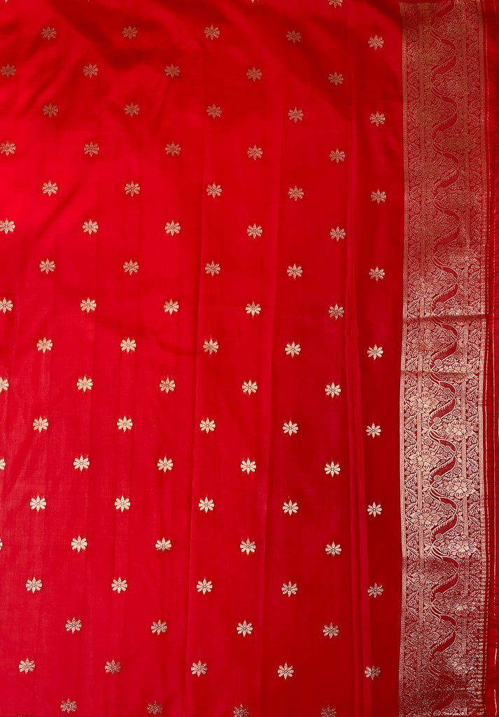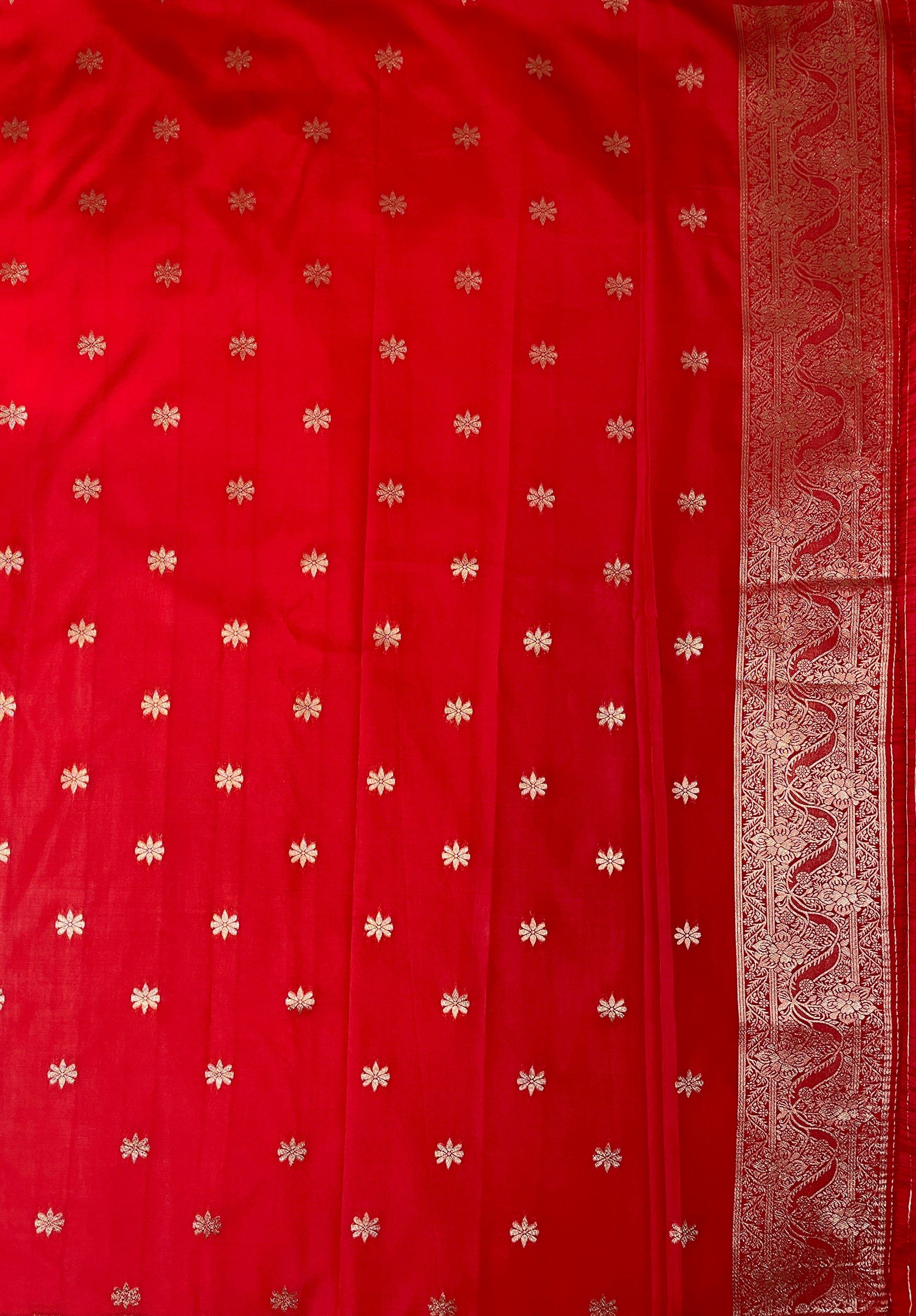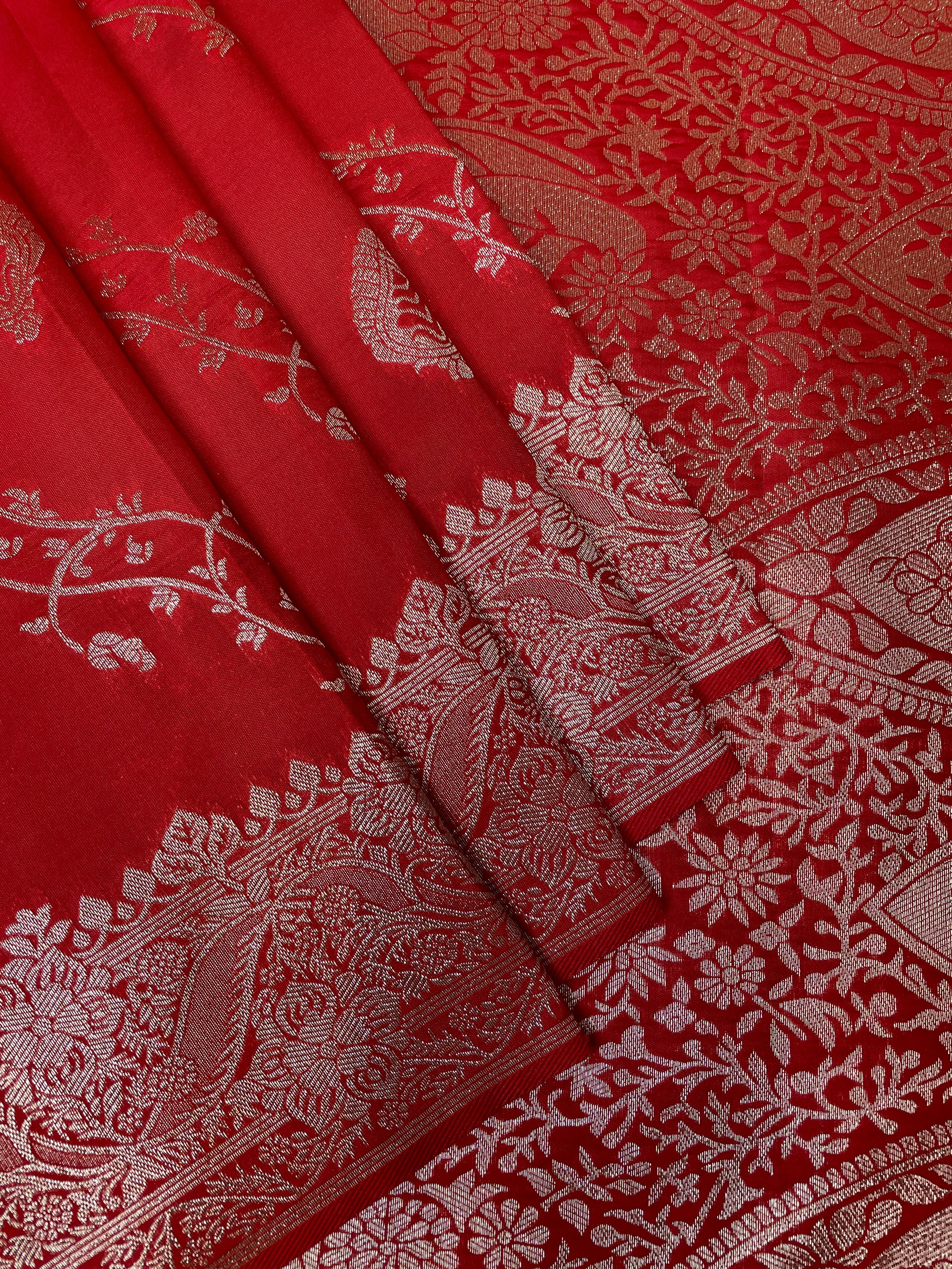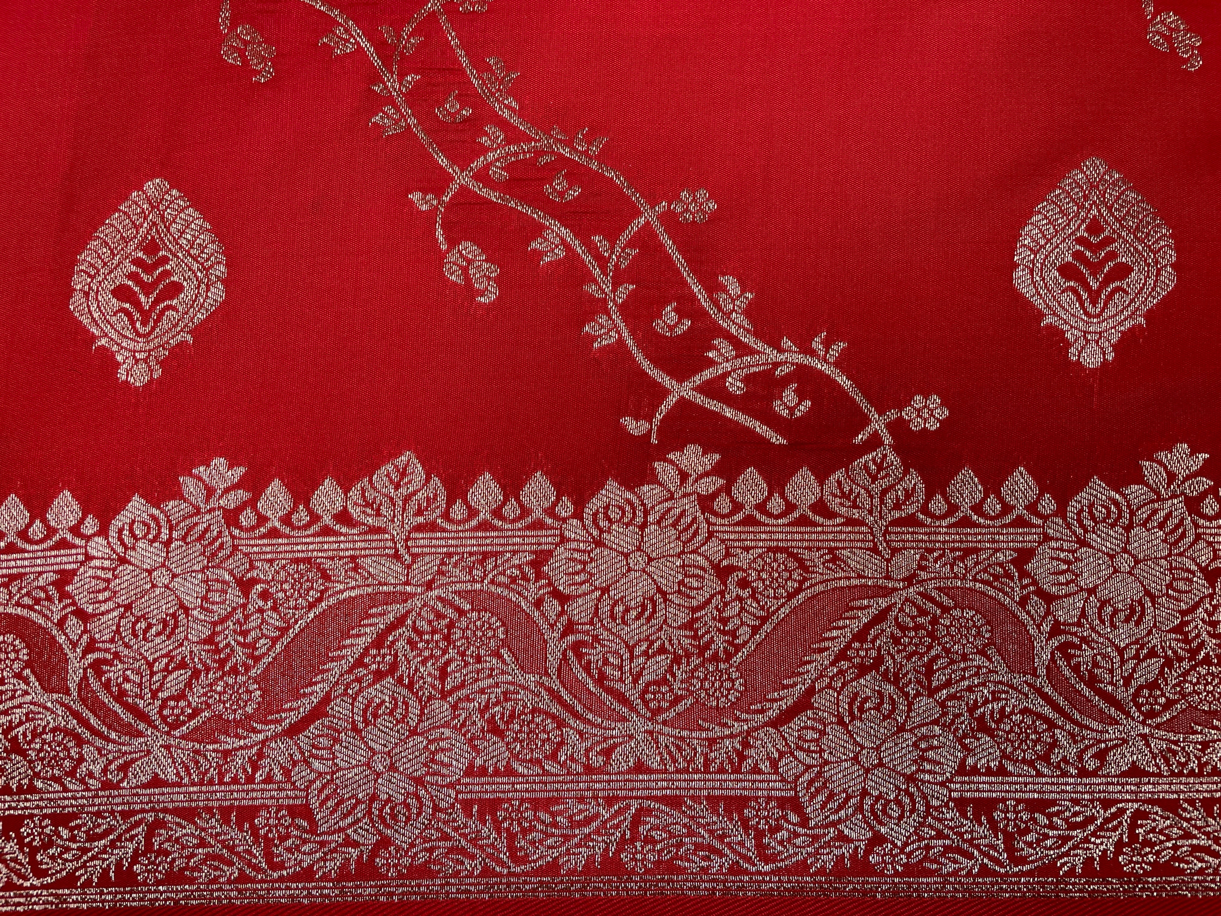 Red Banaras Viscose Katan Saree with Silver Zari Floral Weaving And Grand Pallu B0543ds