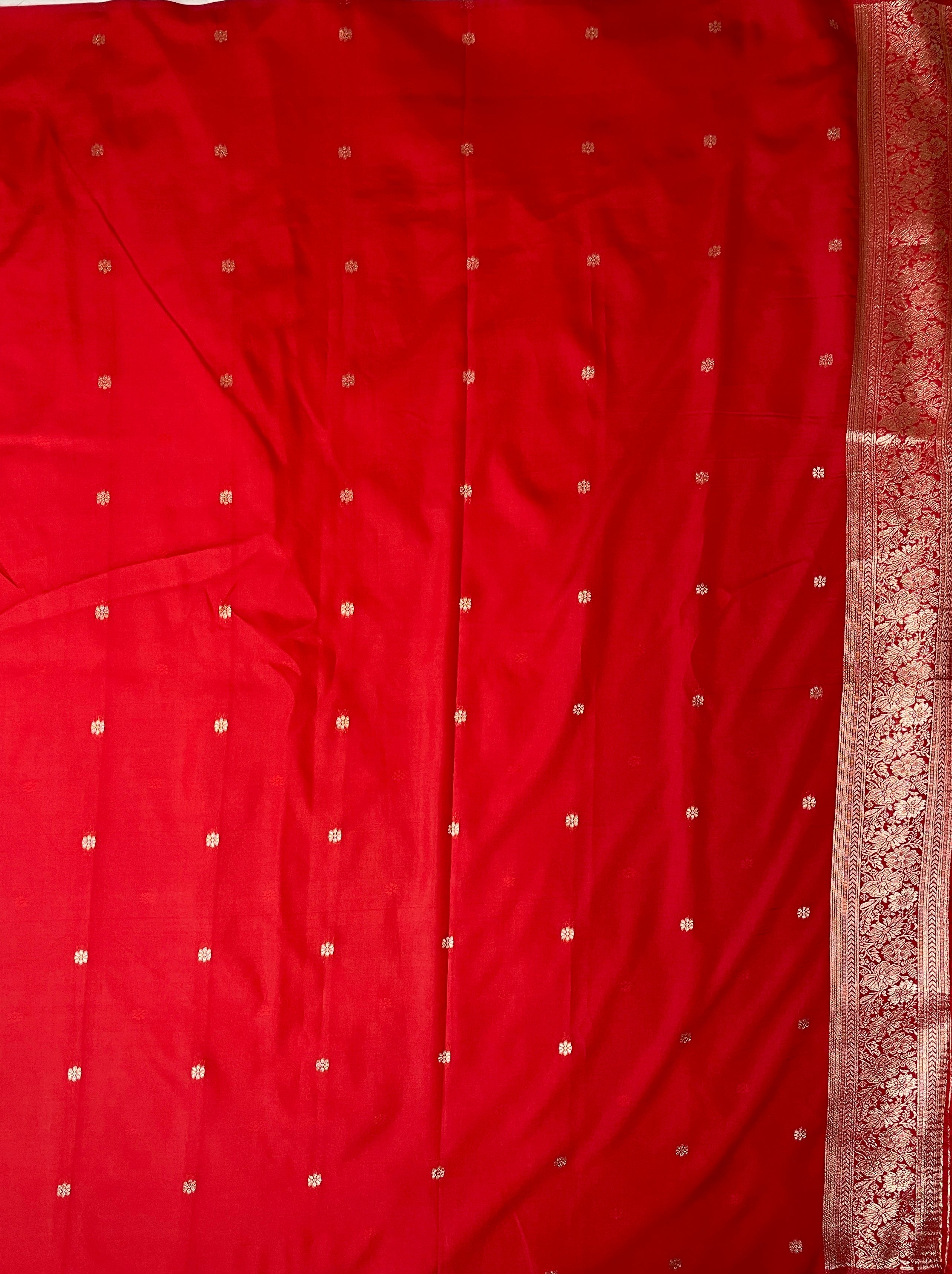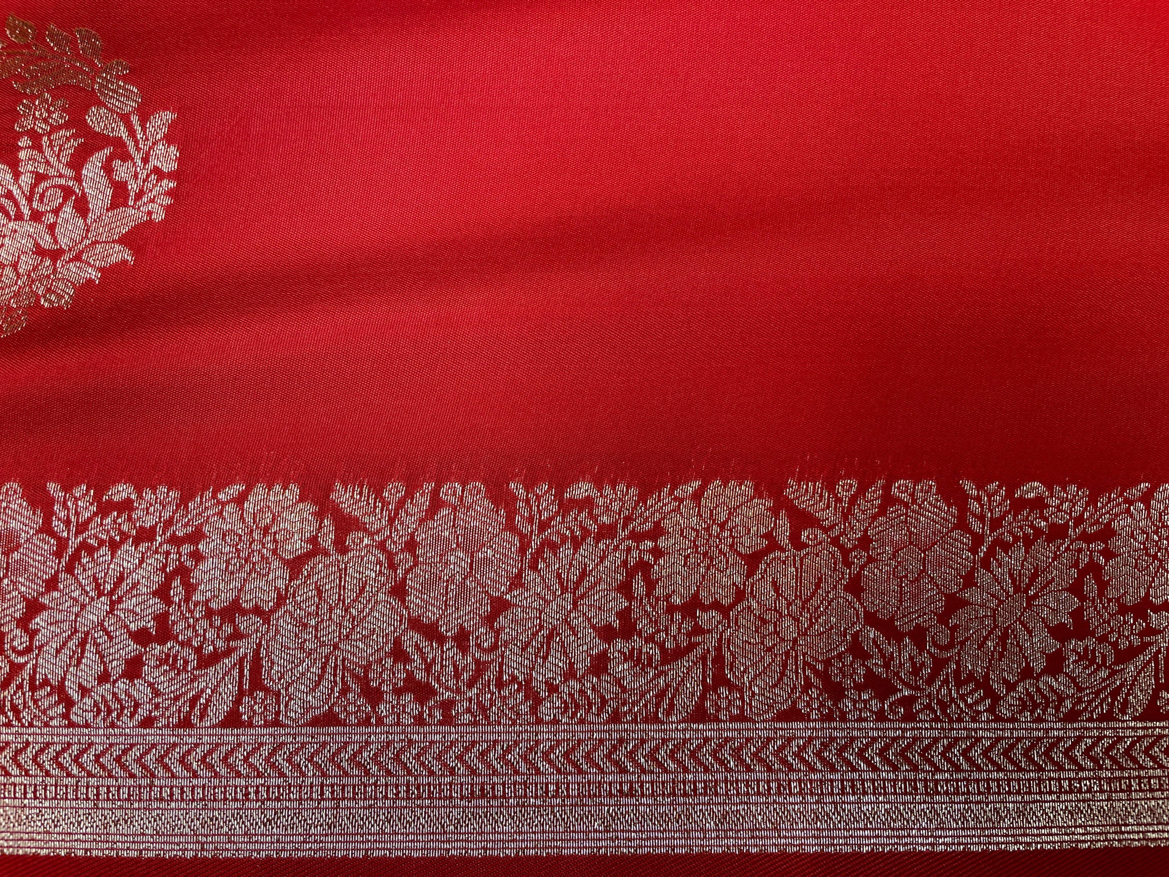Red Banaras Viscose Katan Saree with Silver Zari Floral Weaving And Grand Pallu B0550ds