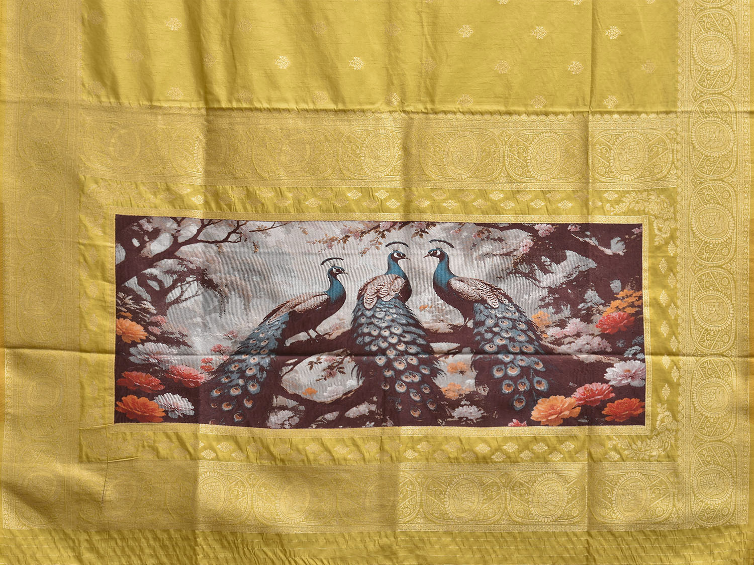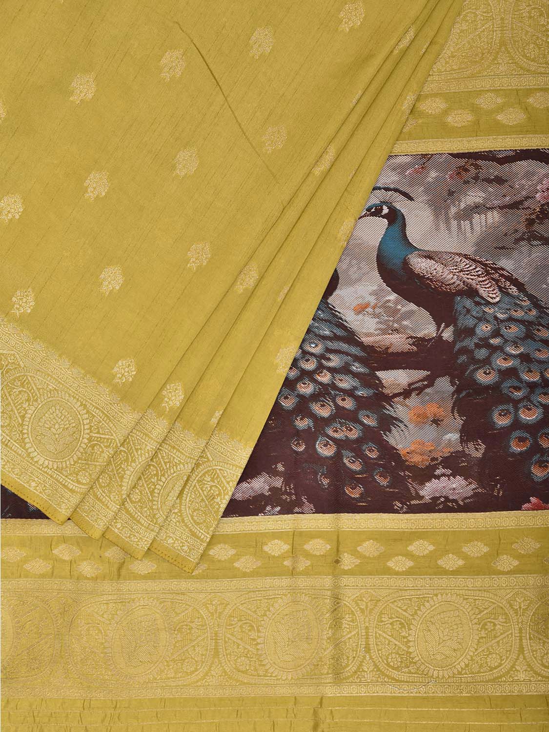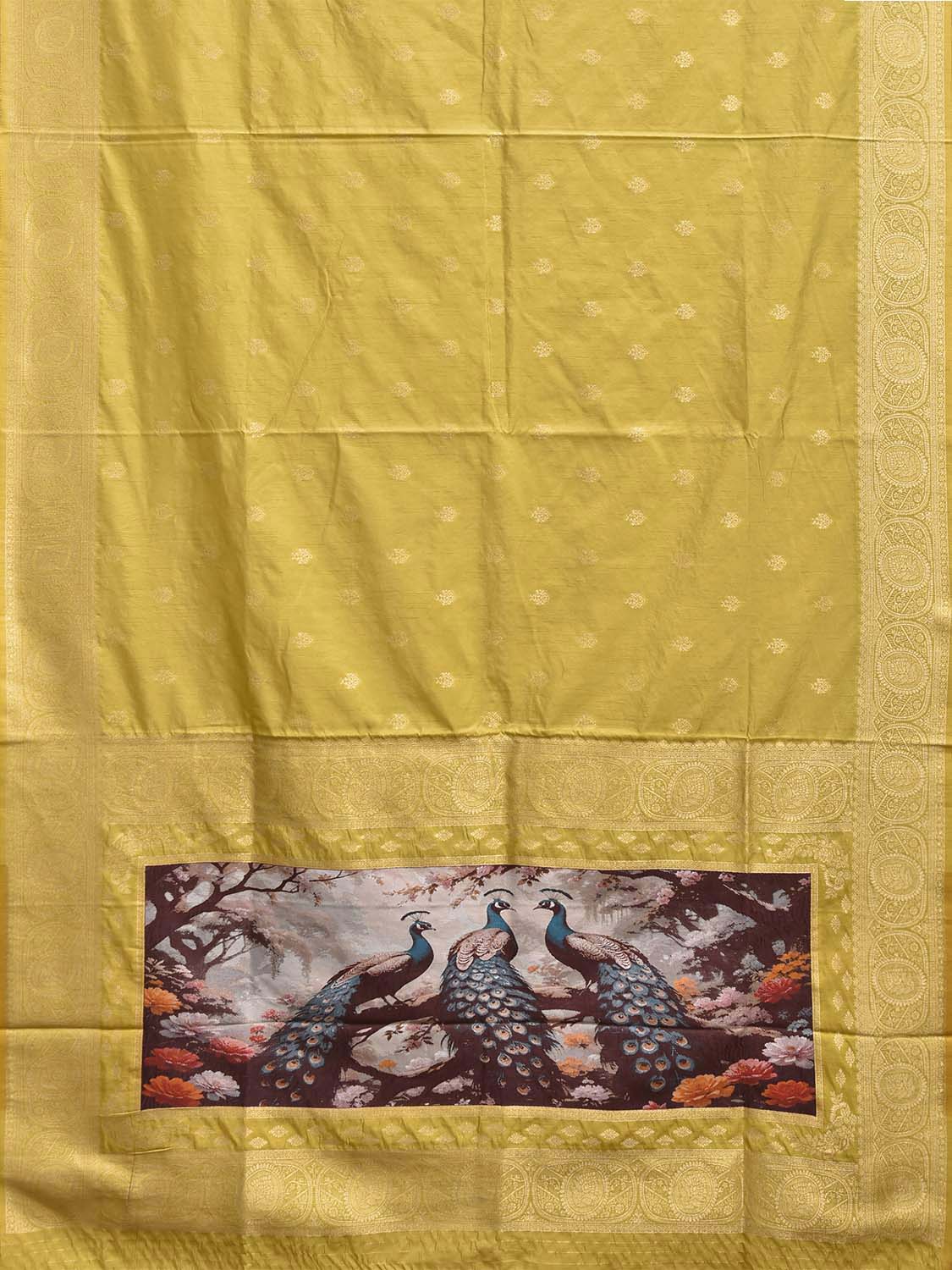 Yellow Banaras Katan Viscose Saree with Peacocks Pallu and Border Design. Banaras Sarees are considered one of finest sarees with gold or silver zari work, and colorful design makes it the saree for various occassions. For fabric care we advise dry clean.