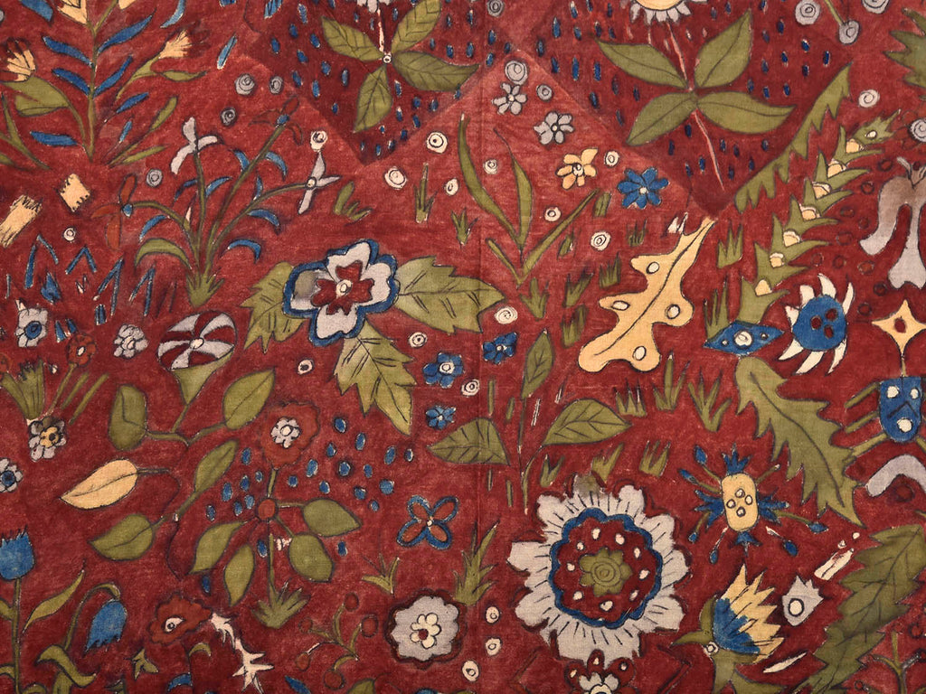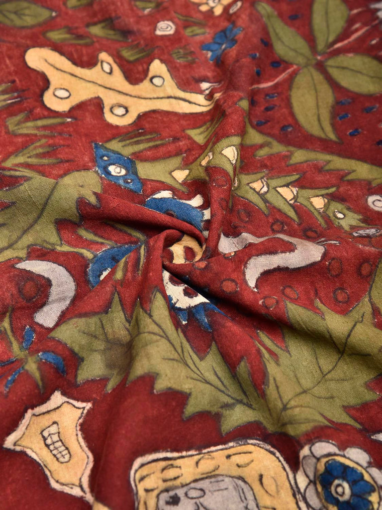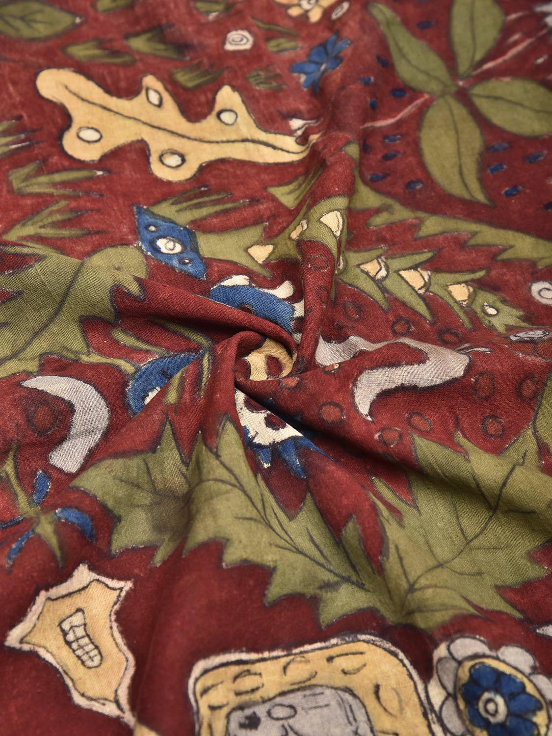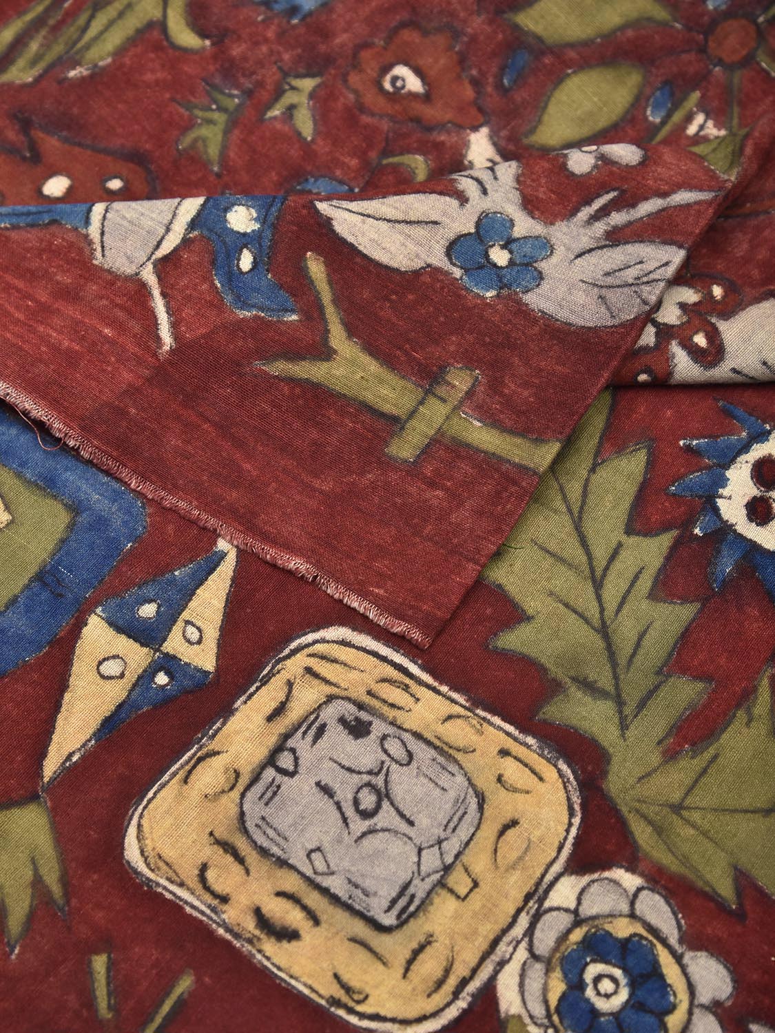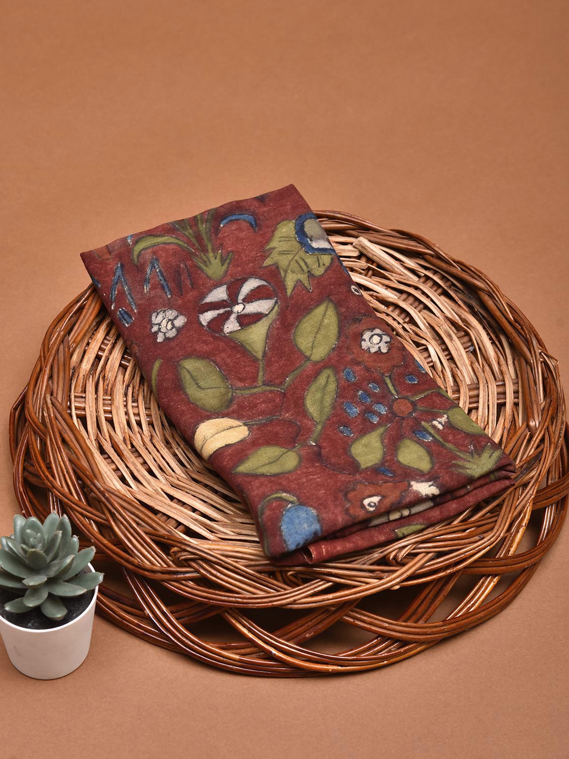 Dark Red Kalamkari Hand Painted Sico Blouse with Big Floral Design 1mt Length 35 Inches Width. This hand painted kalamkari is done using natural dyes. As they are natural colors they bleed with initial washes, so we suggest Dry clean.