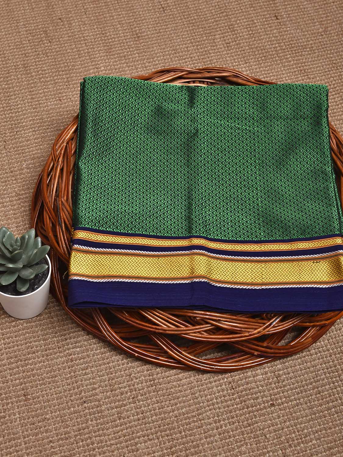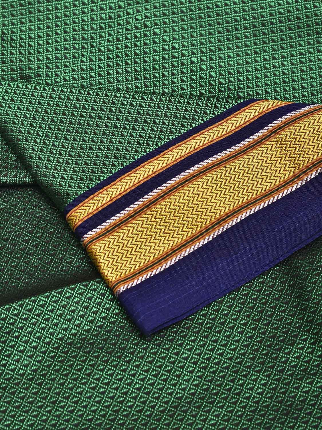 Green and Dark Blue Jacquard Viscose Blouse with Contrast Border Design Length 1mt Width 31 Inches. Beautiful Pattern Blouse Fabric and Easy to Match to Any Suitable Saree. We Advise Gentle Handwash for Fabric Care.