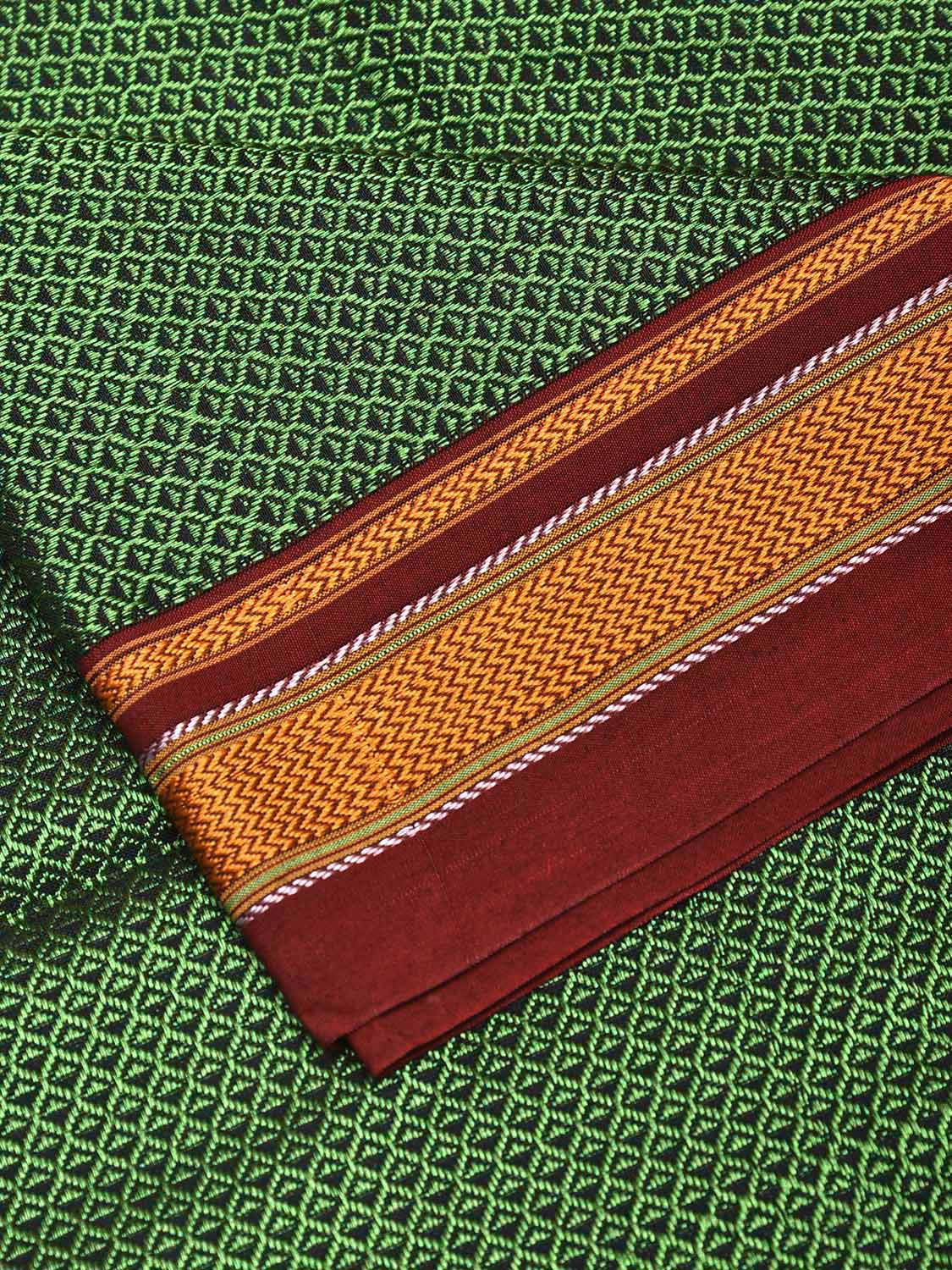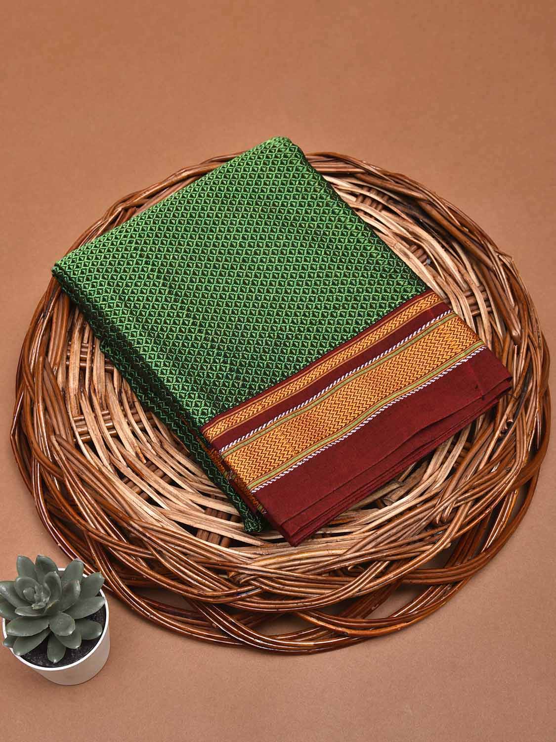 Green and Dark Red Jacquard Viscose Blouse with Contrast Border Design Length 1mt Width 31 Inches. Beautiful Pattern Blouse Fabric and Easy to Match to Any Suitable Saree. We Advise Gentle Handwash for Fabric Care.
