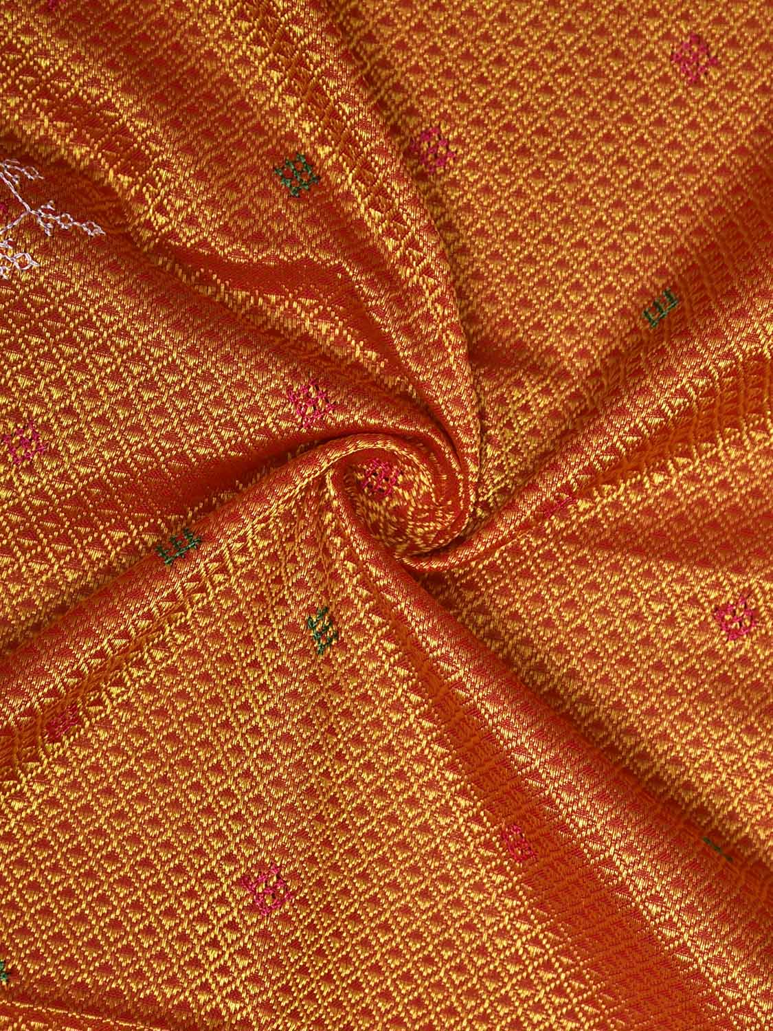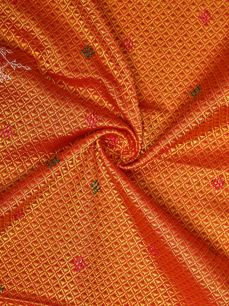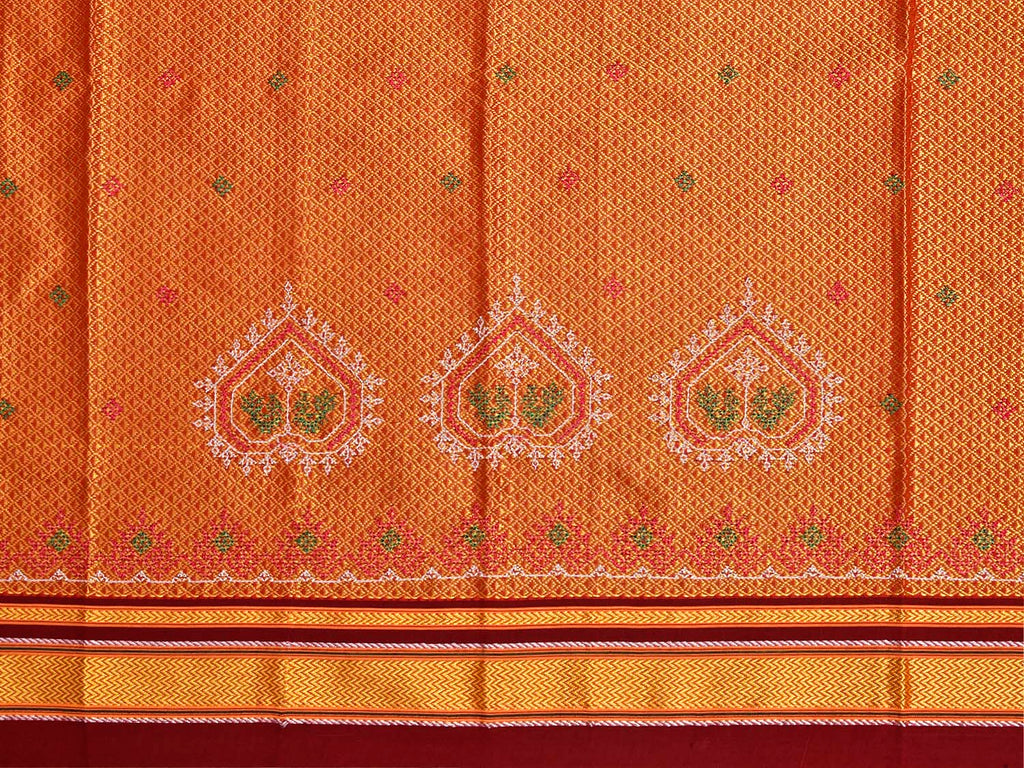 Orange and Dark Red Jacquard Viscose Bloue with Kasuti Work Design Length 1mt Width 36 Inches. Beautiful Pattern Blouse Fabric and Easy to Match to Any Suitable Saree. We Advise Gentle Handwash for Fabric Care.