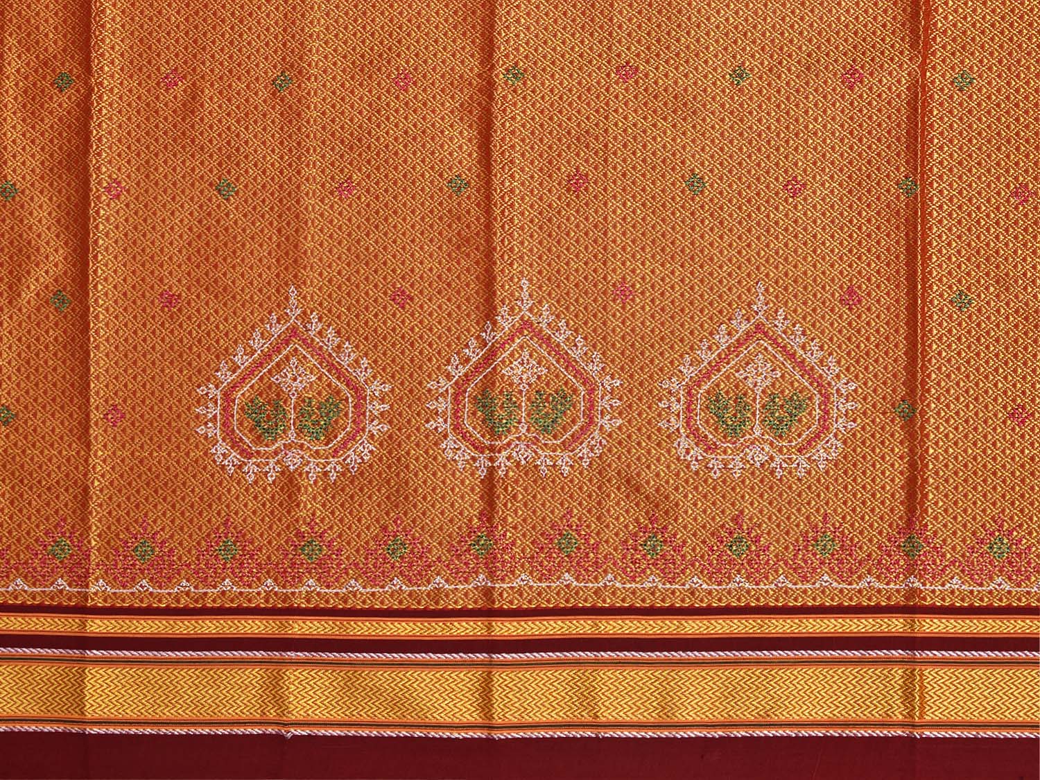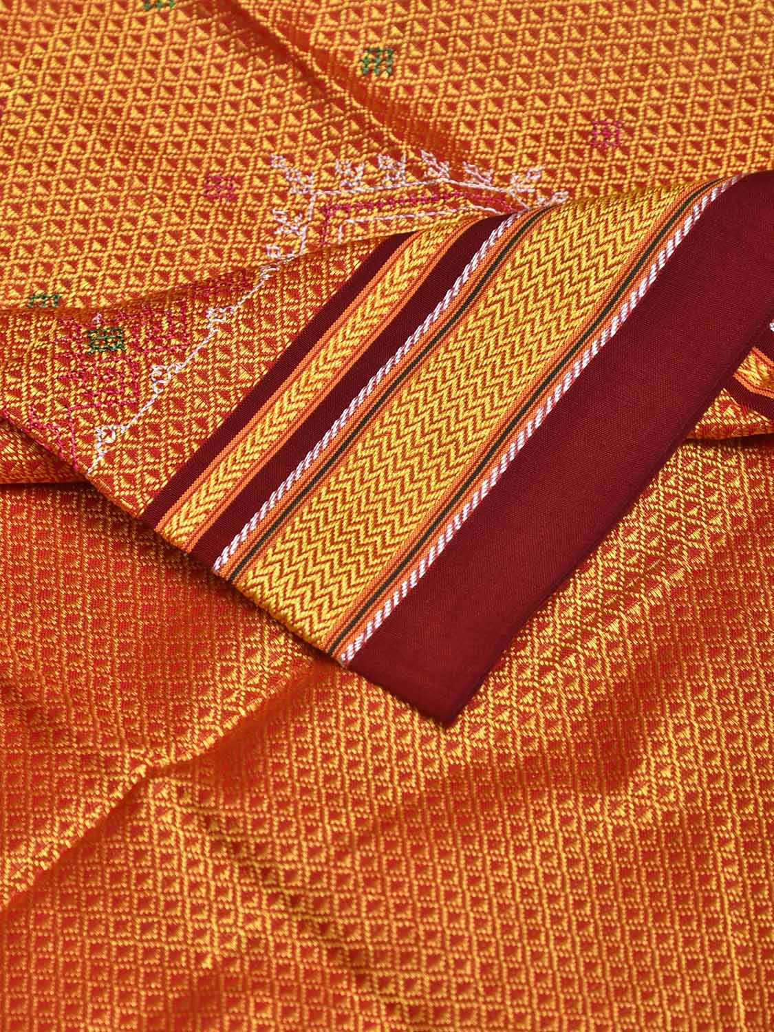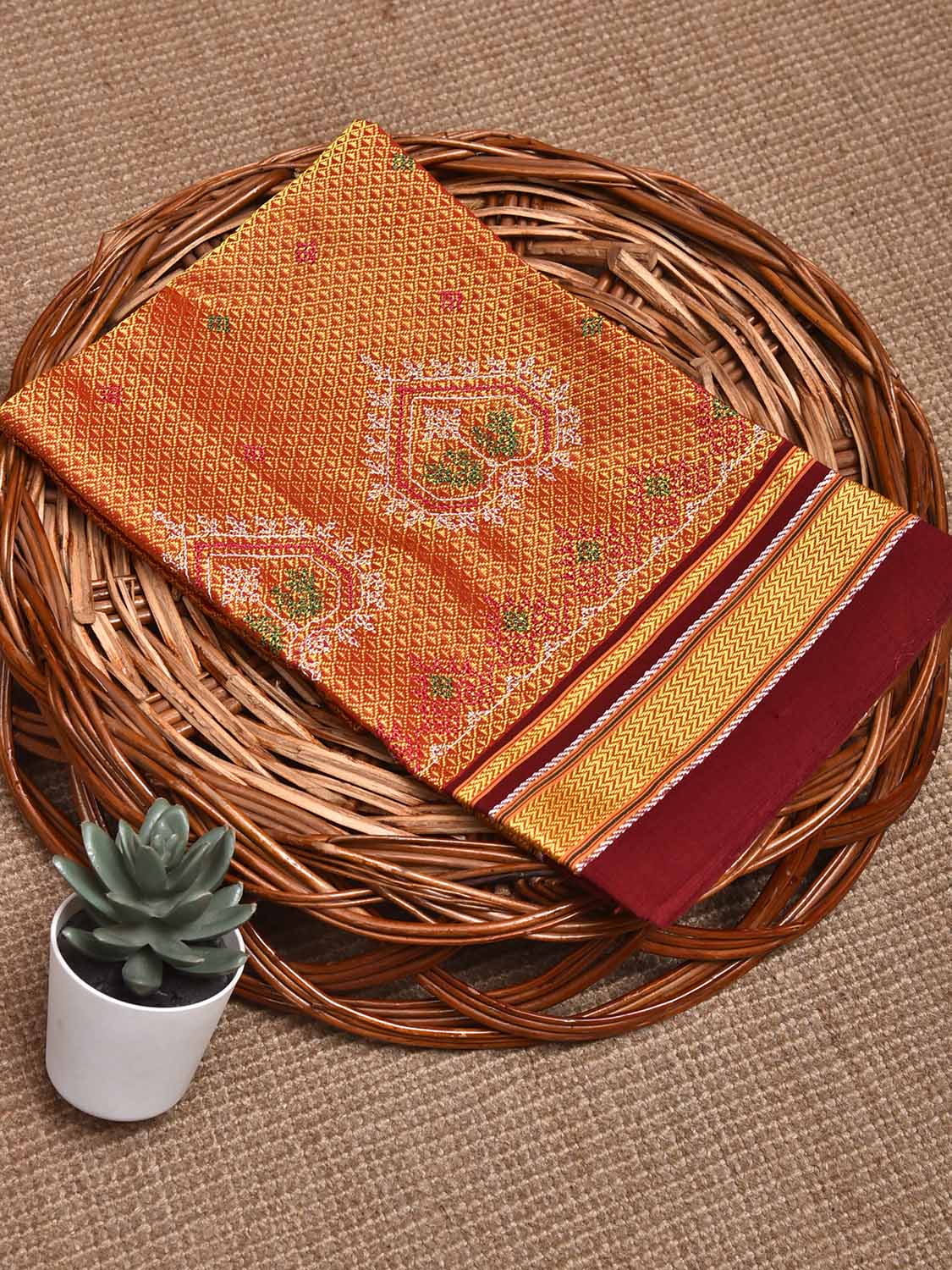 Orange and Dark Red Jacquard Viscose Bloue with Kasuti Work Design Length 1mt Width 36 Inches. Beautiful Pattern Blouse Fabric and Easy to Match to Any Suitable Saree. We Advise Gentle Handwash for Fabric Care.
