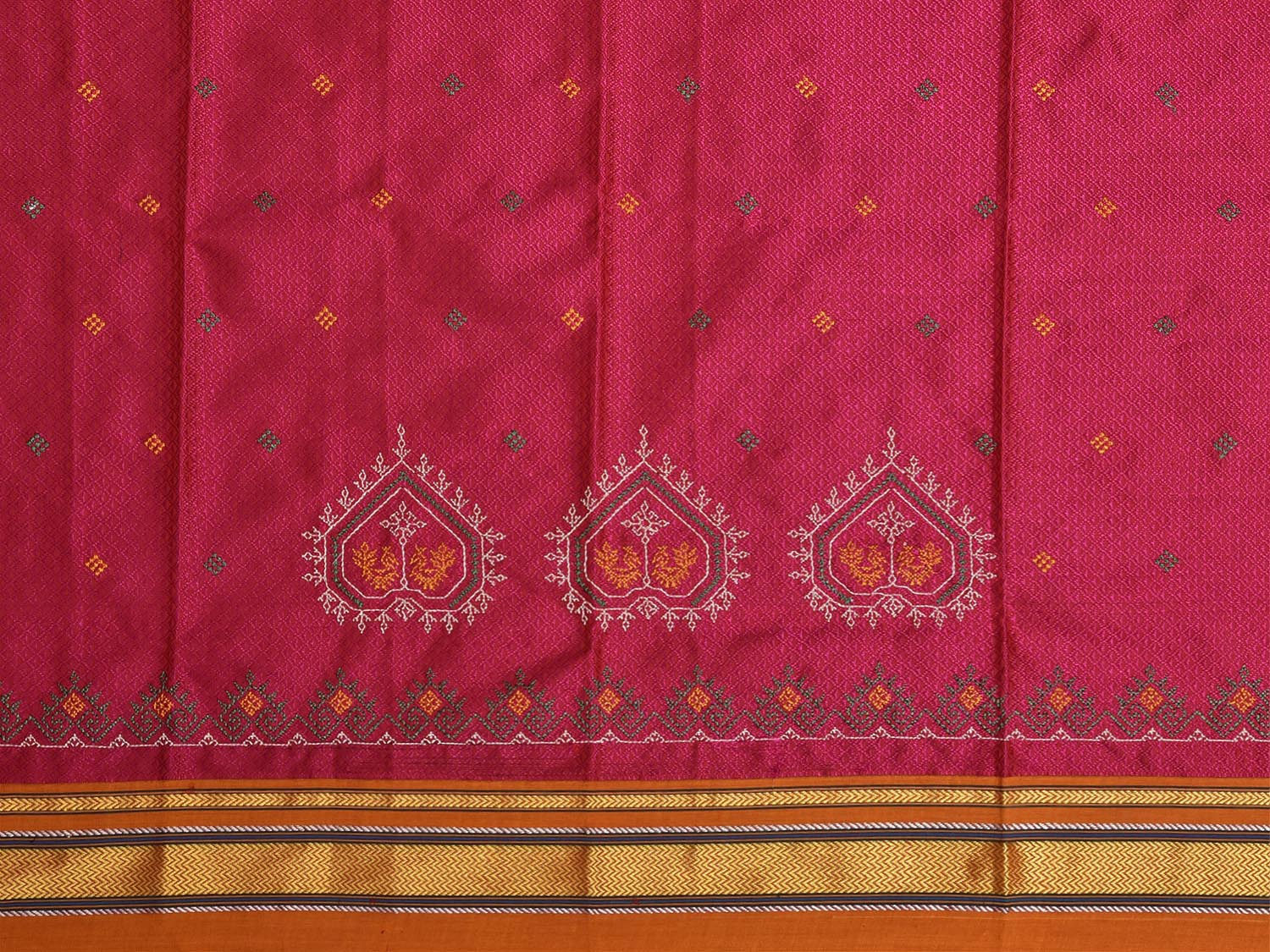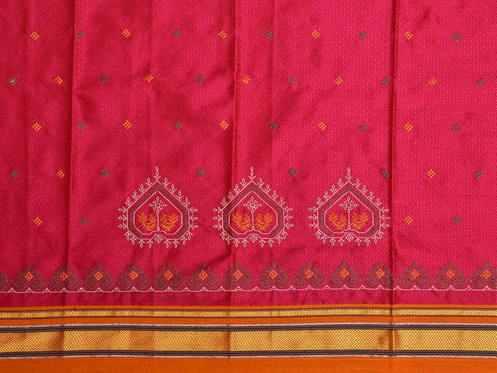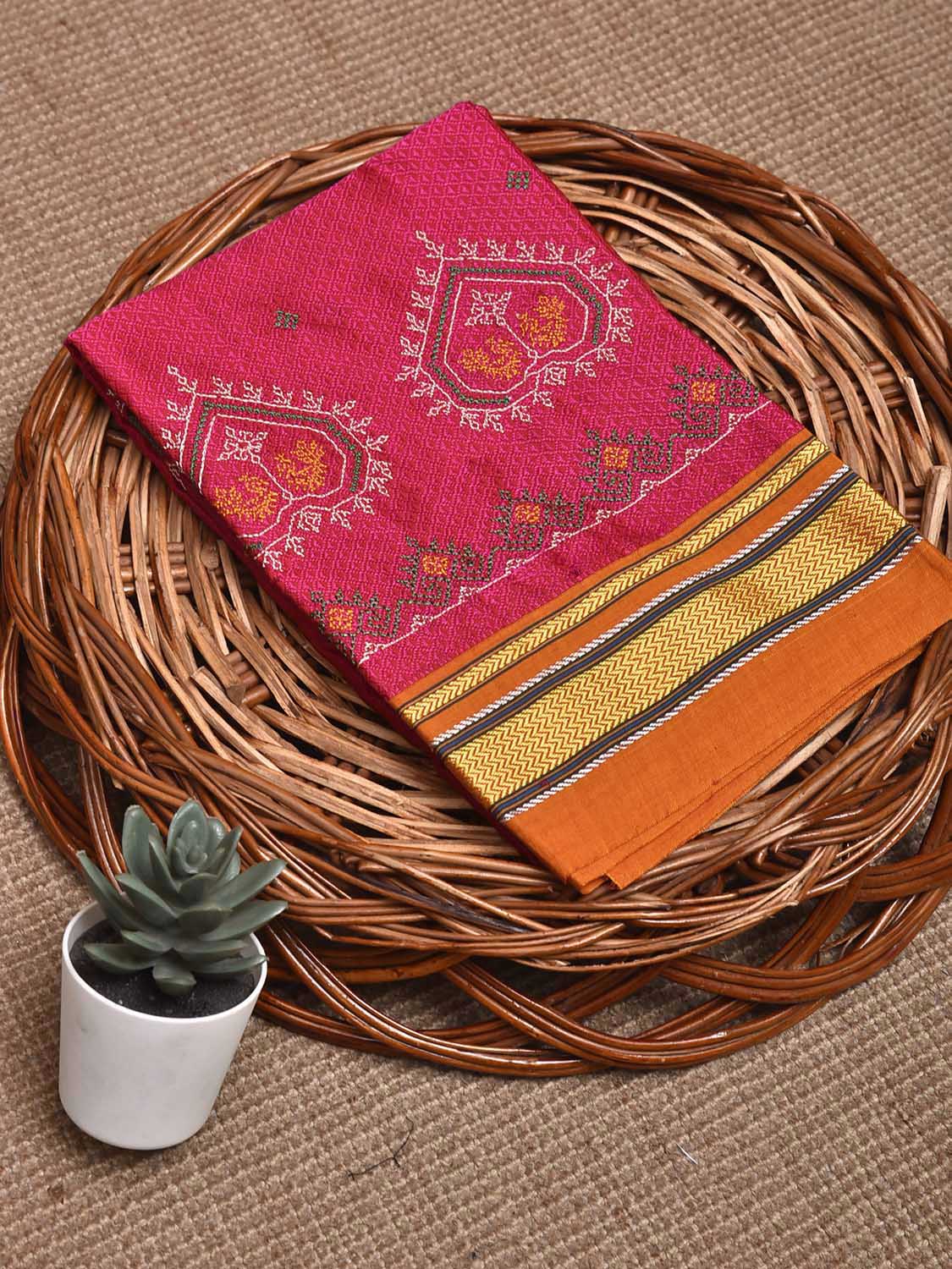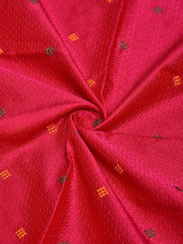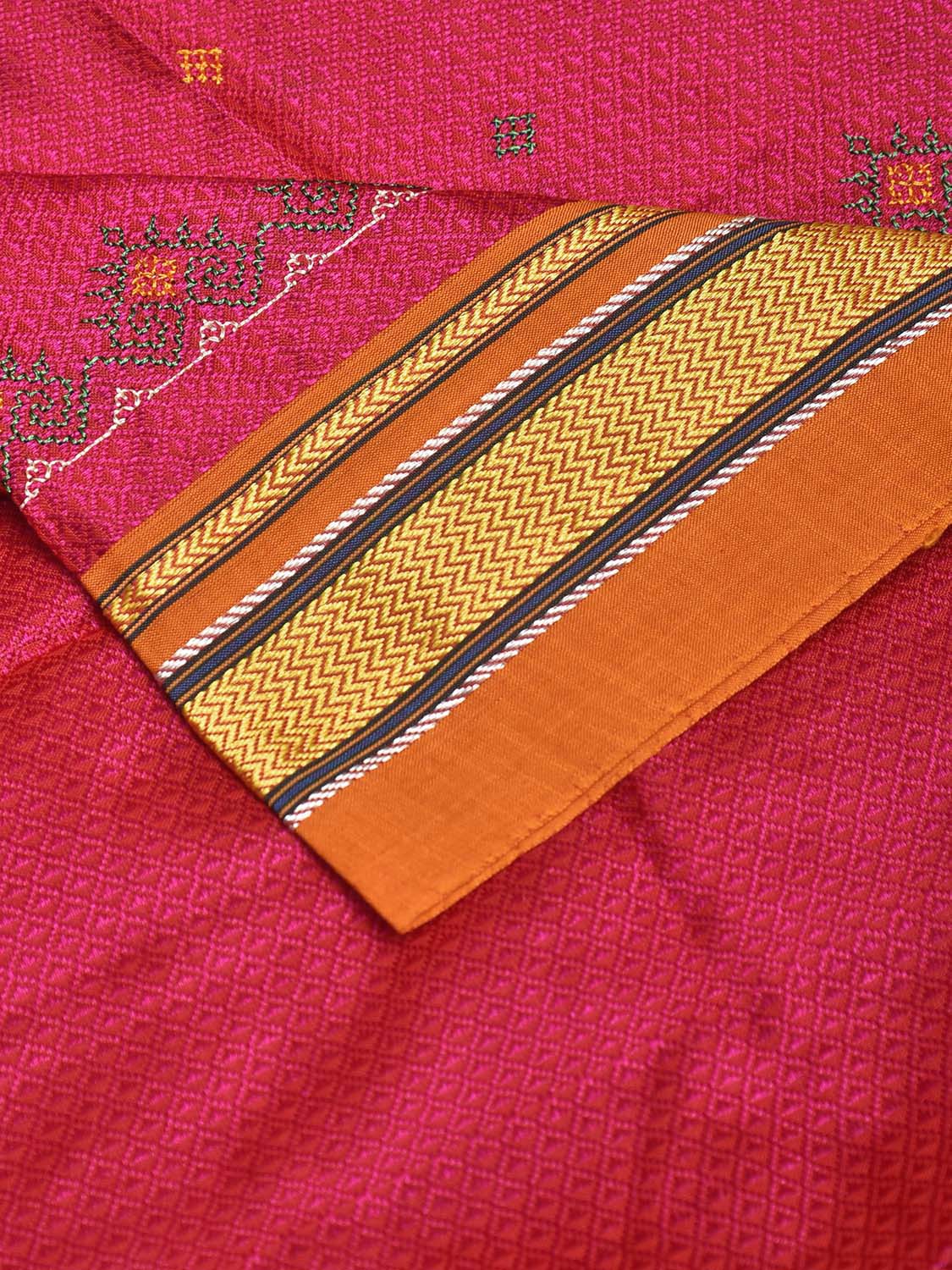 Pink and Orange Jacquard Viscose Bloue with Kasuti Work Design Length 1mt Width 36 Inches. Beautiful Pattern Blouse Fabric and Easy to Match to Any Suitable Saree. We Advise Gentle Handwash for Fabric Care.