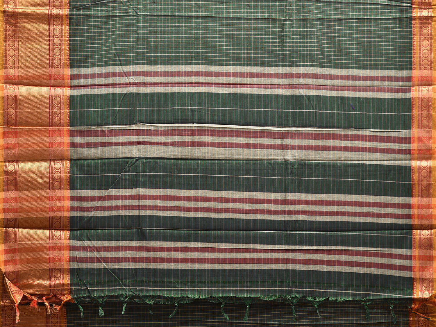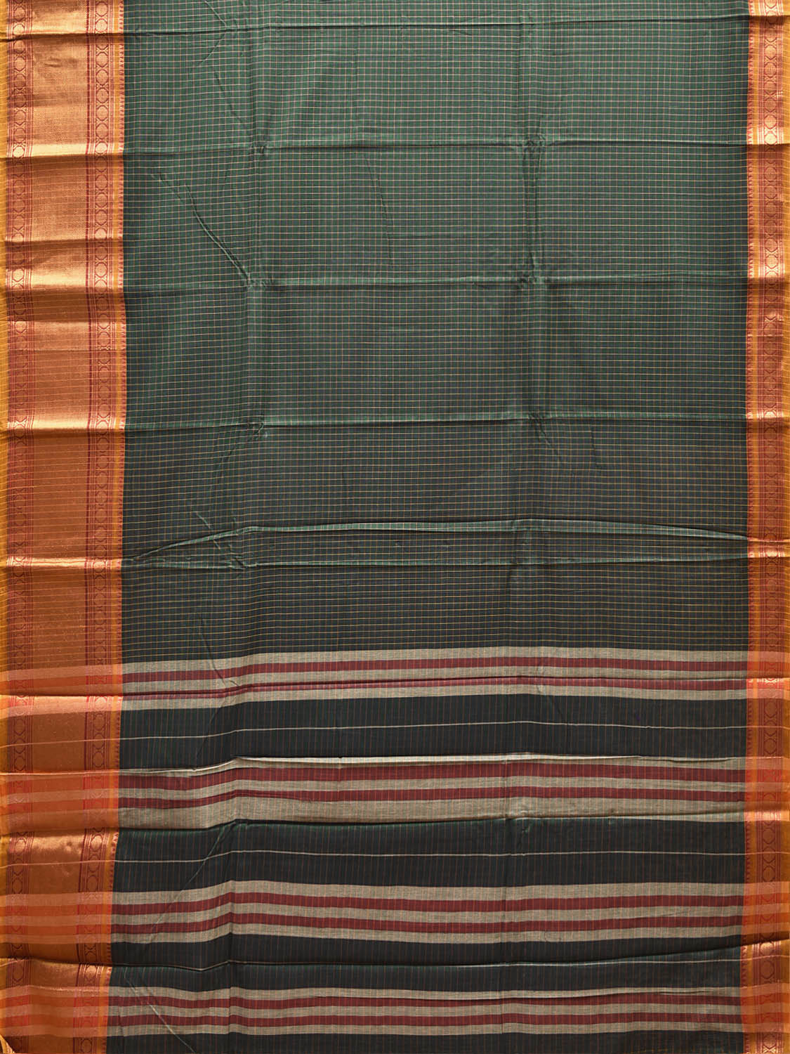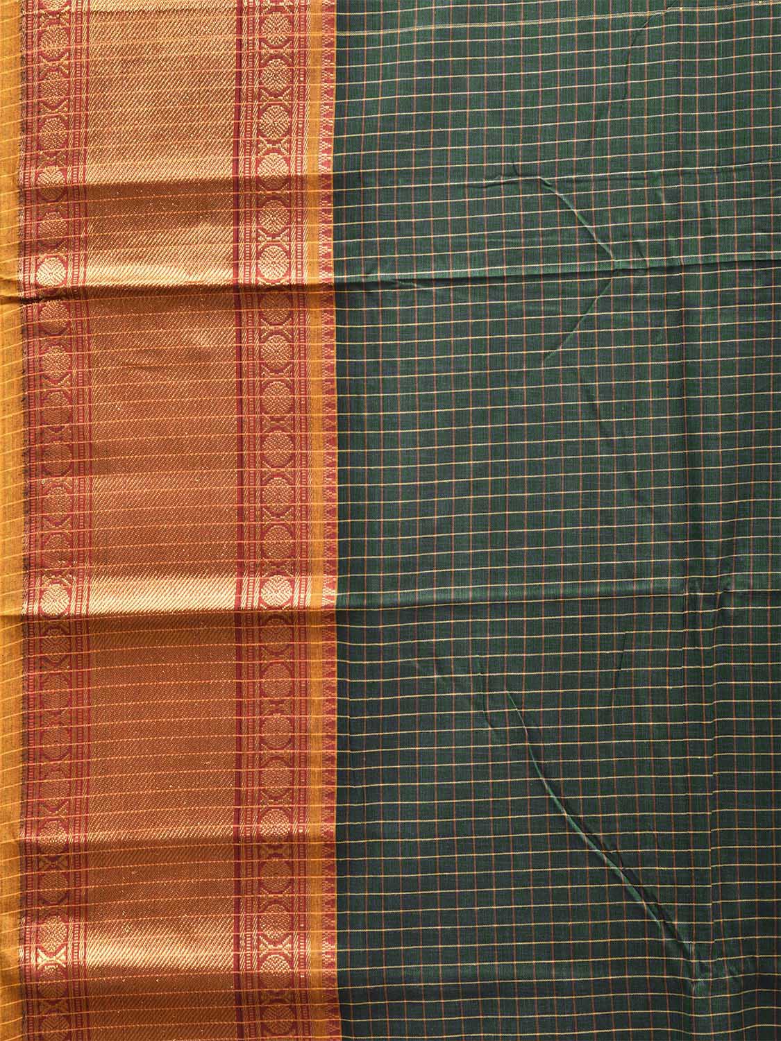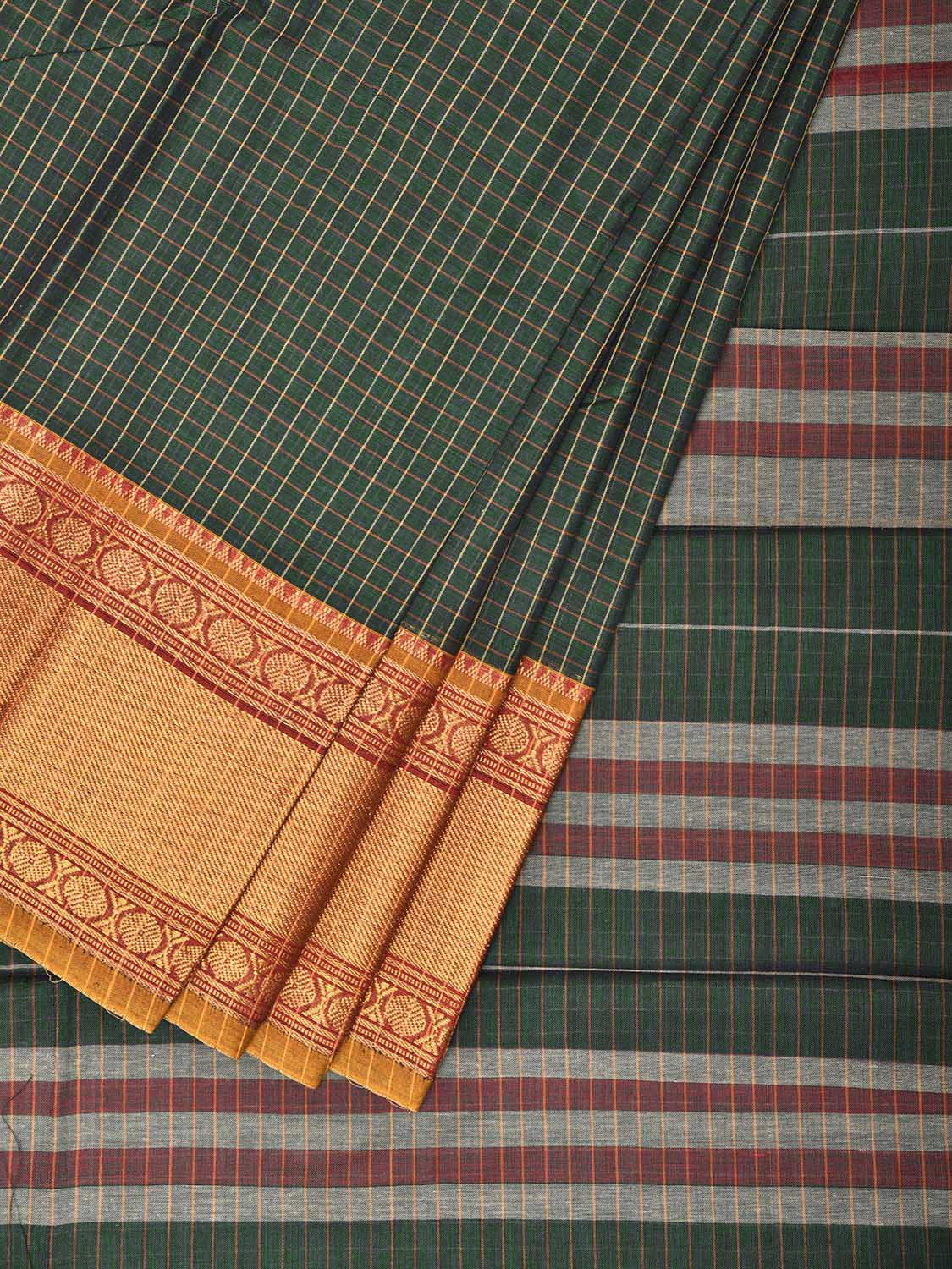 Dark Green Narayanpet Cotton Saree with Checks and Big Border Design No Blouse. This saree has no blouse.
