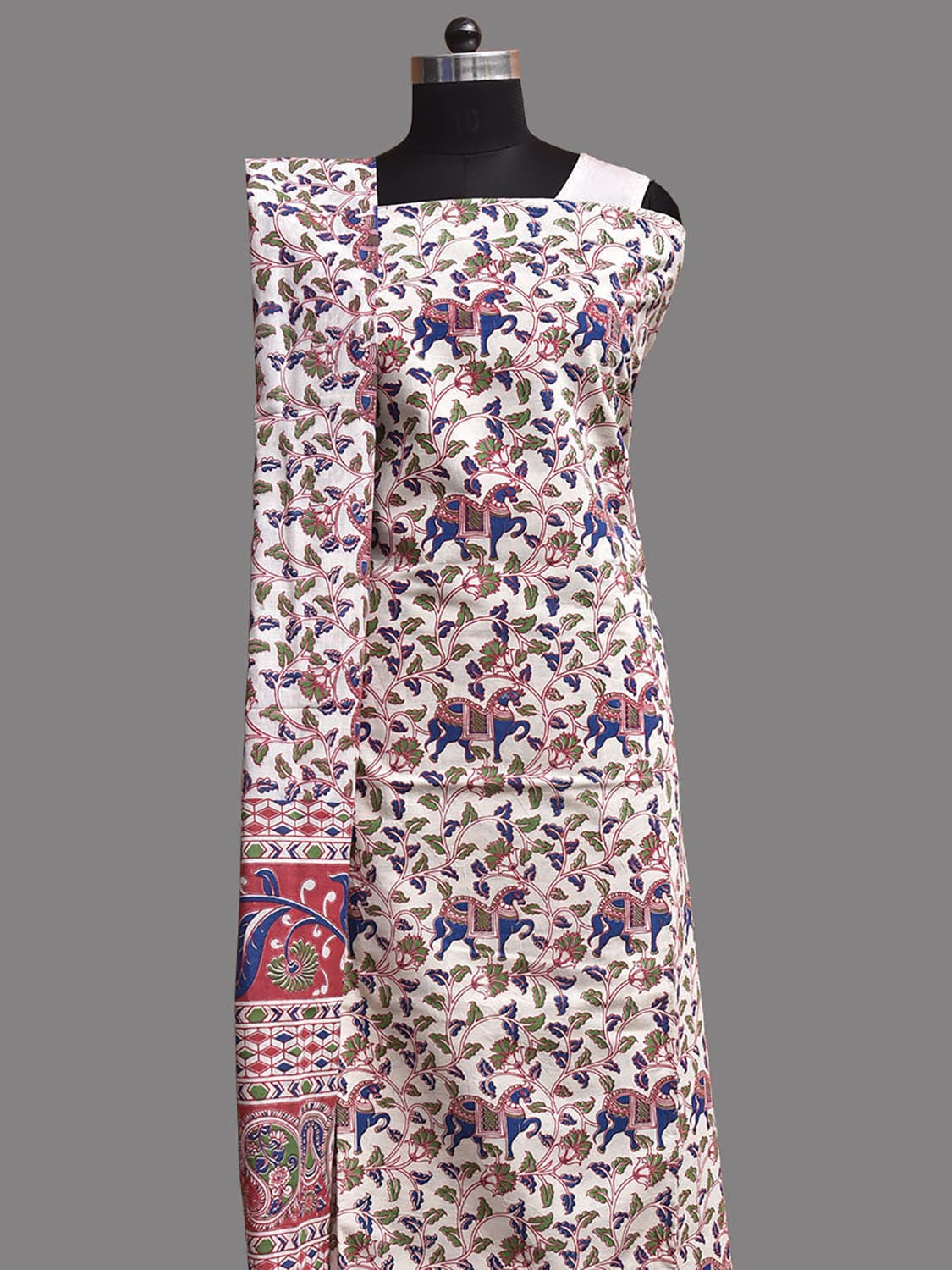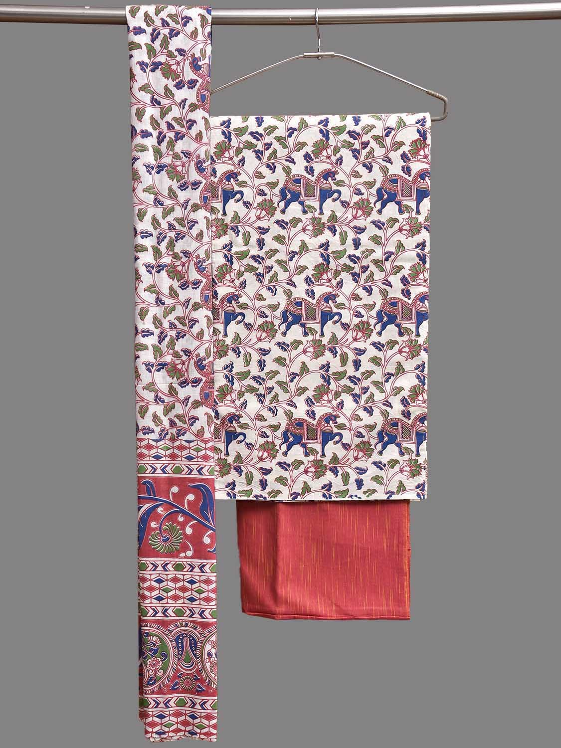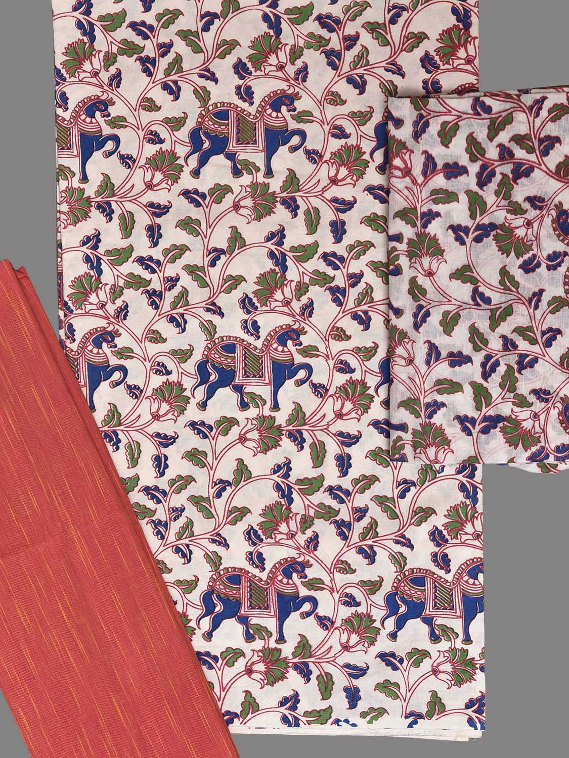 White and Peach Printed Cotton Dress Material with Top Bottom and Dupatta. We Advise Gentle Handwash for Fabric Care. Top - L 2mts W 48", Bottom - L 2.4mts W 44", Dupatta - L 2.2mts W 35".