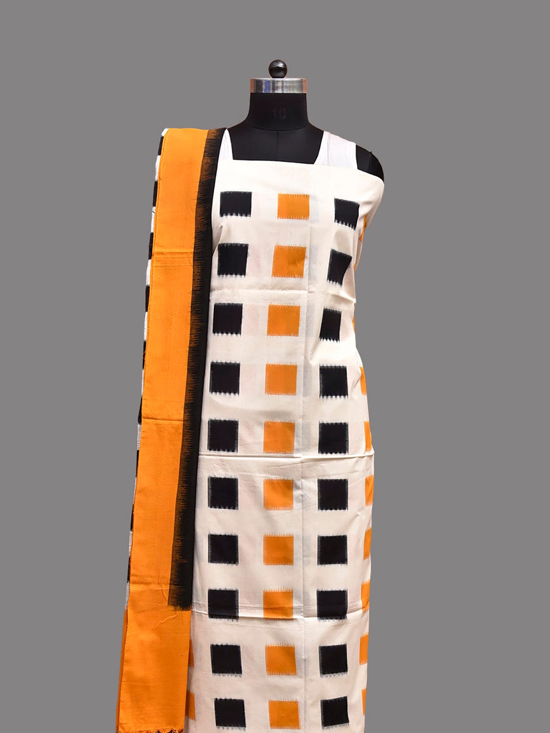 White and Yellow Pochampally Ikat Cotton Handloom Dress Material with Top Bottom and Dupatta 2.5mt Length dm0091