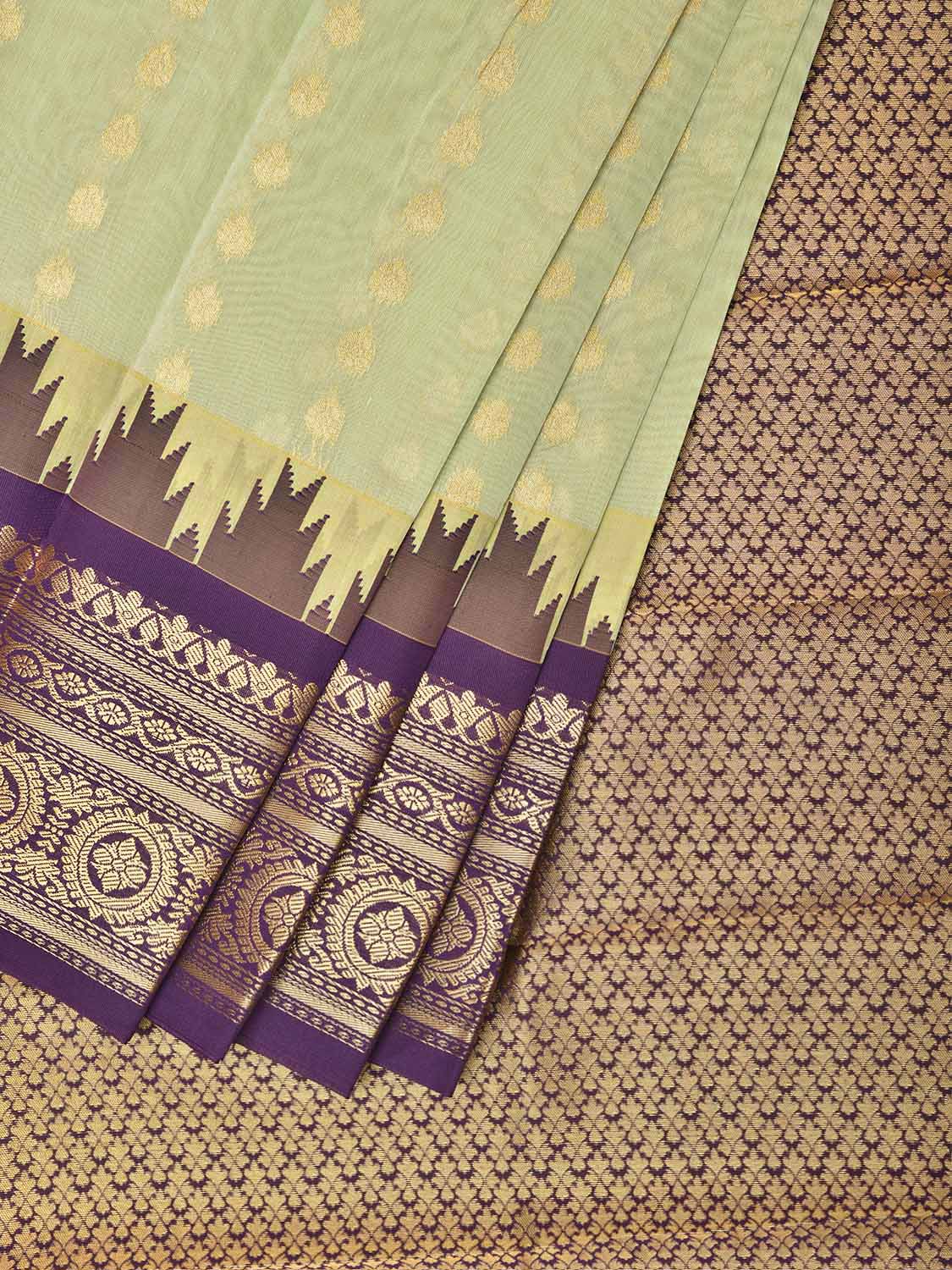 Sea Green and Purple Gadwal Cotton Viscose Saree with Pallu and Border Design. Gadwal Sarees are known for their traditional design of border and pallu made of silk and body being either cotton or silk. They are known as Sico sarees for border and pallu being silk and body being cotton. We advice dry clean for fabric care.