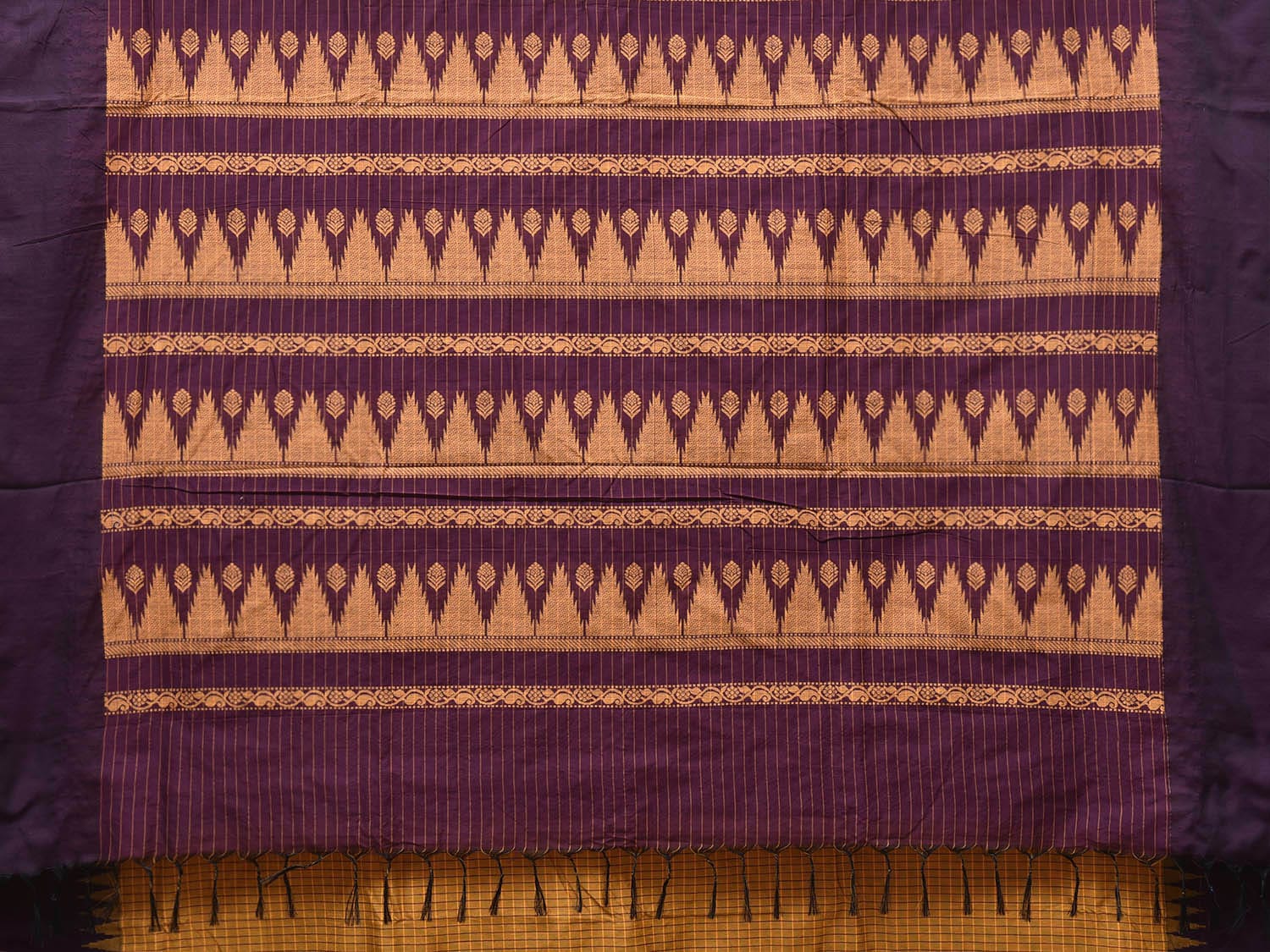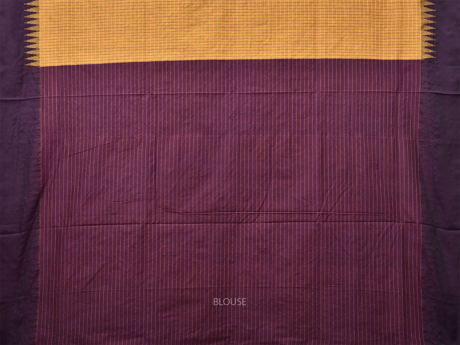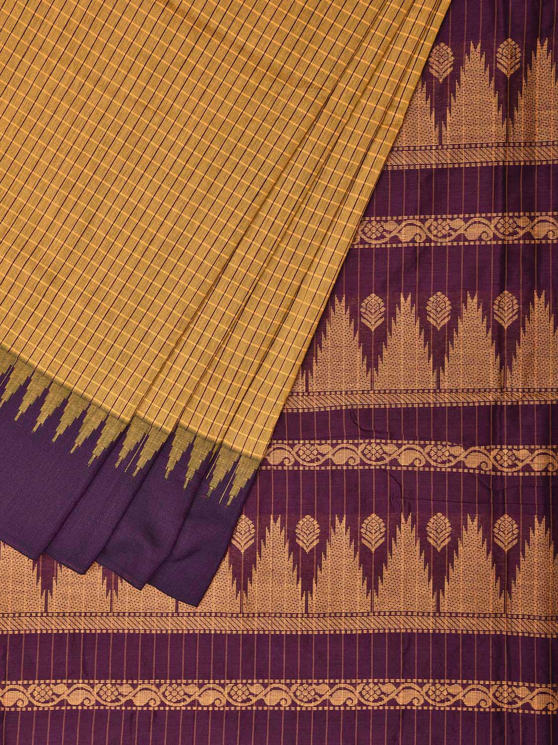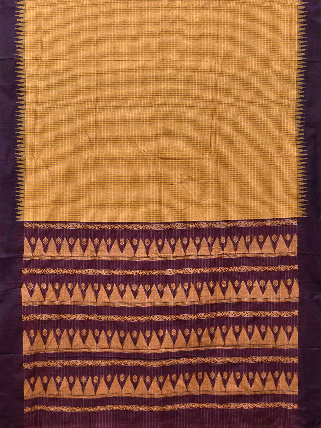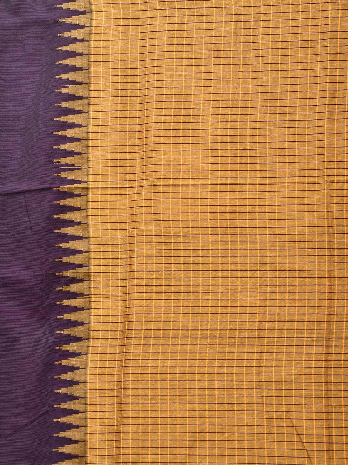 Yellow and Purple Gadwal Cotton Viscose Saree with Checks and Pallu Design. Gadwal Sarees are known for their traditional design of border and pallu made of silk and body being either cotton or silk. They are known as Sico sarees for border and pallu being silk and body being cotton. We advice dry clean for fabric care.