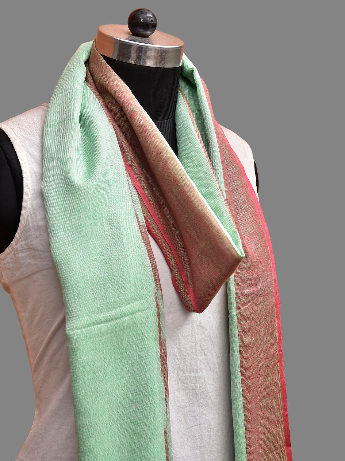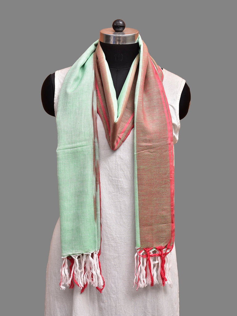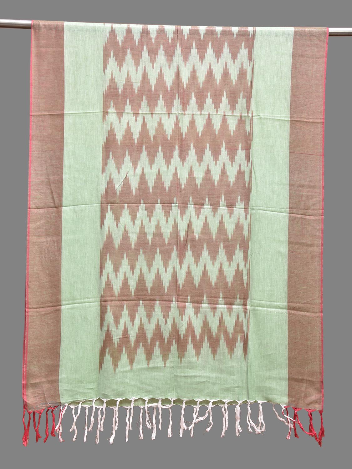 Light Green Pochampally Ikat Cotton Dupatta with Zig-Zag Design. This Handloom Saree has been woven using the resist-dyeing, which produces the unique patterns adorning the fabric. We advise gentle handwash separately for fabric care.