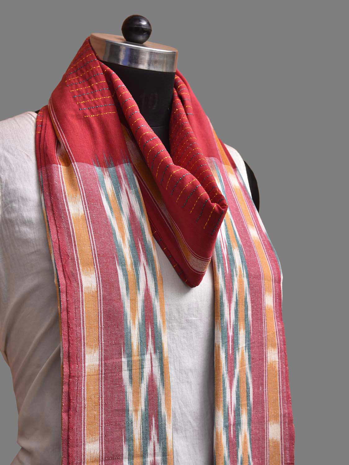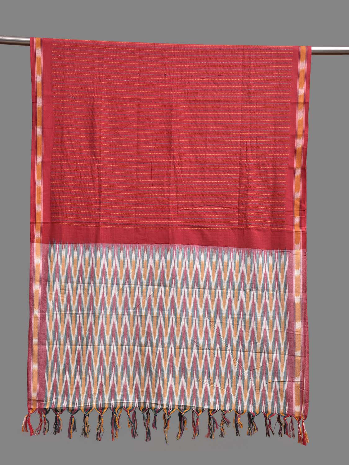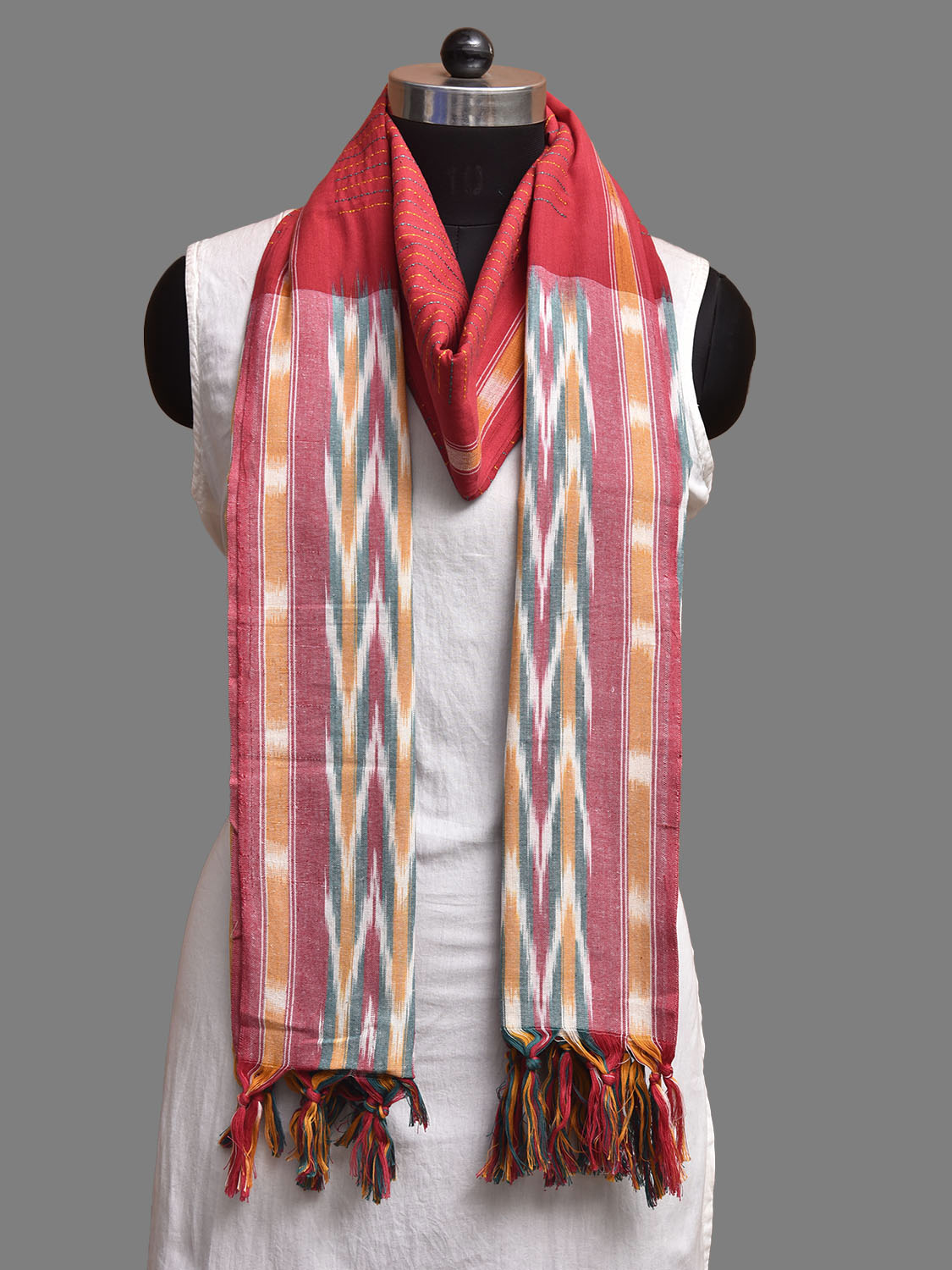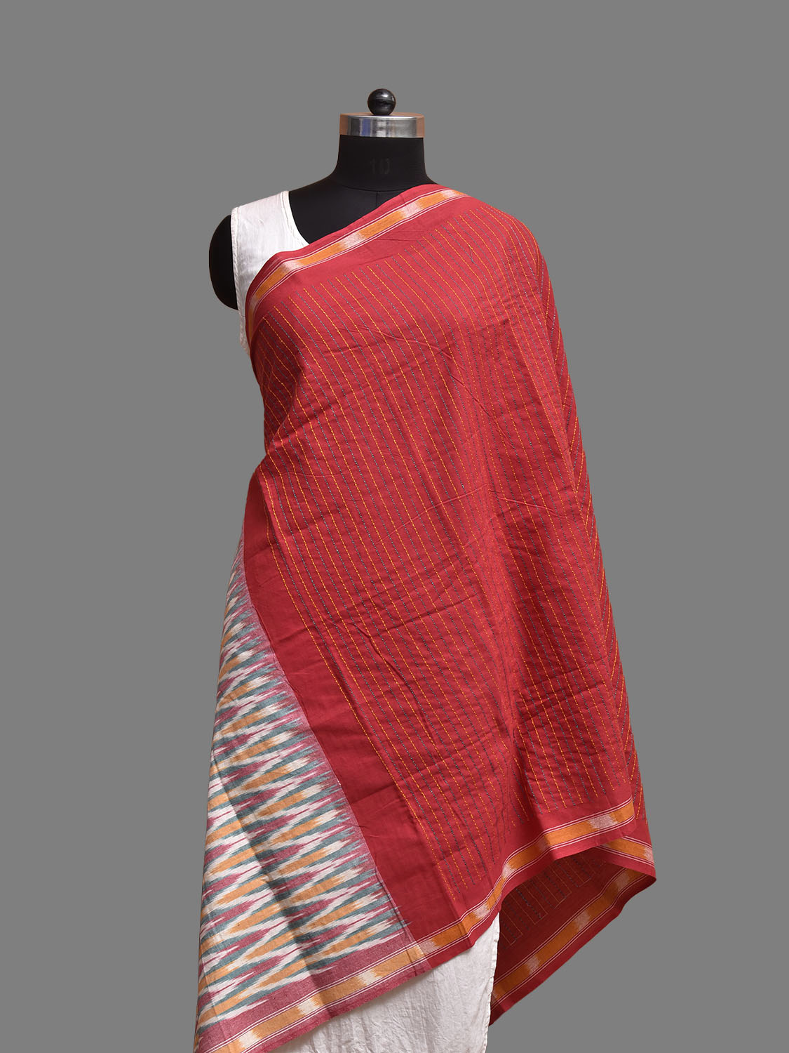 Red and White Pochampally Ikat Cotton Handloom Dupatta with Embroidary Strips Design. This Handloom Dupatta has been woven using the resist-dyeing, which produces the unique patterns adorning the fabric. We advise gentle handwash separately for fabric care.