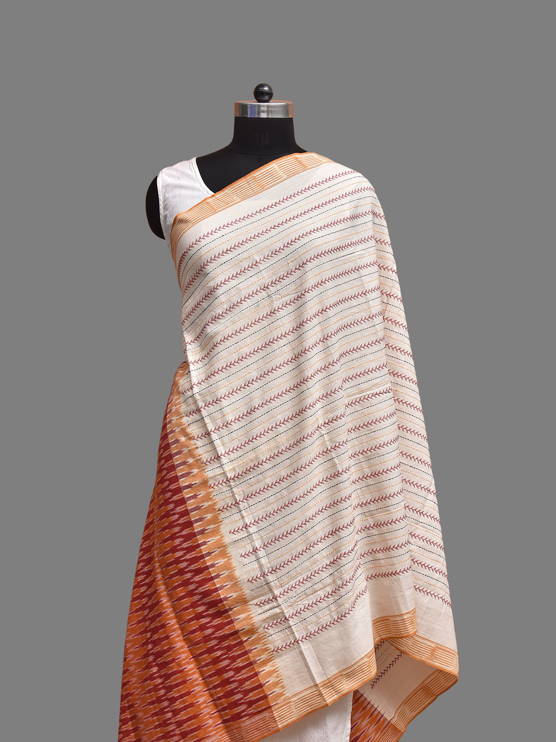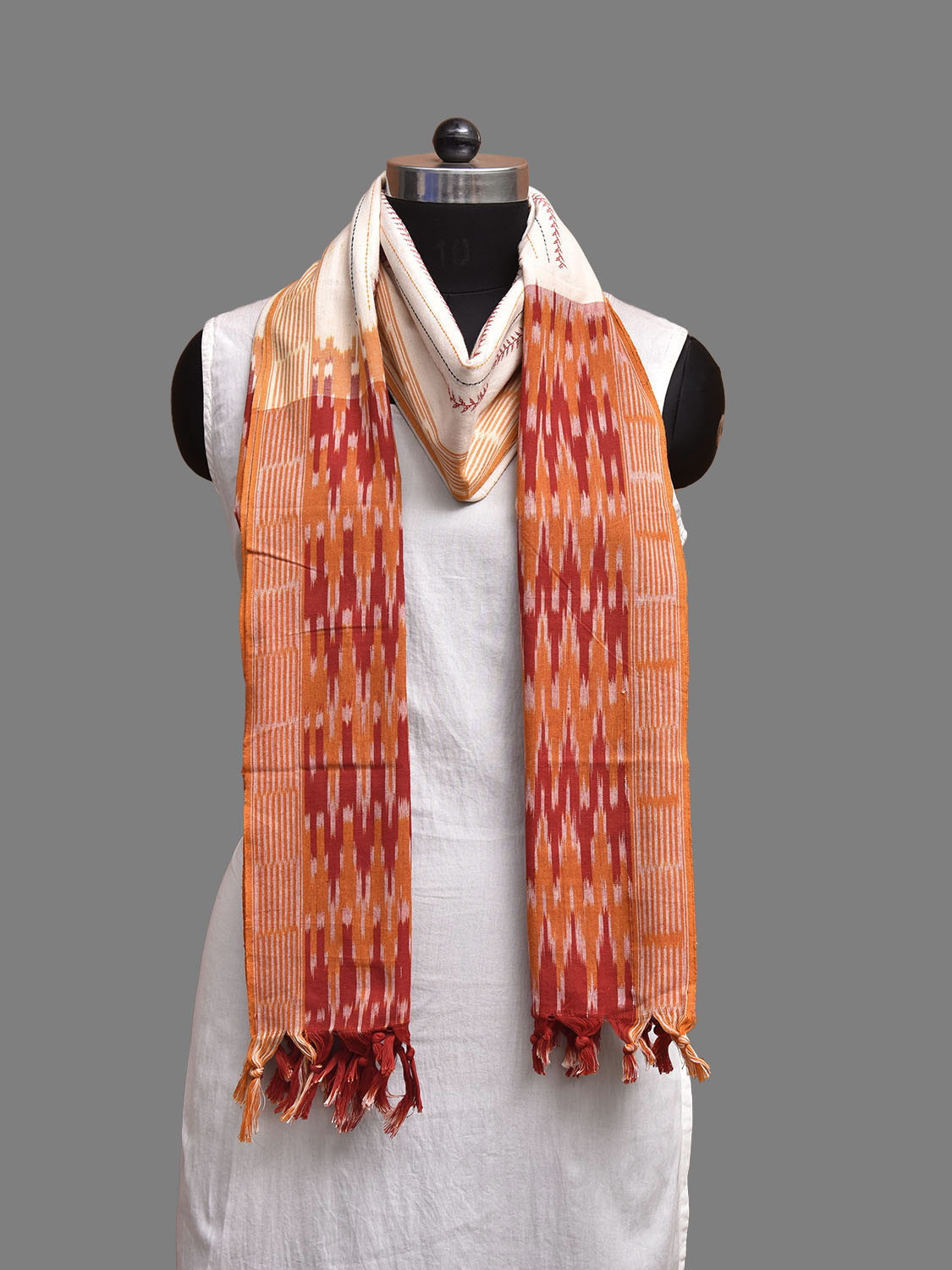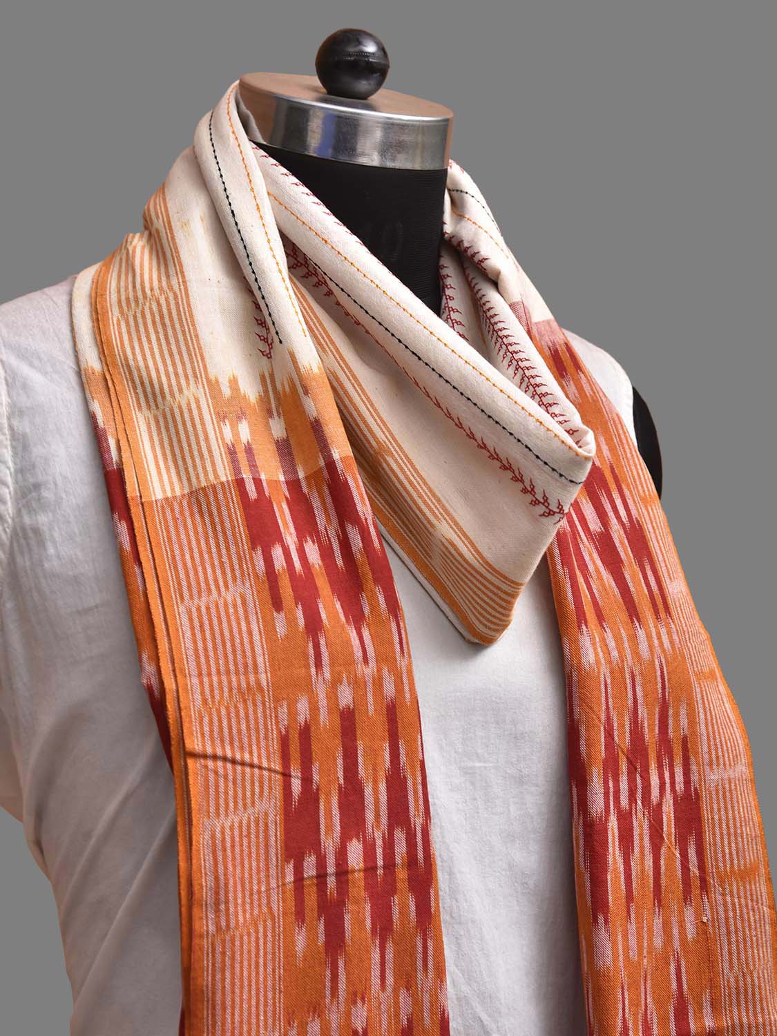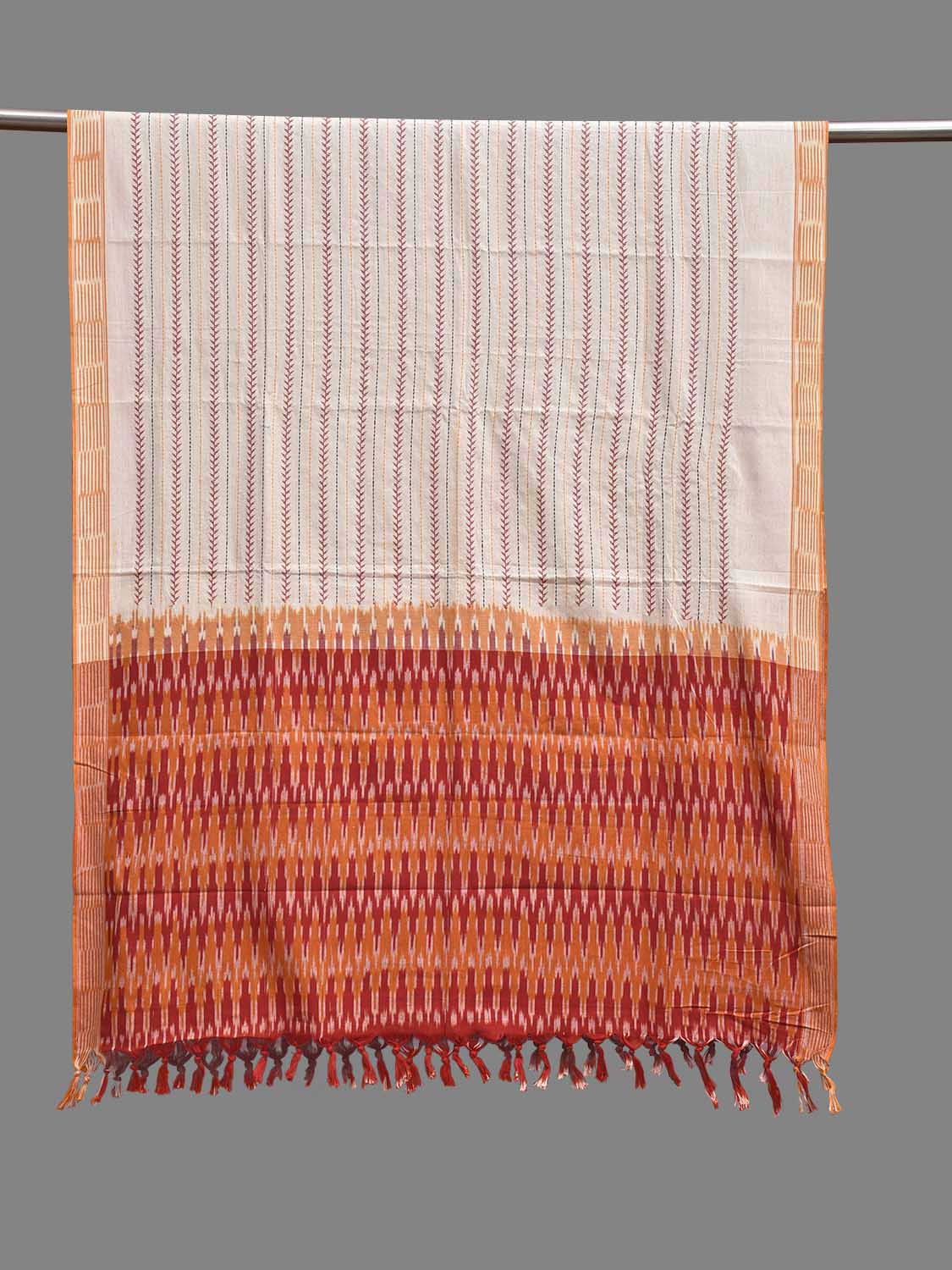 White and Red Pochampally Ikat Cotton Handloom Dupatta with Embroidary Strips Design. This Handloom Dupatta has been woven using the resist-dyeing, which produces the unique patterns adorning the fabric. We advise gentle handwash separately for fabric care.