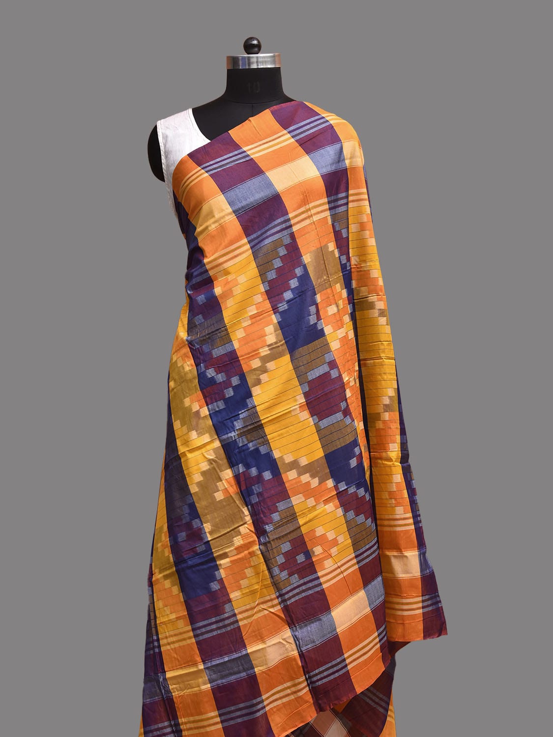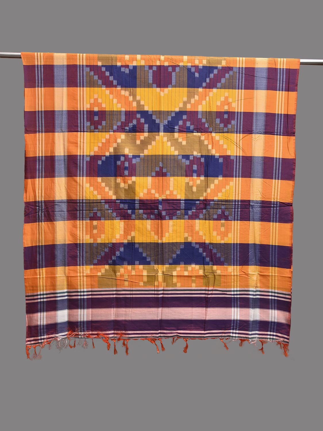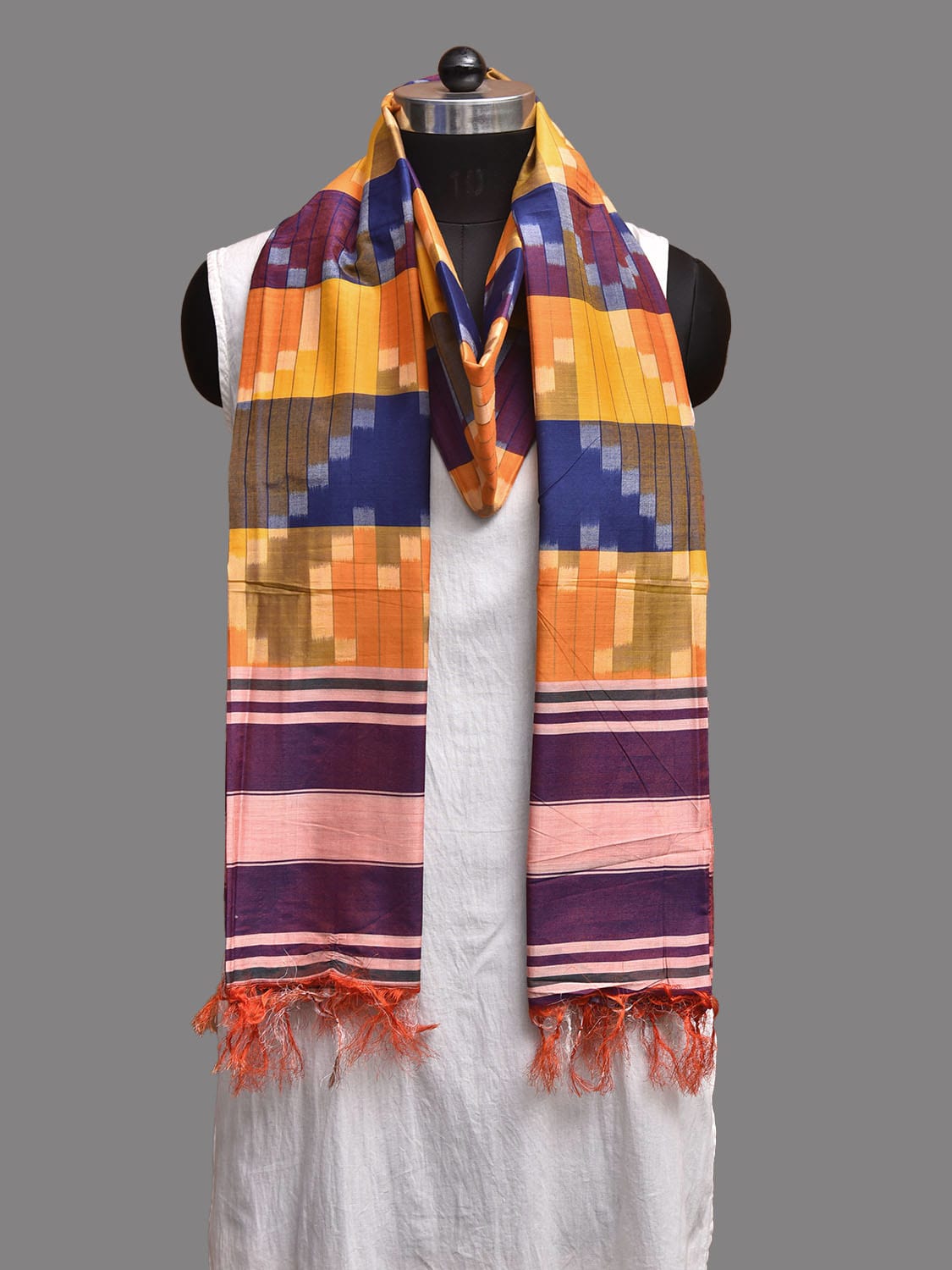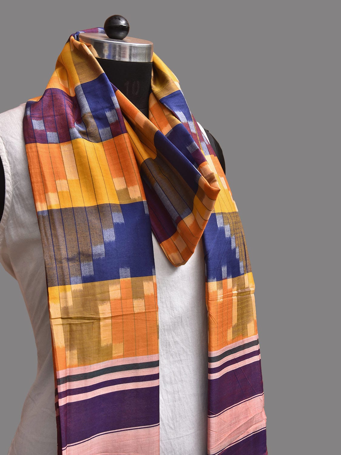 Yellow and Blue Ikat Cotton Silk Dupatta with Zig-Zag Design. This Handloom Dupatta has been woven using the resist-dyeing, which produces the unique patterns adorning the fabric. We advise gentle handwash separately for fabric care.