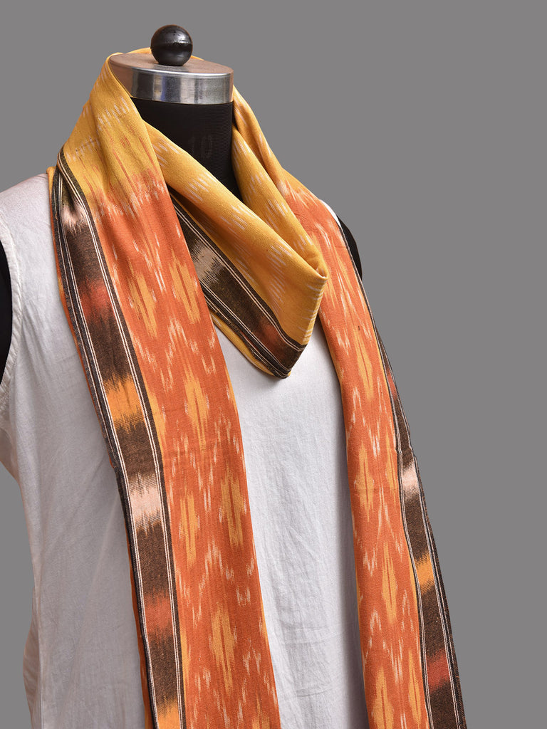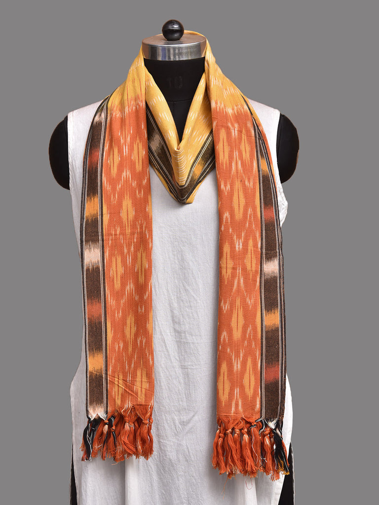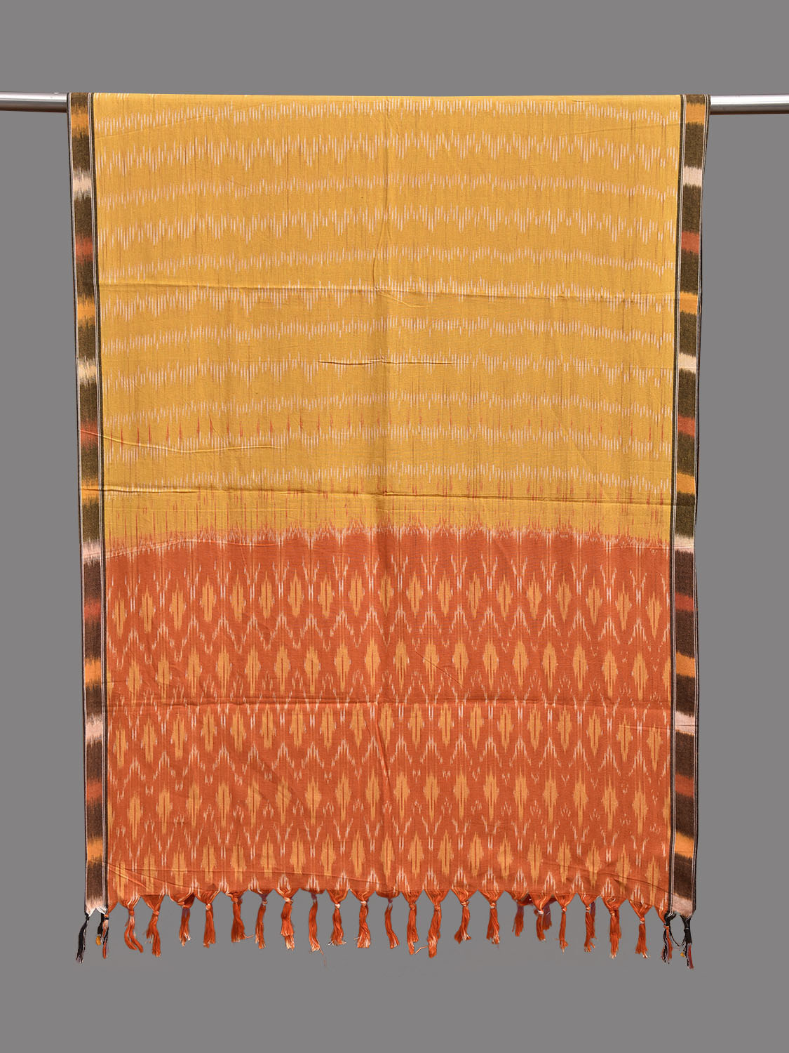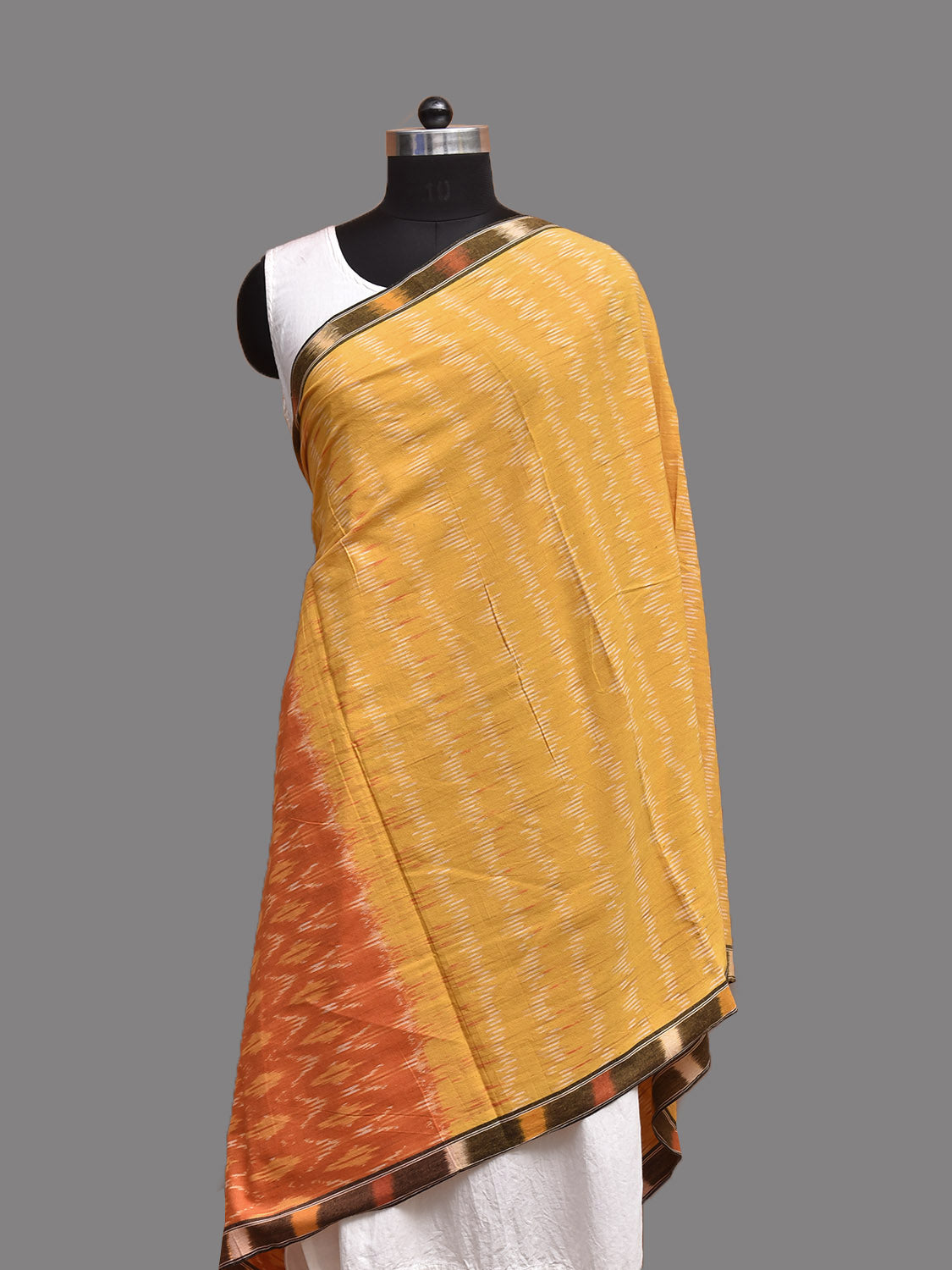 Yellow and Orange Pochampally Ikat Cotton Handloom Dupatta with Grill Pallu Design. This Handloom Dupatta has been woven using the resist-dyeing, which produces the unique patterns adorning the fabric. We advise gentle handwash separately for fabric care.