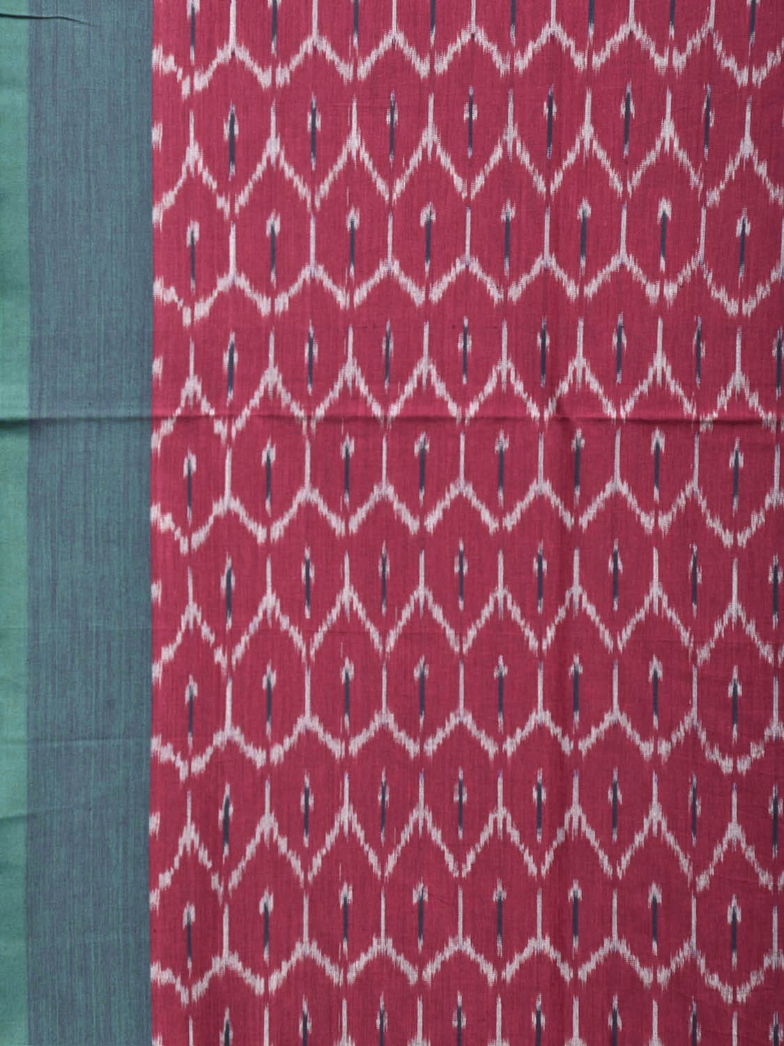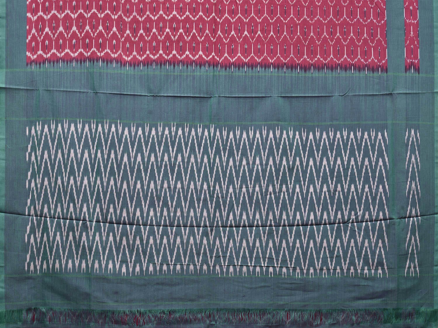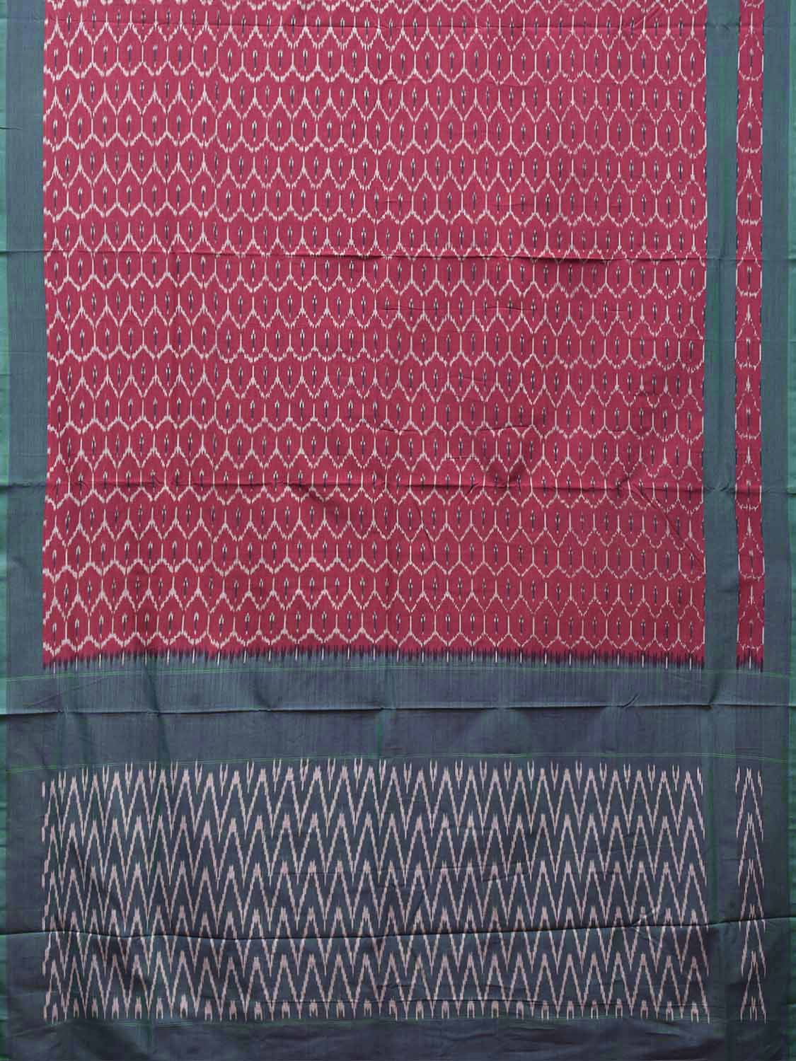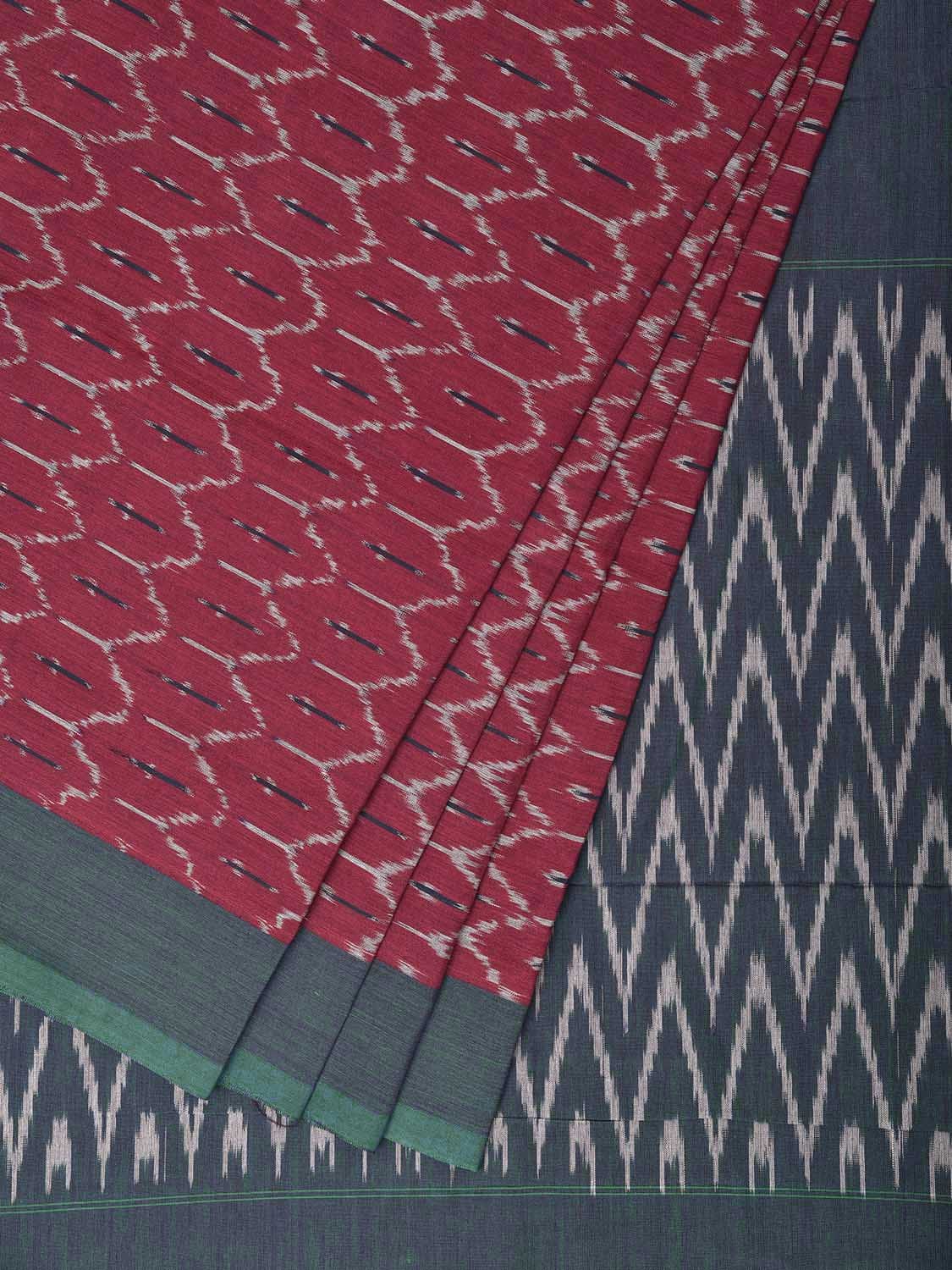 Dark Red and Green Pochampally Ikat Cotton Handloom Saree with Grill Buta and Zig-Zag Pallu Design No Blouse. This Handloom Saree from Andhra Pradesh has been woven using the resist-dyeing, which produces the unique patterns adorning the fabric. We advise gentle handwash separately for fabric care. This saree has no blouse.