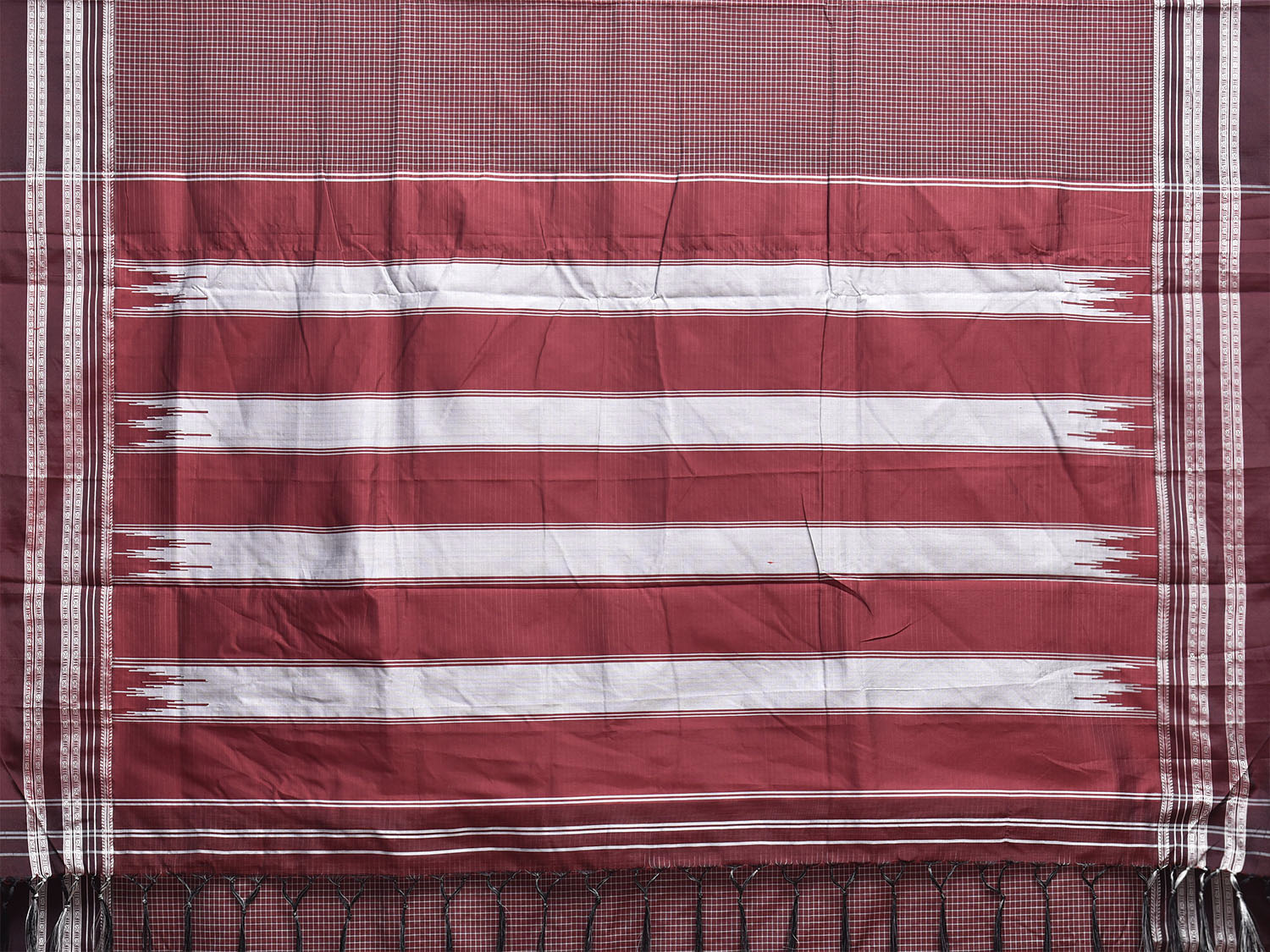 Maroon ilkal Cotton Viscose Saree with Checks and Strips Pallu Design. For fabric care we advise gentle handwash separately.