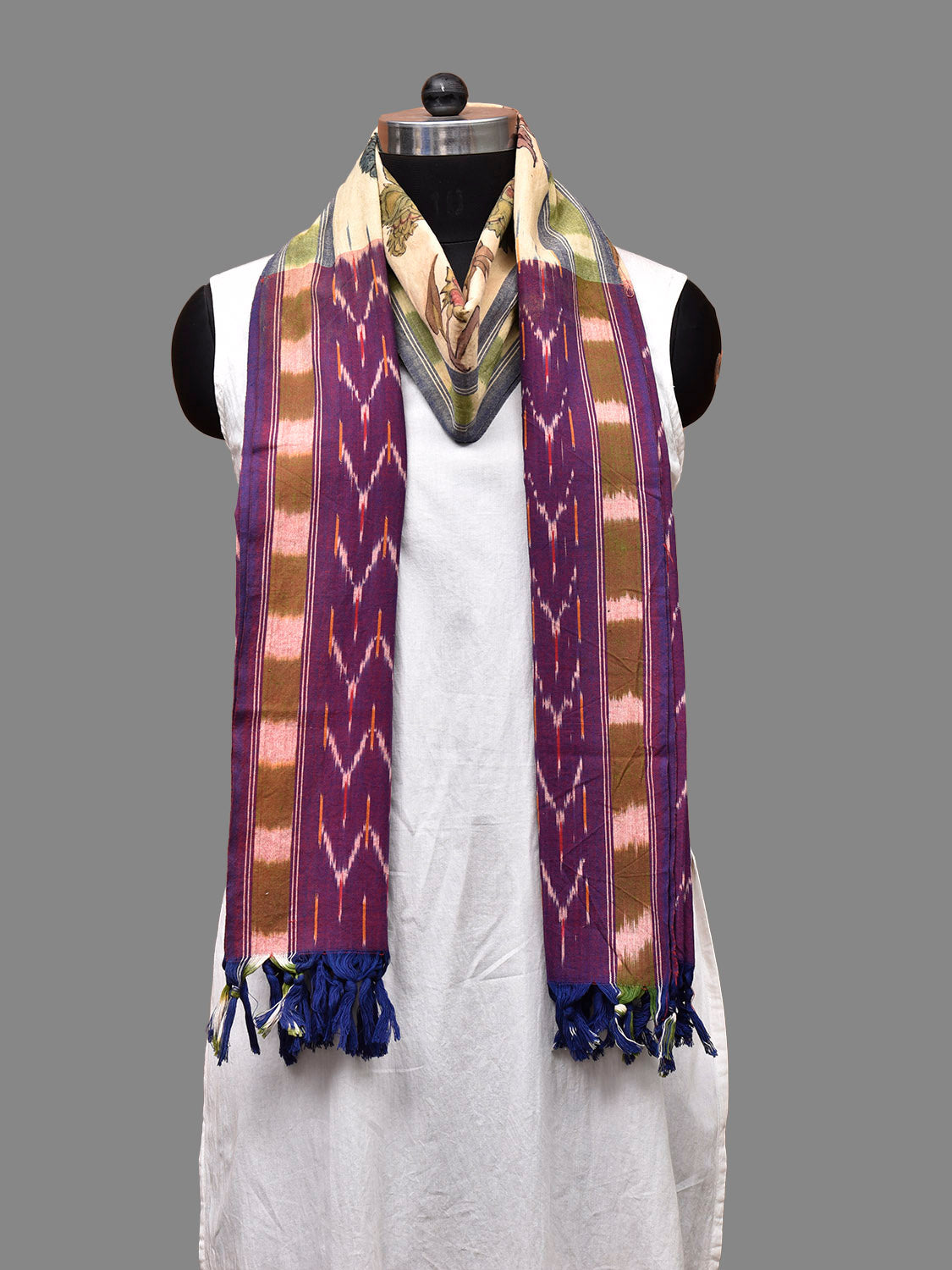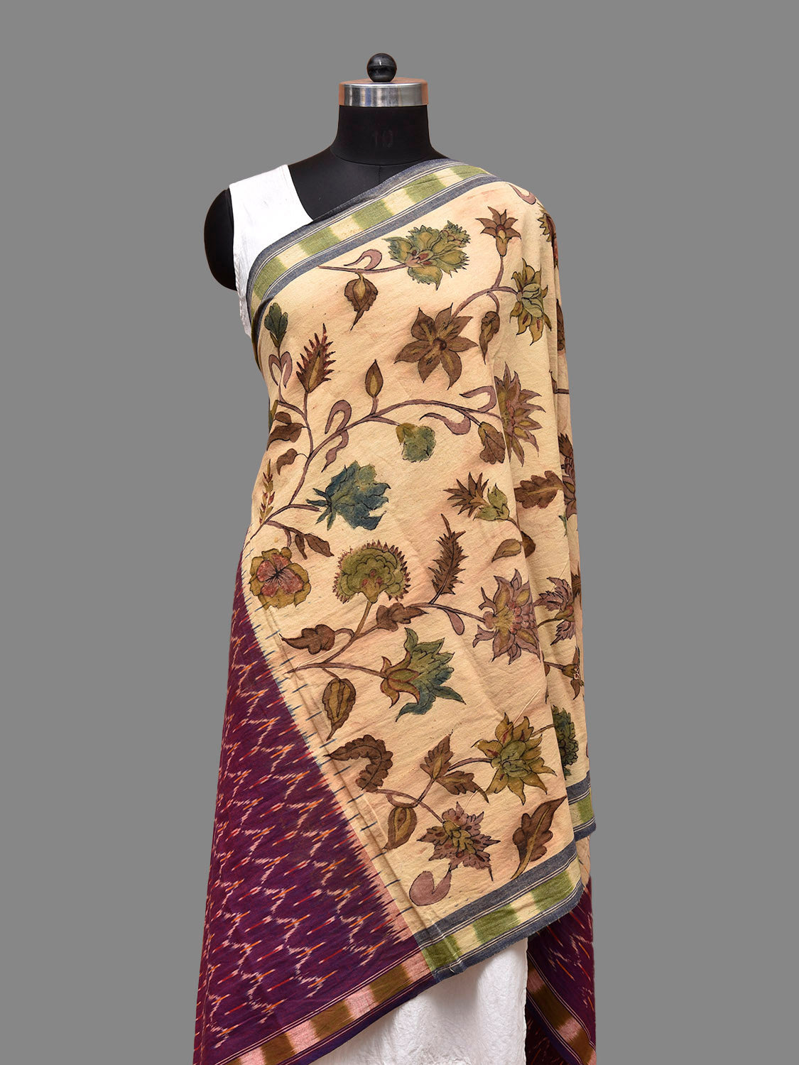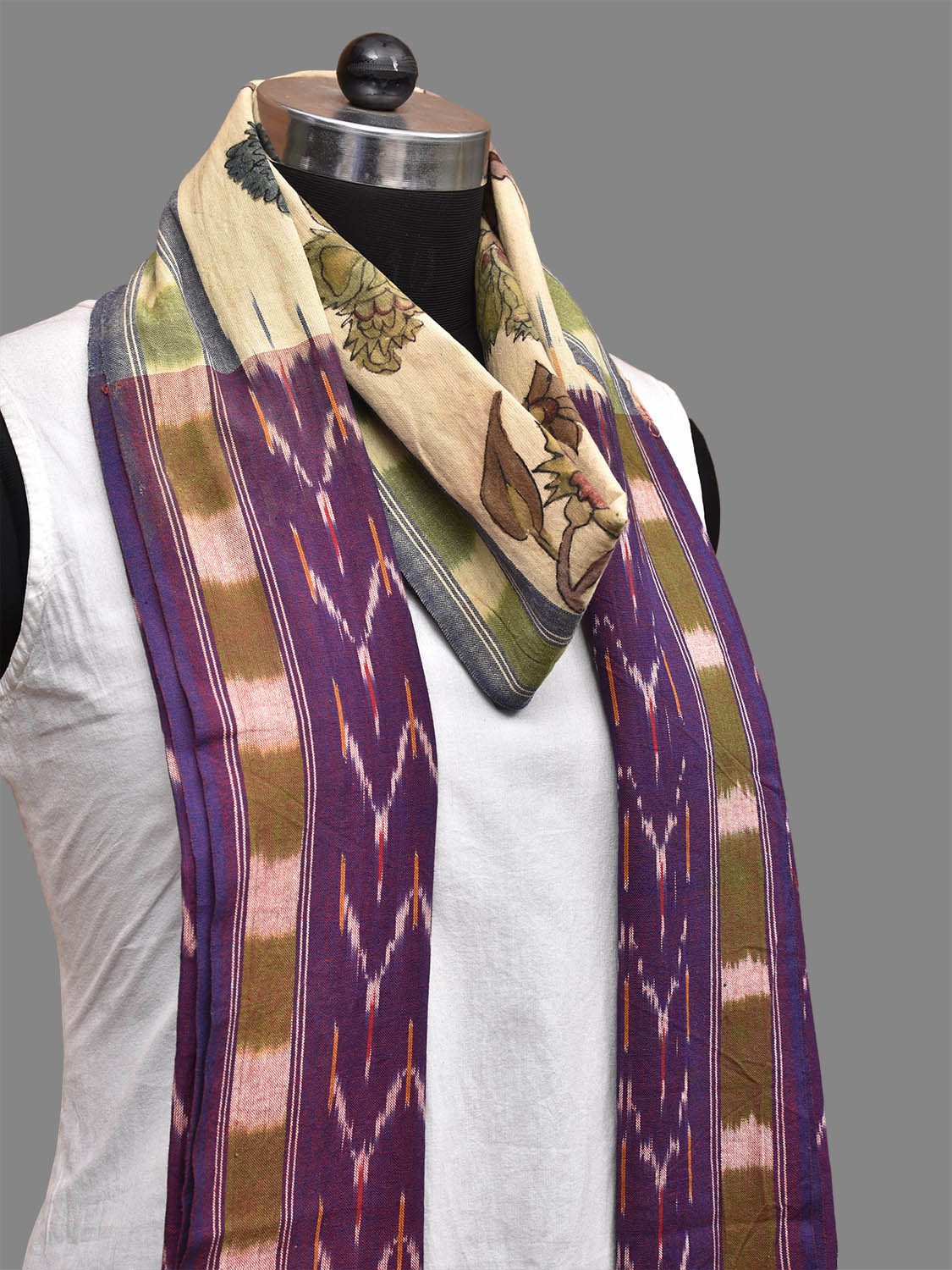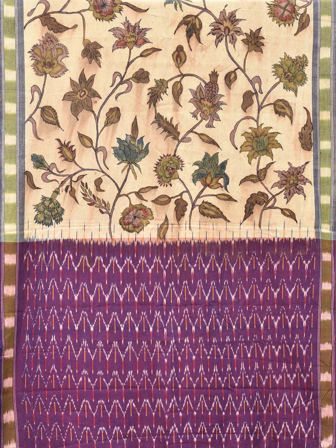 Cream and Purple Kalamkari Hand Painted Ikat Cotton Handloom Dupatta with Krishna Design. This hand painted kalamkari is done using natural dyes. As they are natural colors they bleed with initial washes, so we suggest Dry clean.