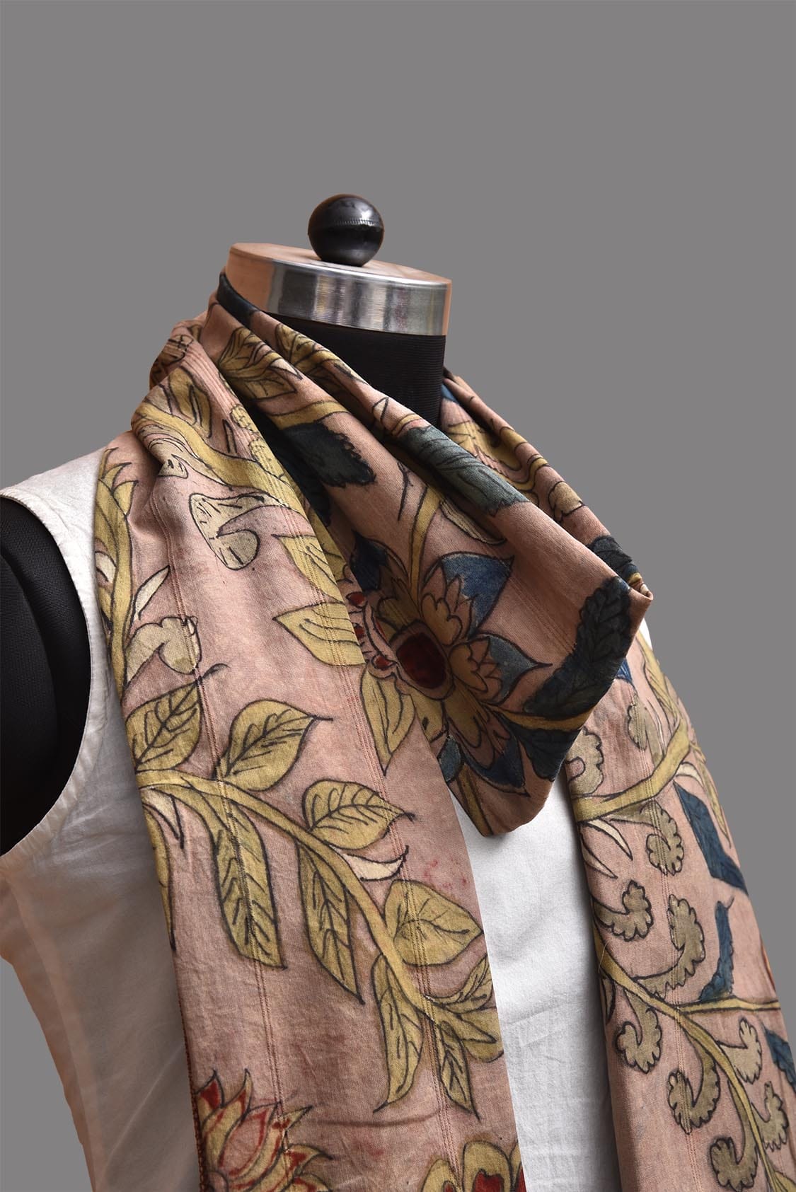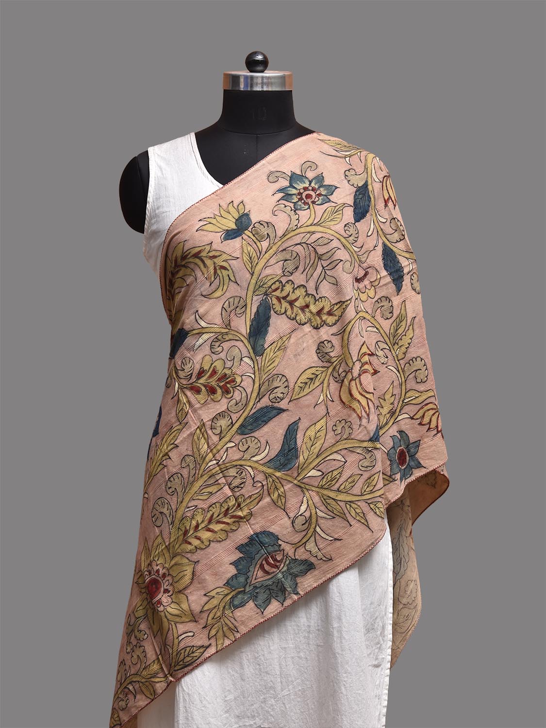 Light Peach Kalamkari Hand Painted Cotton Stole with Big Floral Design. This hand painted kalamkari is done using natural dyes. As they are natural colors they bleed with initial washes, so we suggest Dry clean.