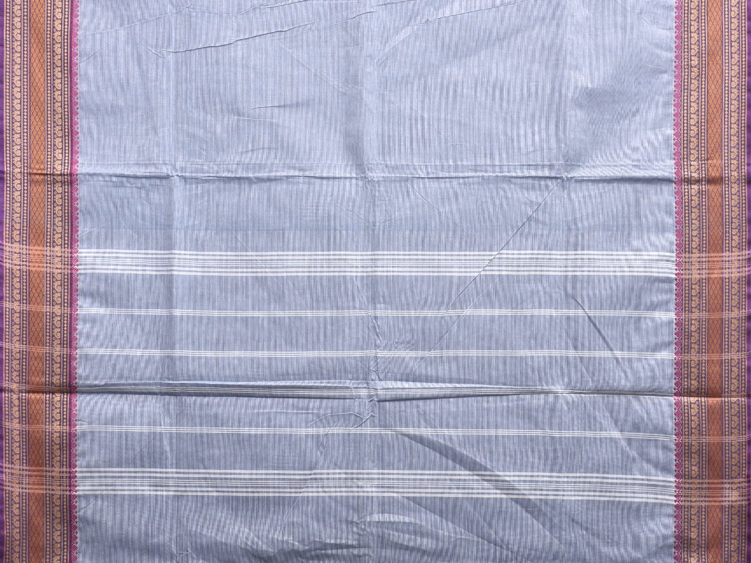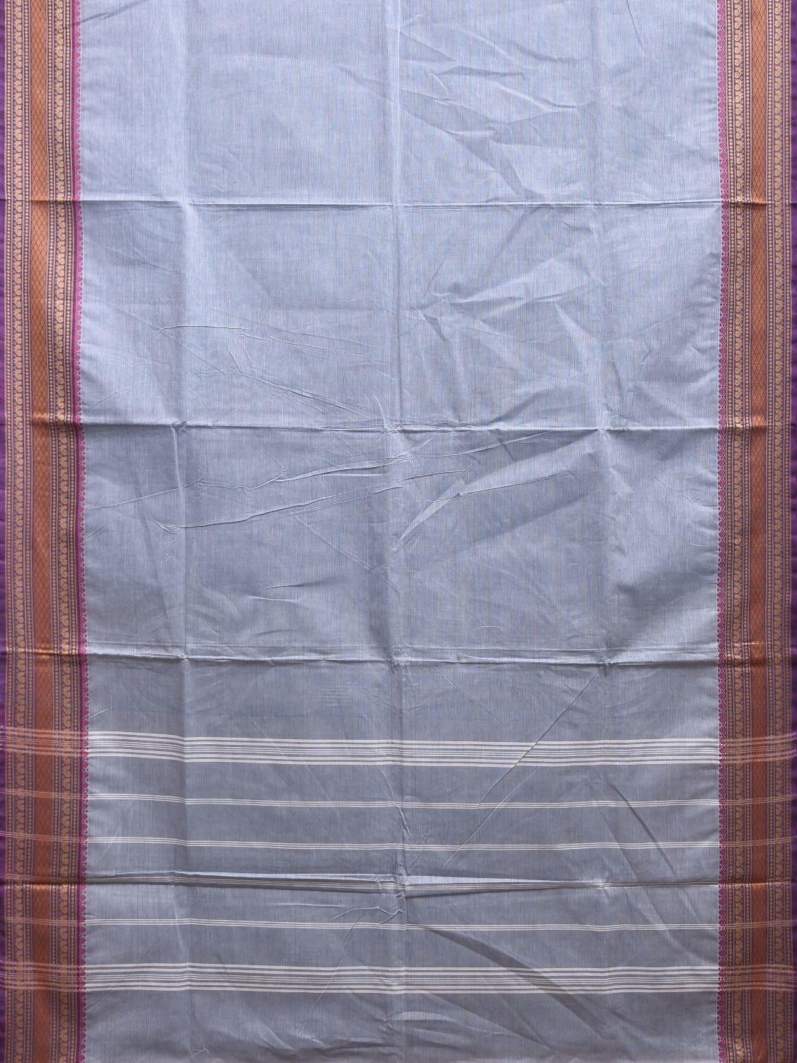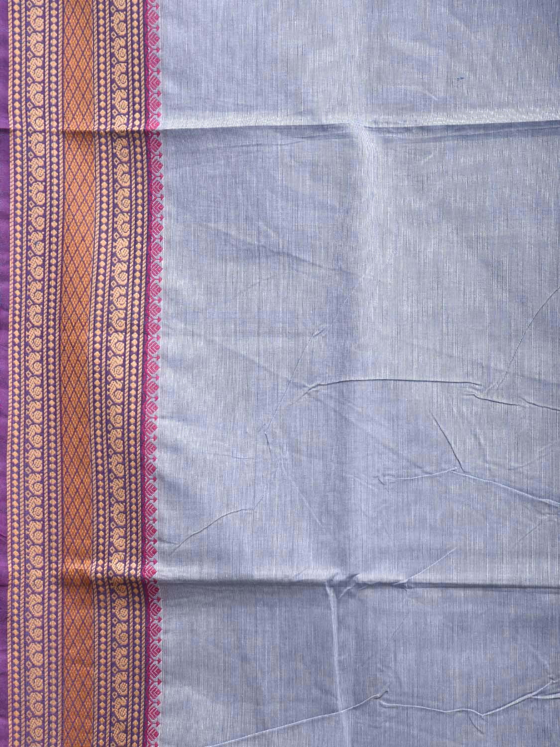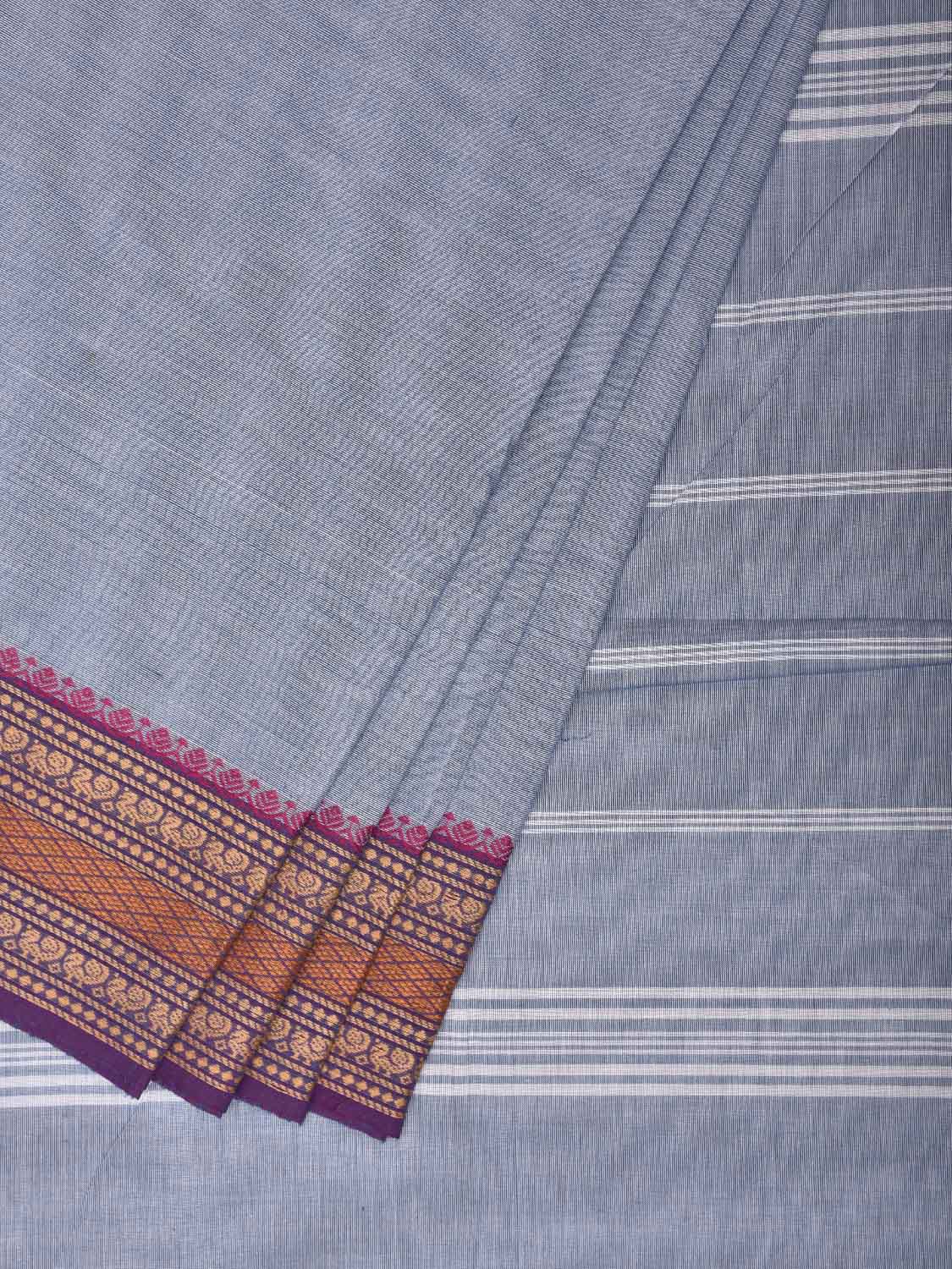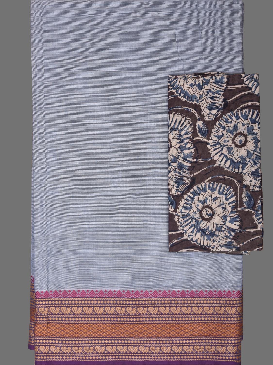Light Blue Kanchipuram Cotton Plain Saree with Strips Pallu Design and Kalamkari Blouse. Traditional Simple South Indian Attire Saree for any Casual Occasions. As it’s a cotton saree we advice gentle handwash separately for fabric care.