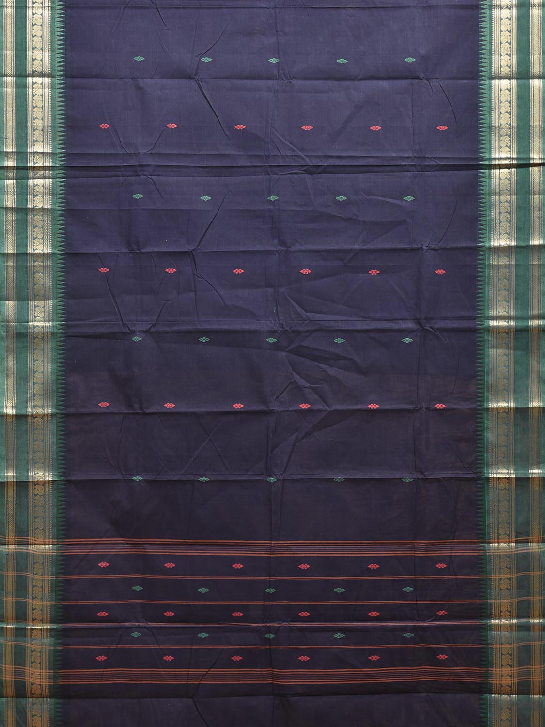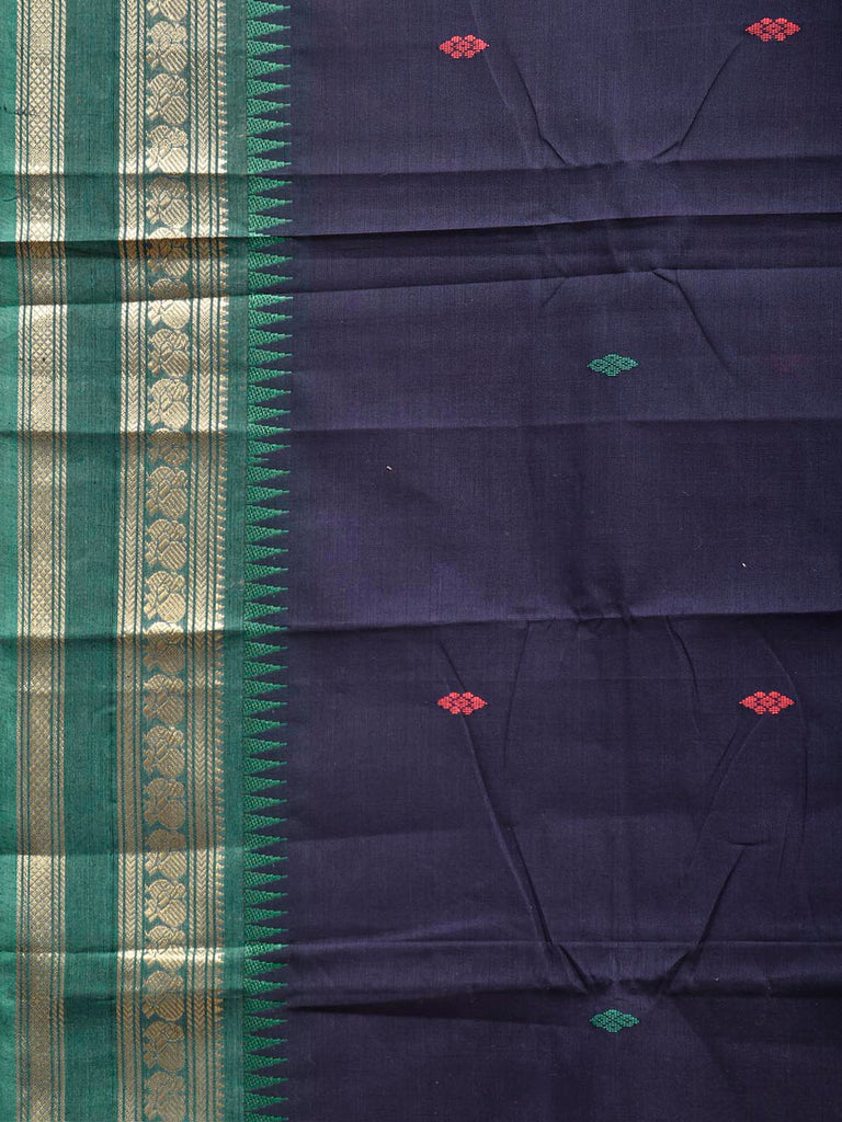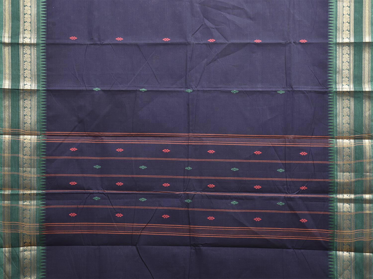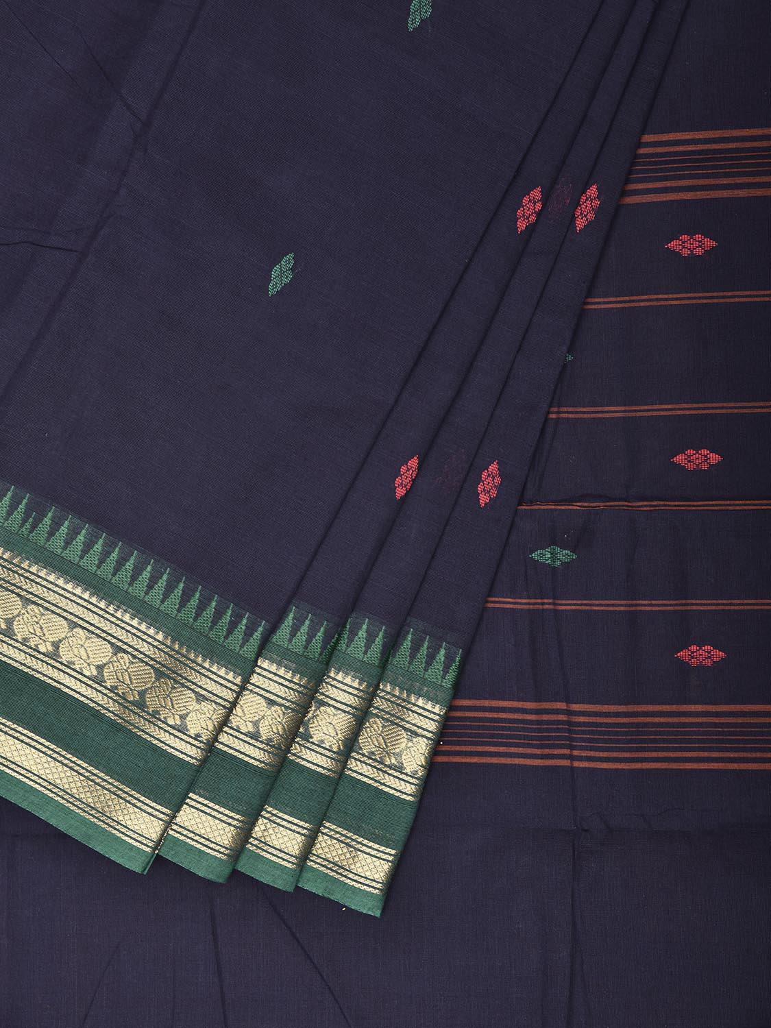 Navy and Green Kanchipuram Cotton Saree with Border and Strips Pallu Design No Blouse. Traditional Simple South Indian Attire Saree for any Casual Occasions. As it’s a cotton saree we advice gentle handwash separately for fabric care. This saree has no blouse.