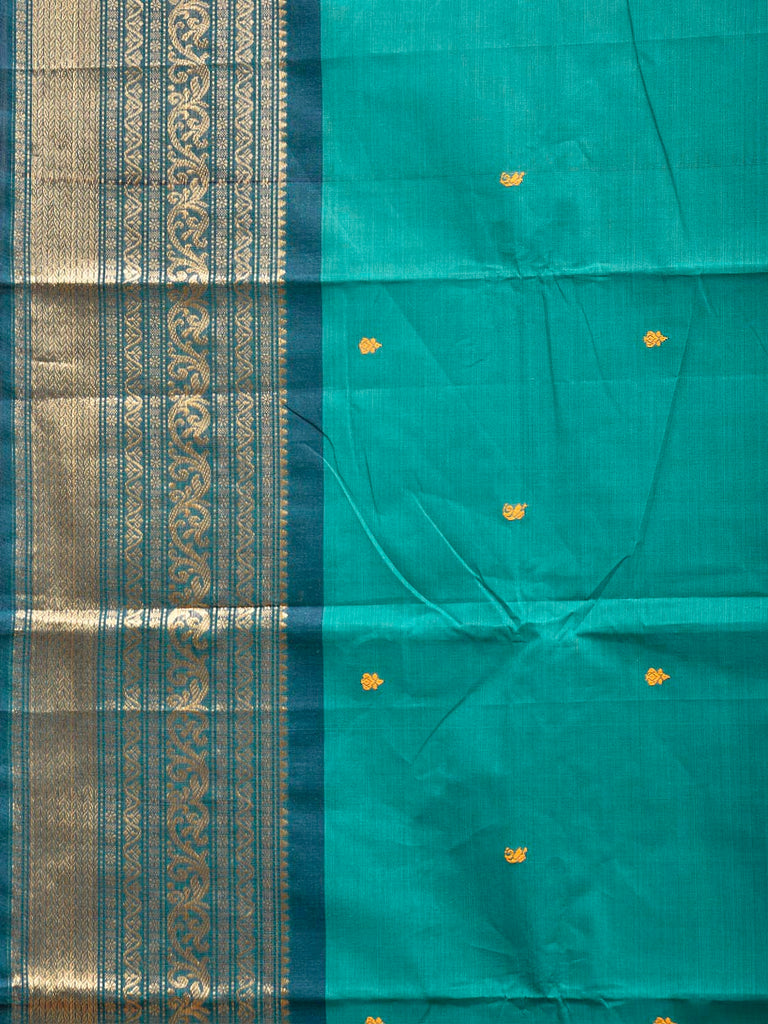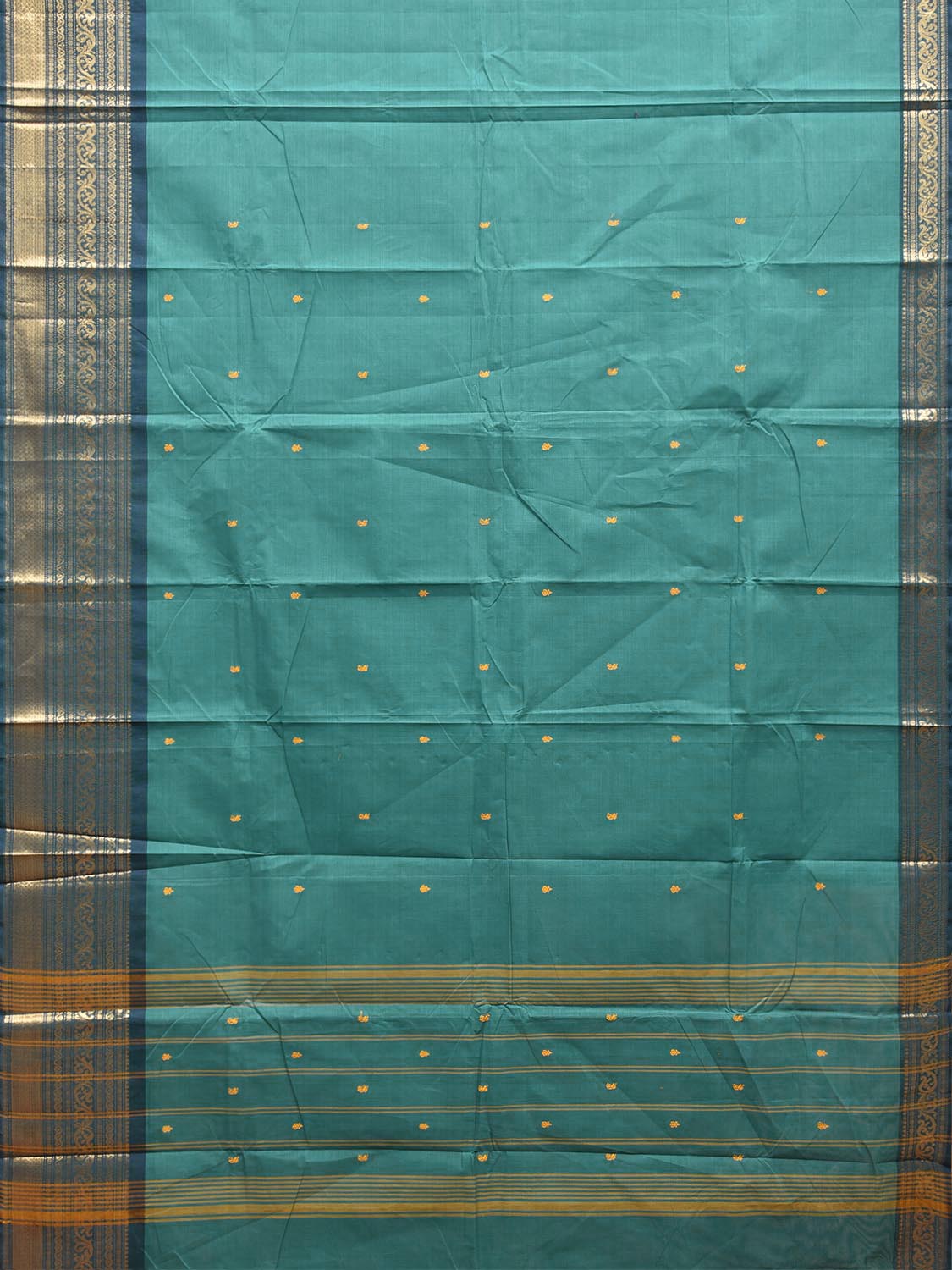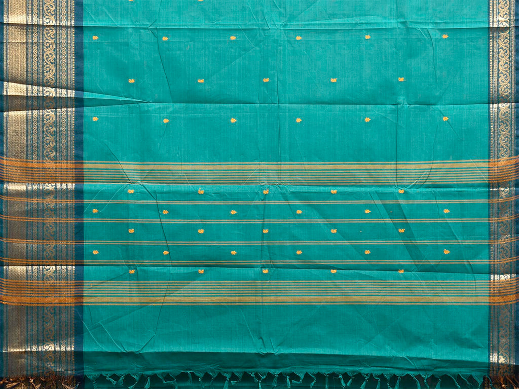 Turquoise and Teal Kanchipuram Cotton Saree with Border and Strips Pallu Design No Blouse. Traditional Simple South Indian Attire Saree for any Casual Occasions. As it’s a cotton saree we advice gentle handwash separately for fabric care. This saree has no blouse.