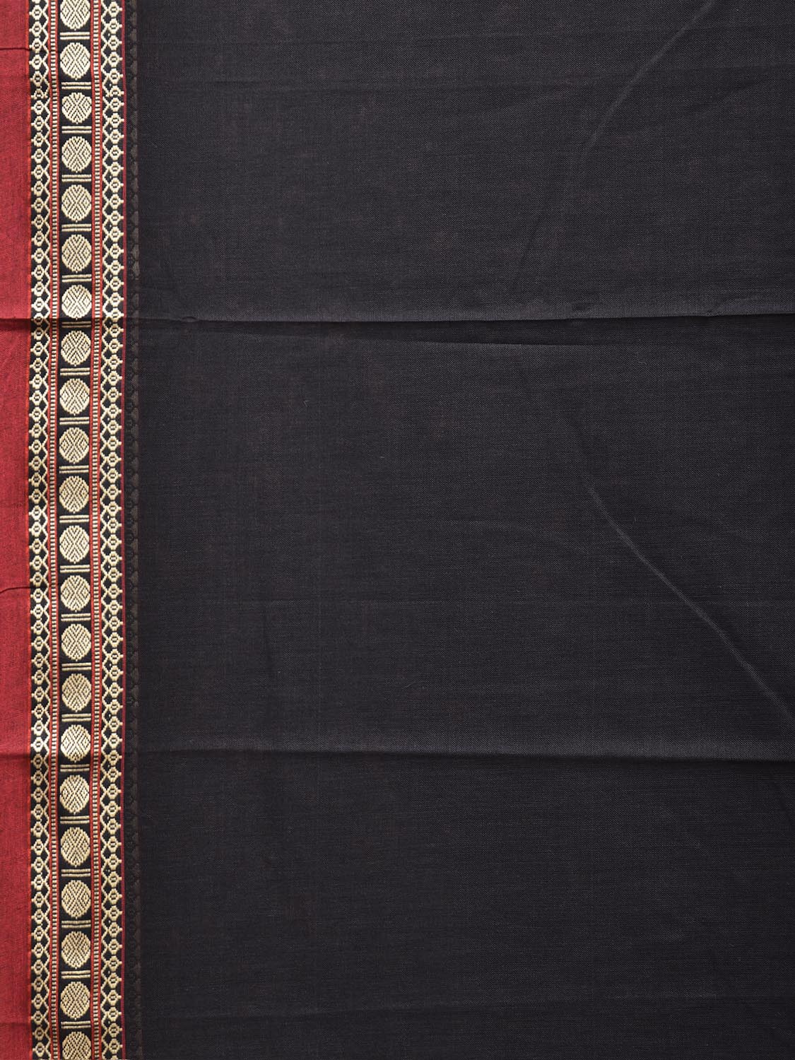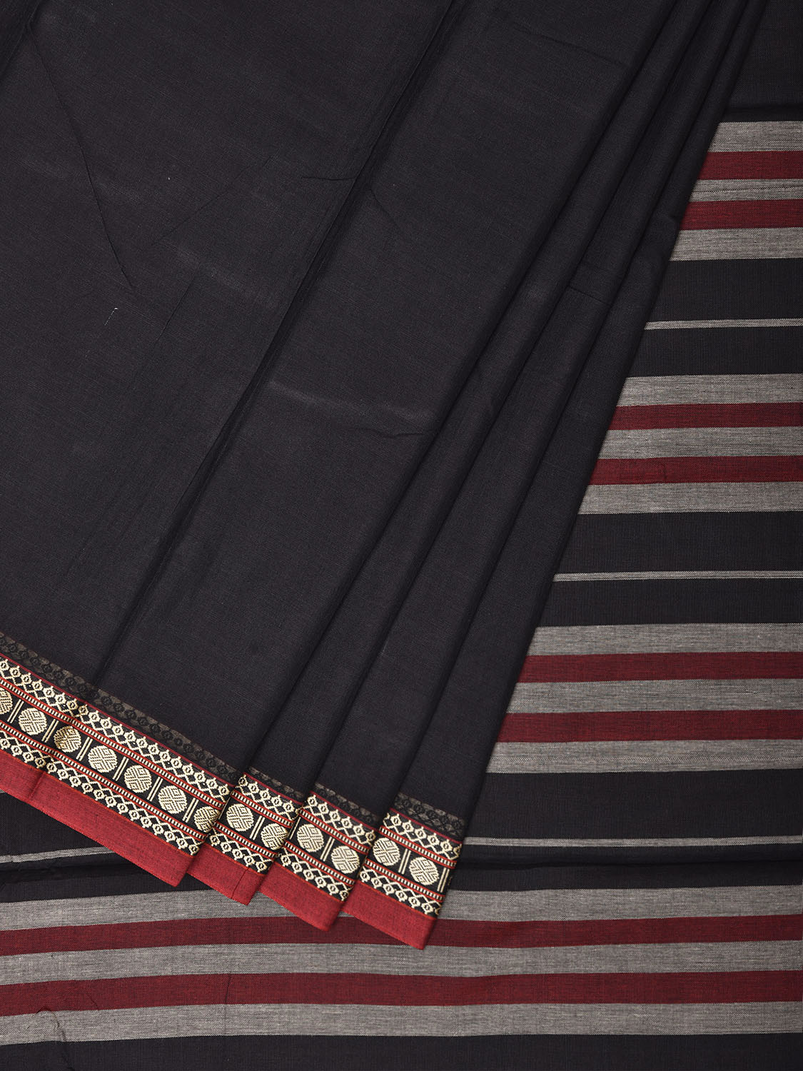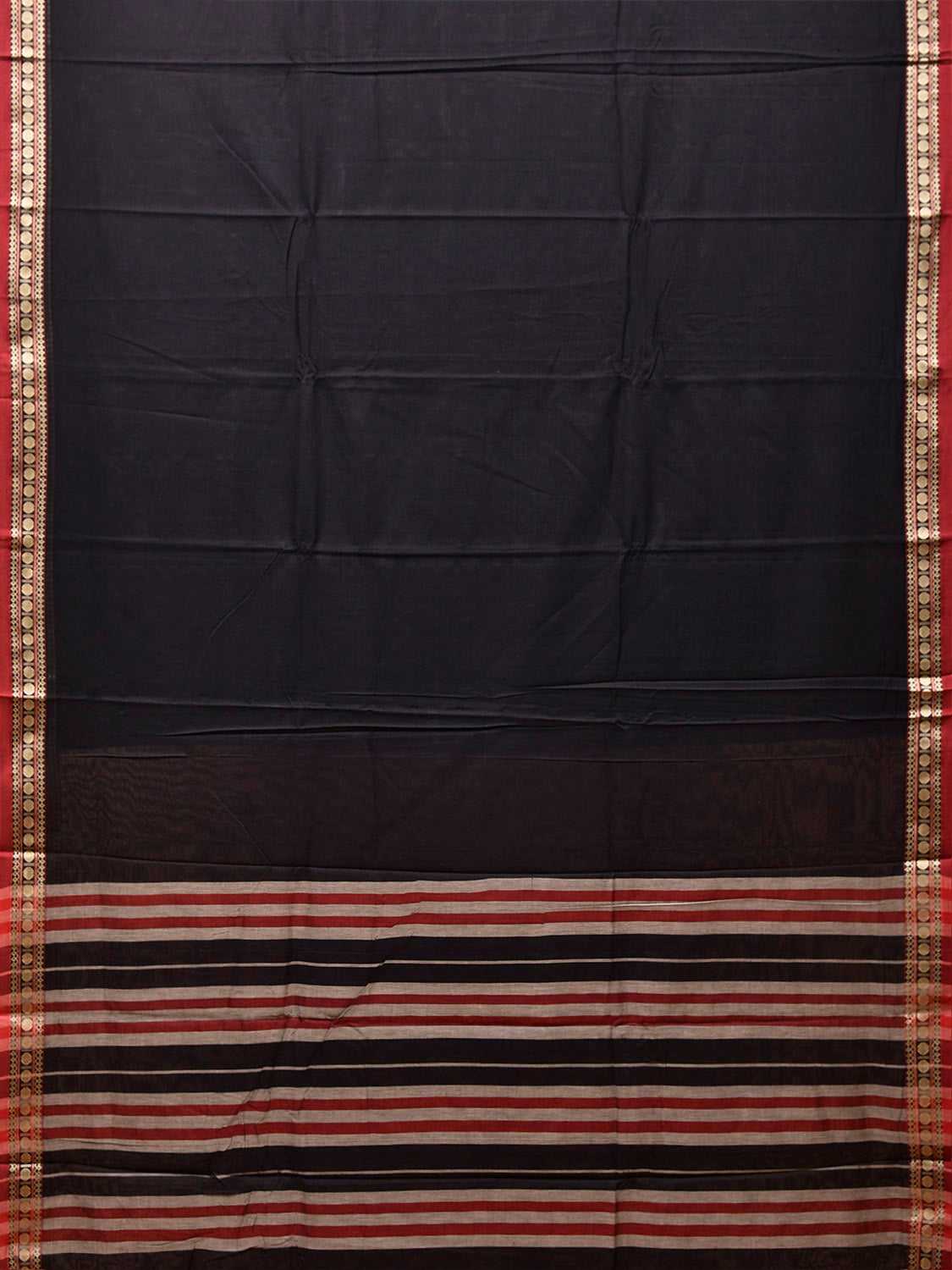 Black and Red Narayanpet Cotton Plain Saree with Strips Pallu Design No Blouse. This saree has no blouse.