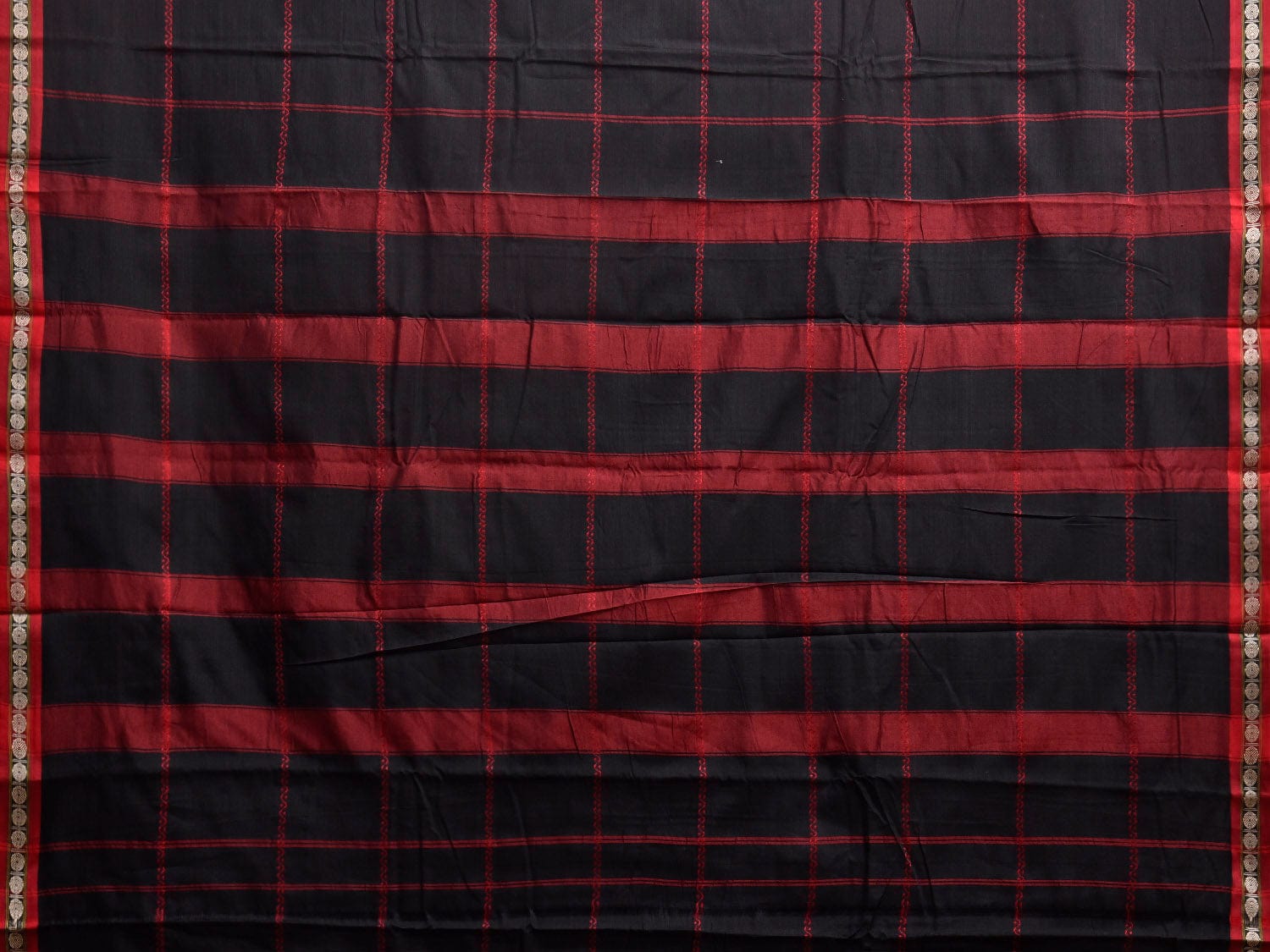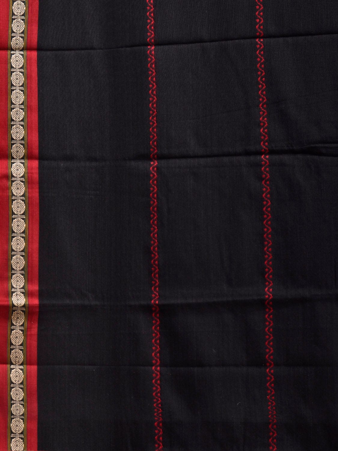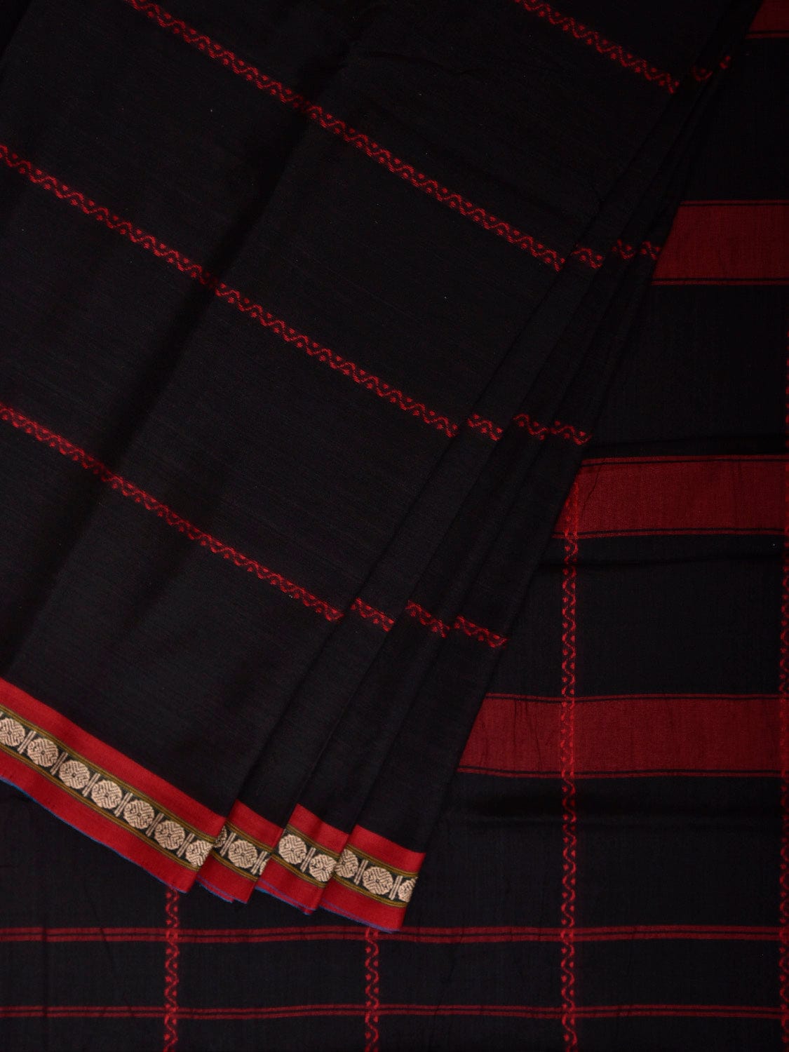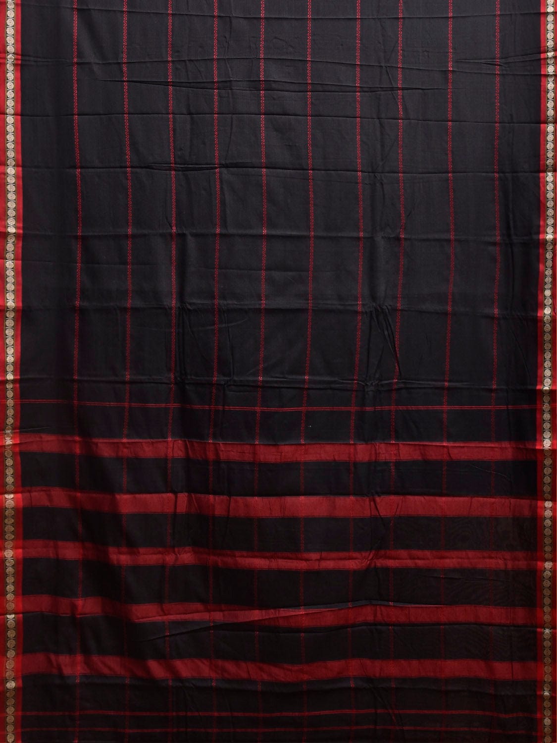 Black and Red Narayanpet Cotton Saree with Strips Design No Blouse.