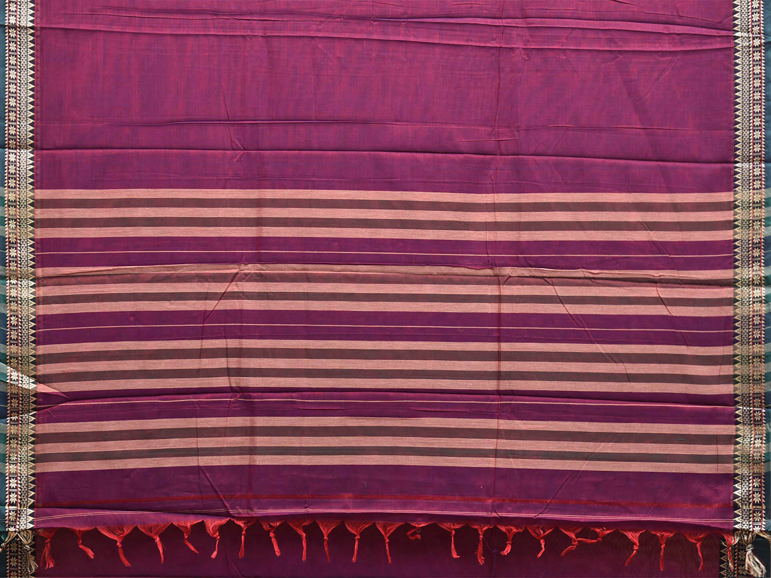 Dark Magenta Narayanpet Cotton Plain Saree with Strips Pallu and Border Design No Blouse. This saree has no blouse.