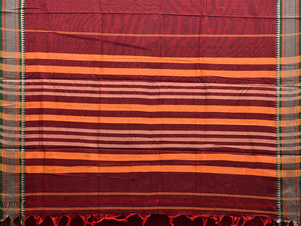 Dark Red Narayanpet Cotton Plain Saree with Strips Pallu and Border Design No Blouse. This saree has no blouse.