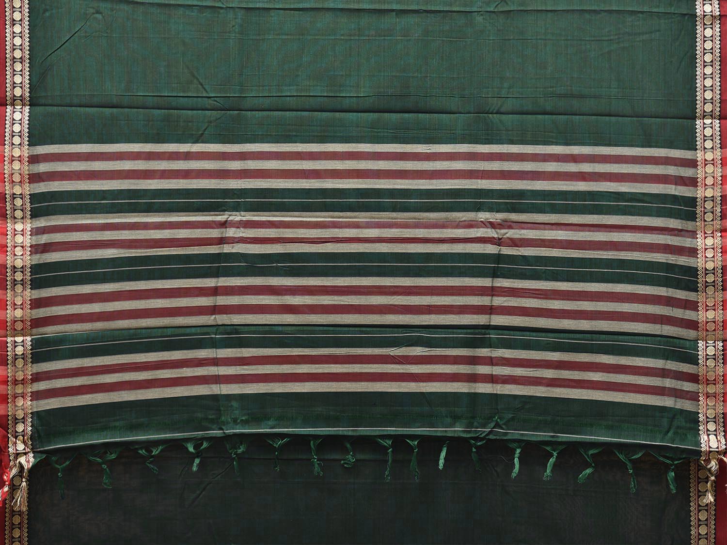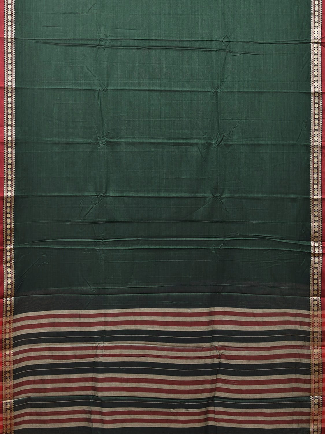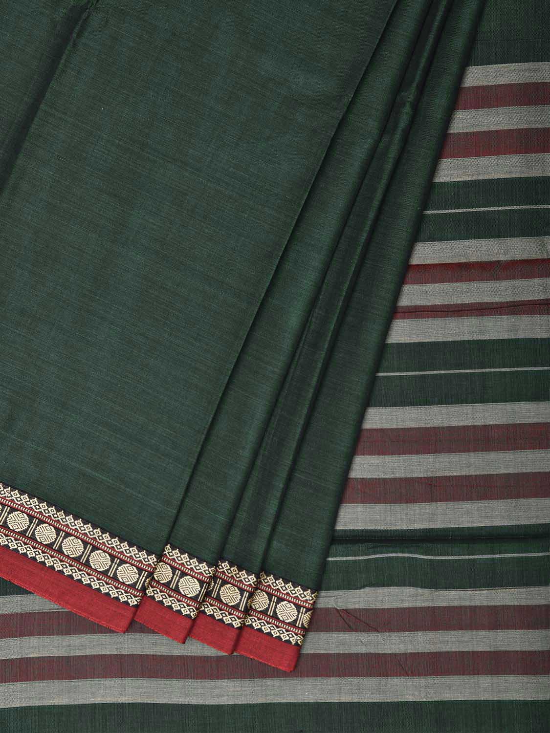 Green and Red Narayanpet Cotton Plain Saree with Strips Pallu Design No Blouse. This saree has no blouse.