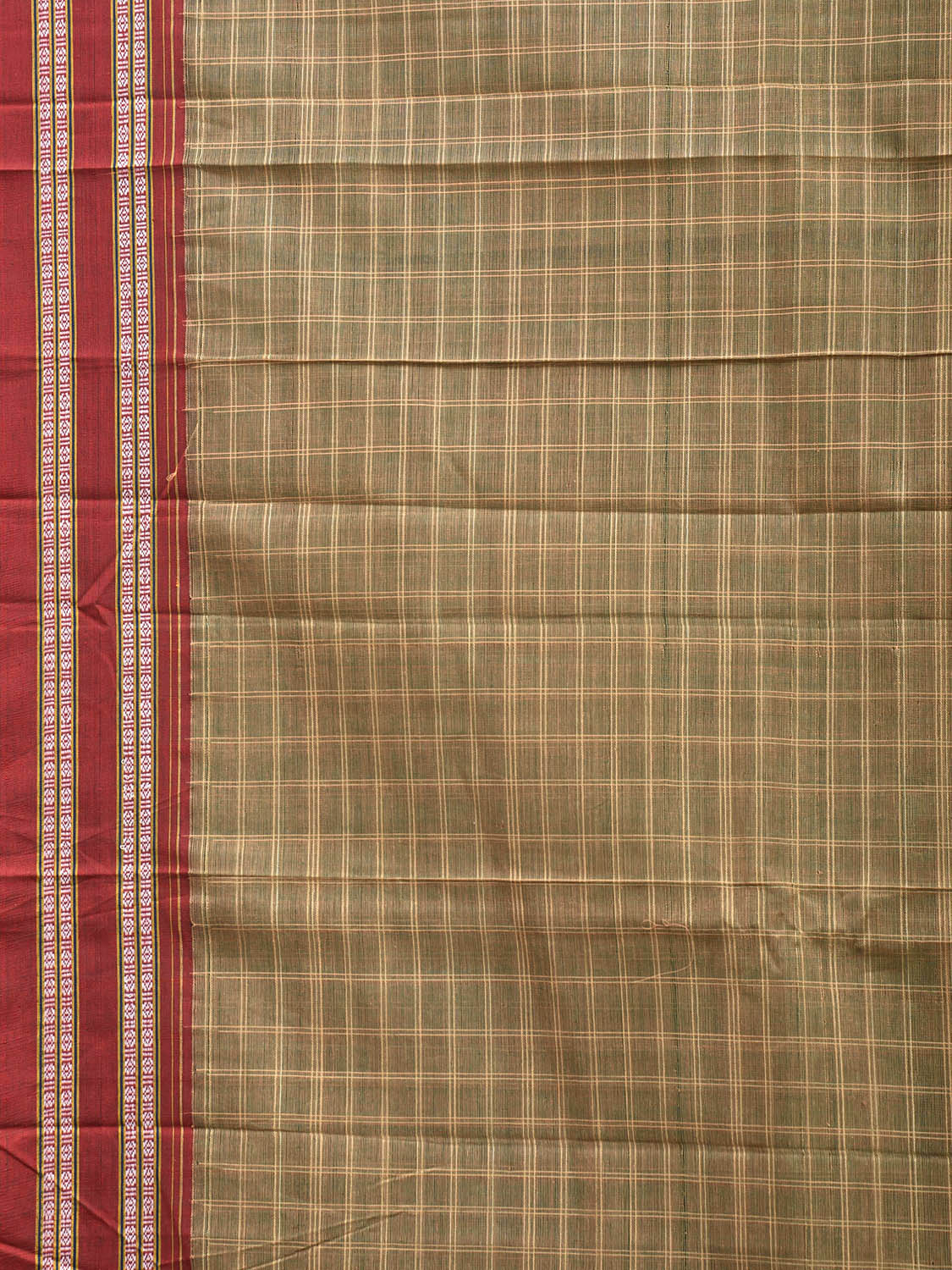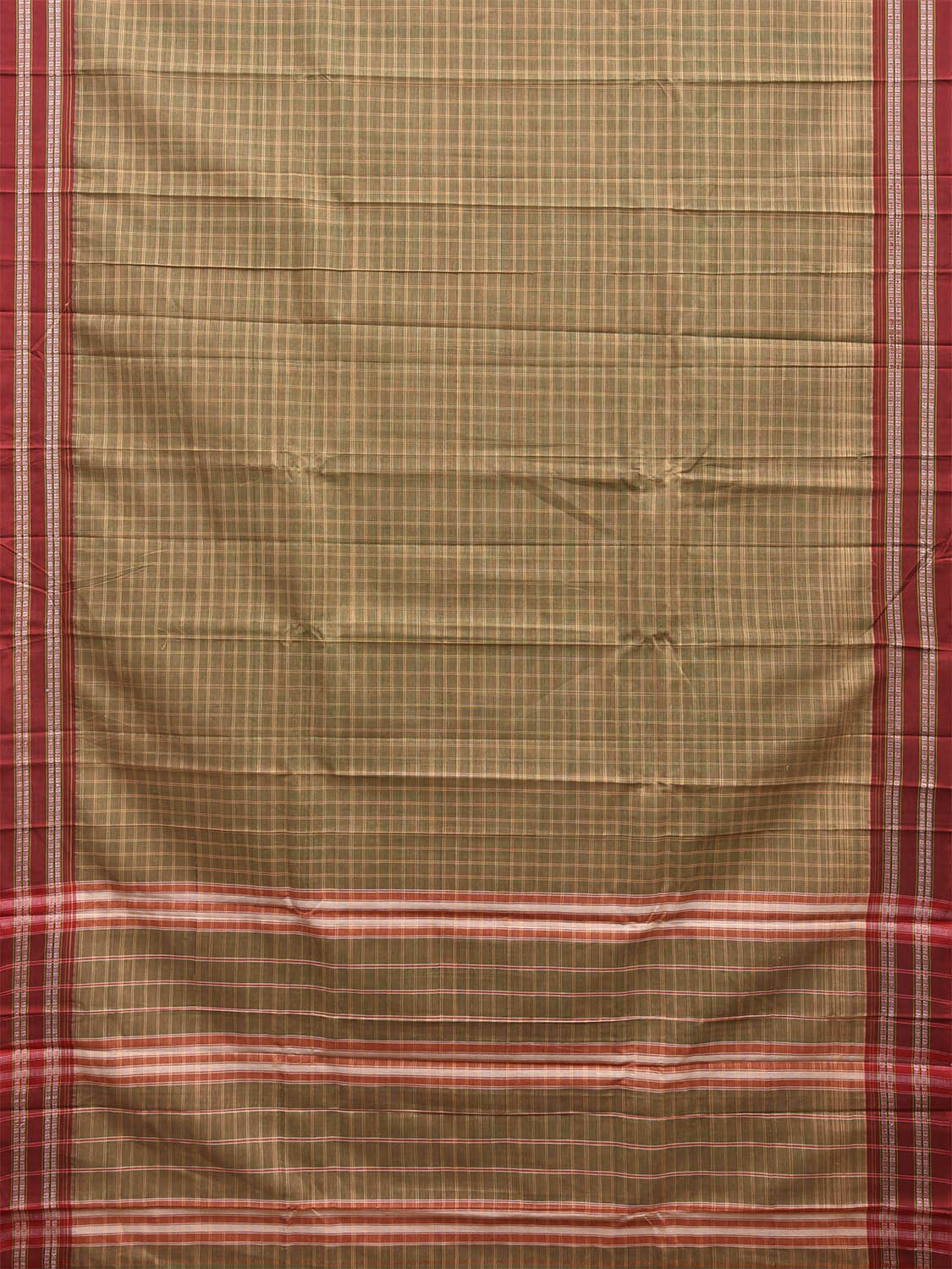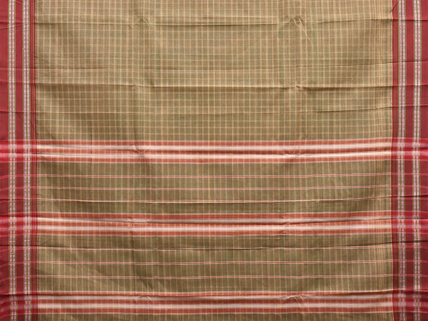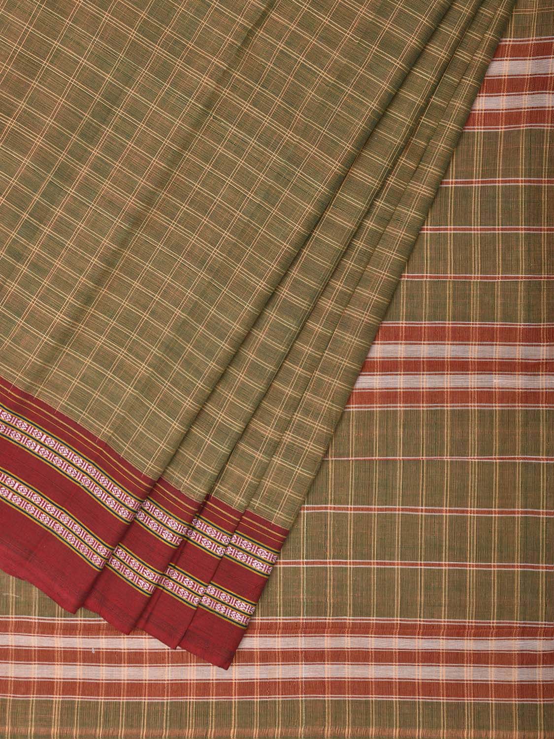 Light Olive and Red Narayanpet Cotton Saree with Big Checks Design No Blouse. This saree has no blouse.