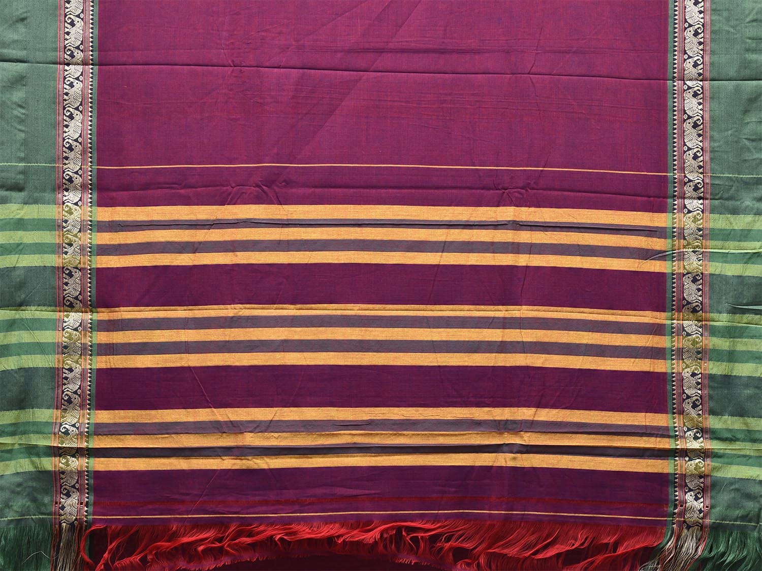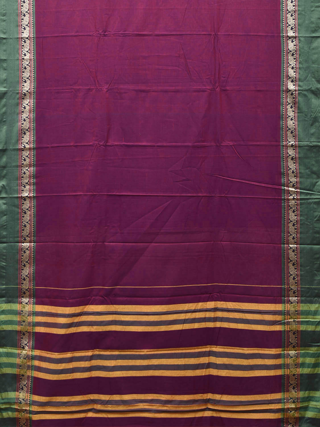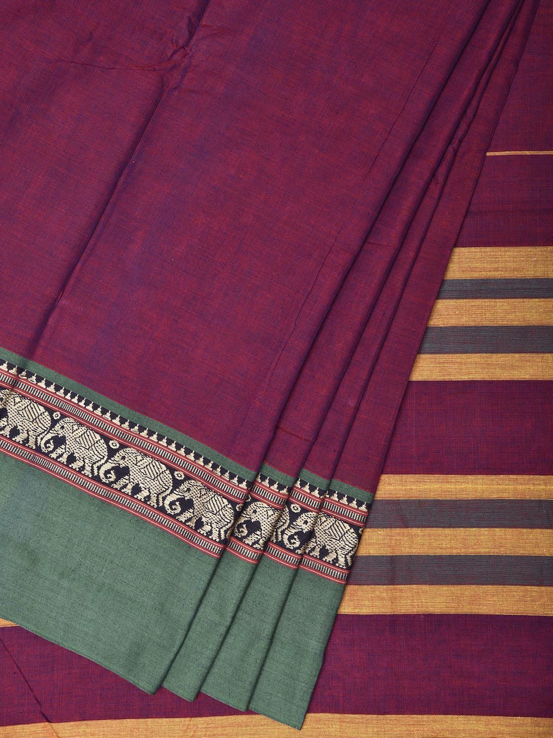 Purple and Green Narayanpet Cotton Plain Saree with Elephant Border Design No Blouse. This saree has no blouse.