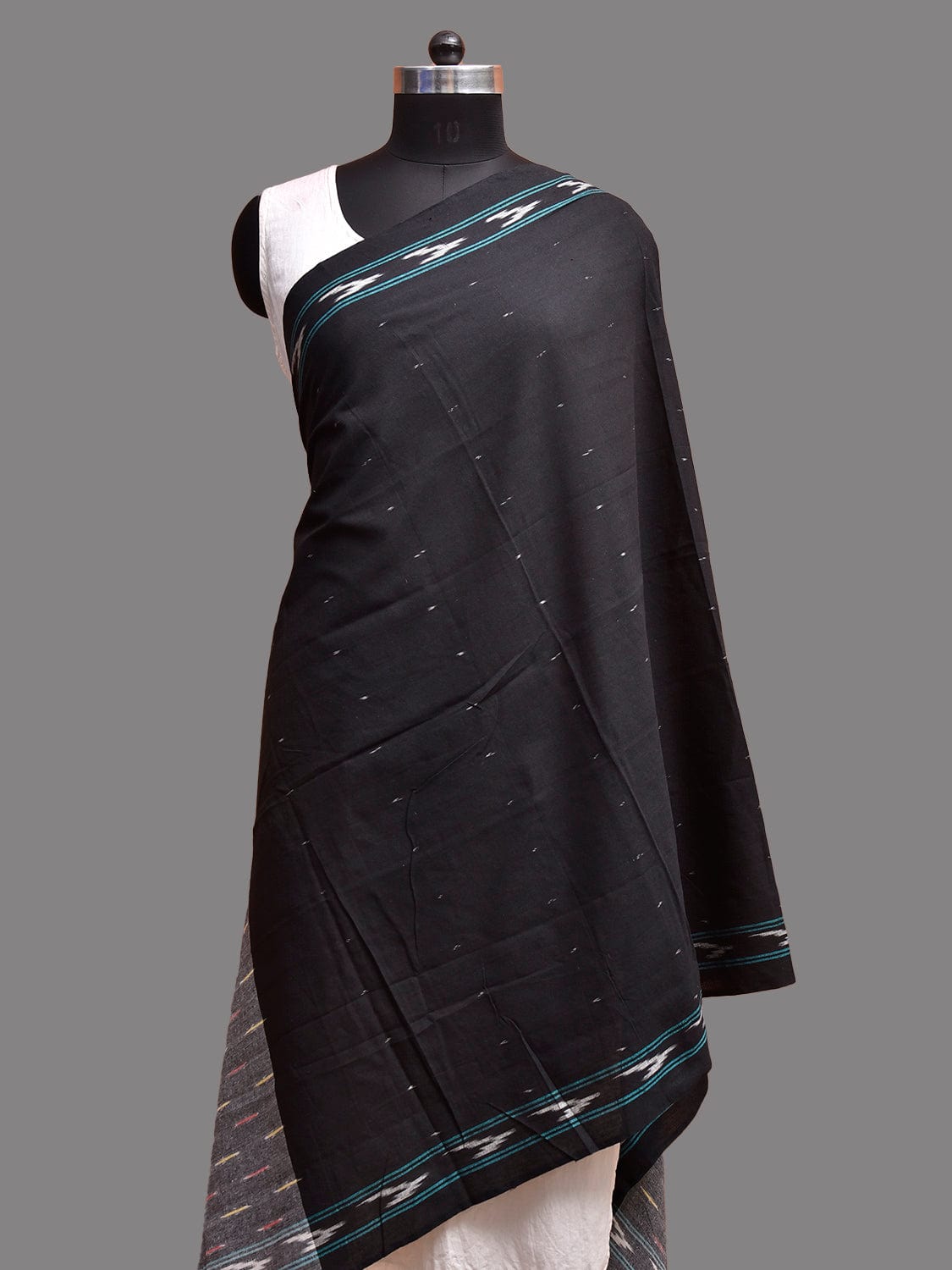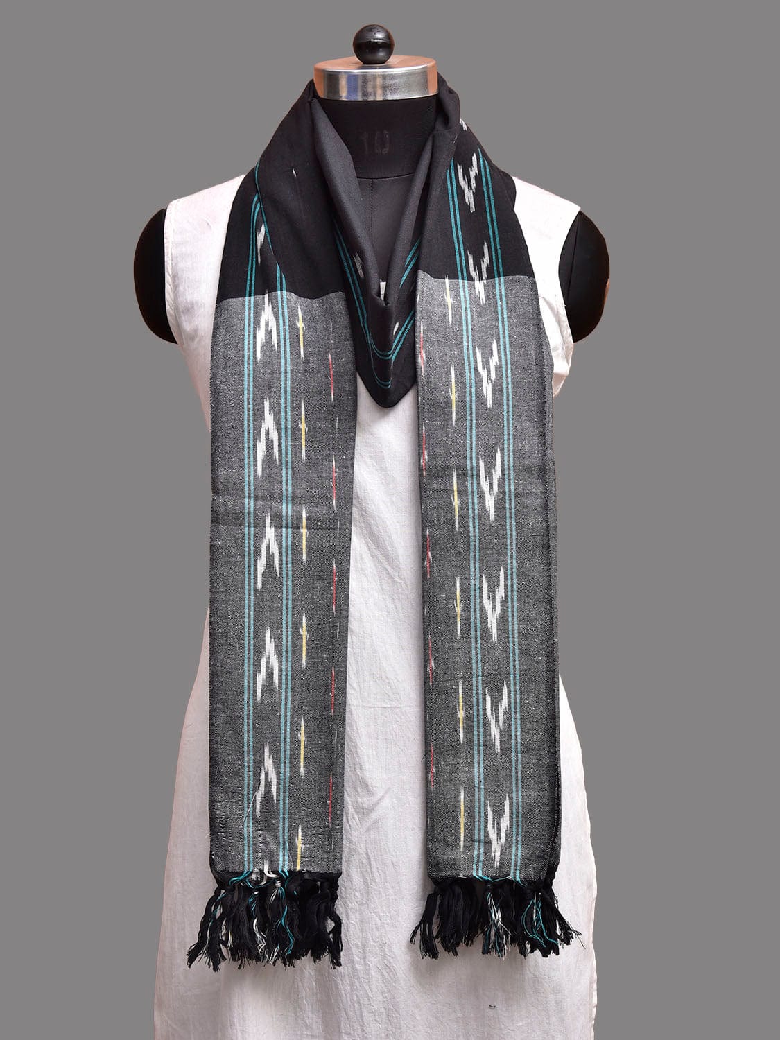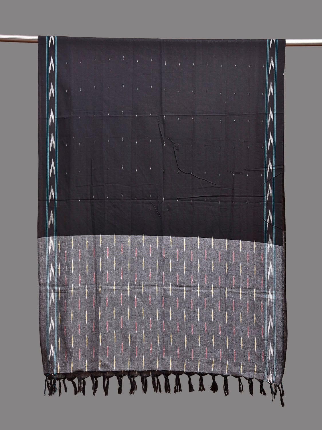 Black and Grey Pochampally Ikat Cotton Handloom Dupatta with Contrast Pallu Design. This Handloom Dupatta has been woven using the resist-dyeing, which produces the unique patterns adorning the fabric. We advise gentle handwash separately for fabric care.