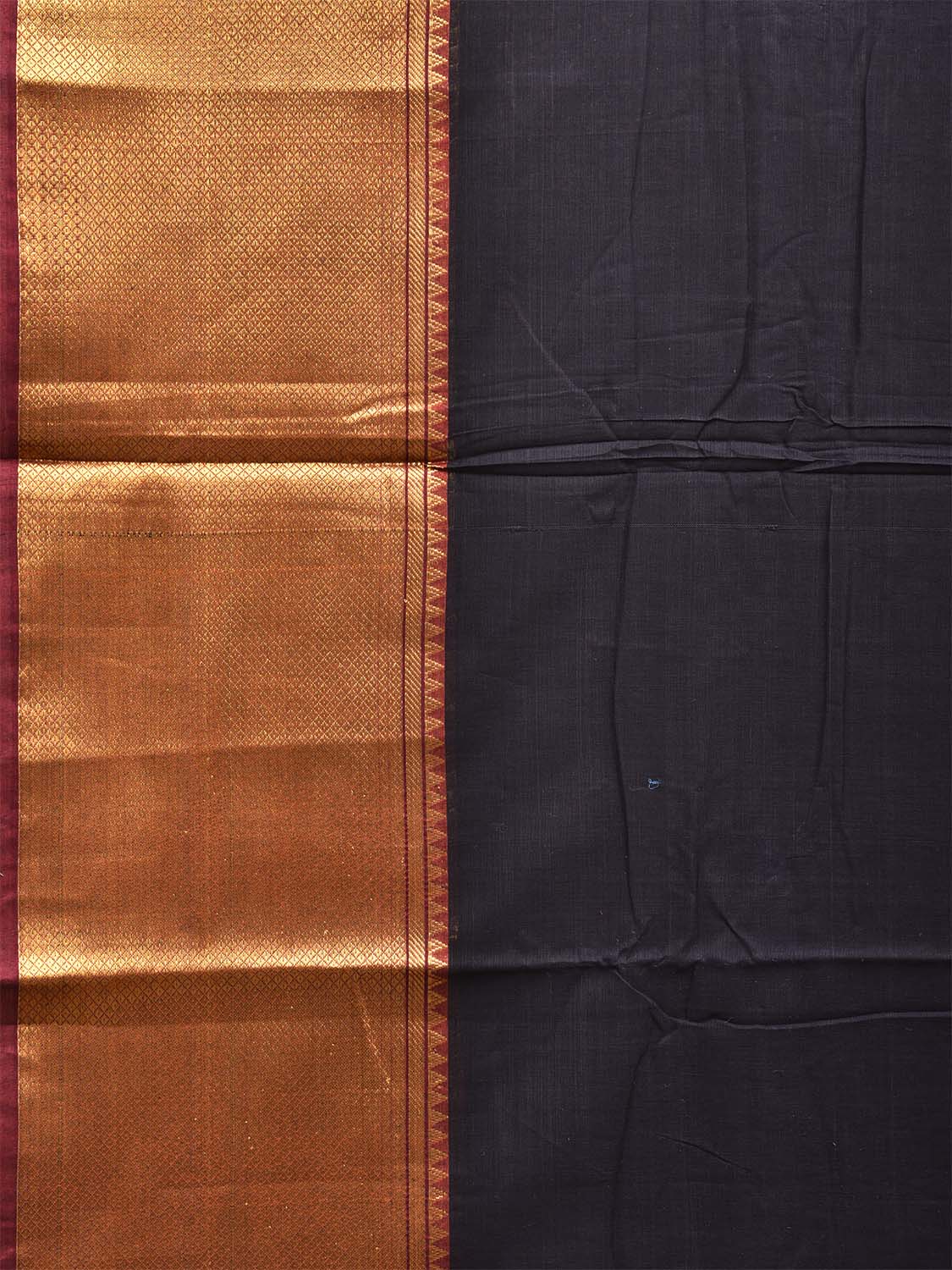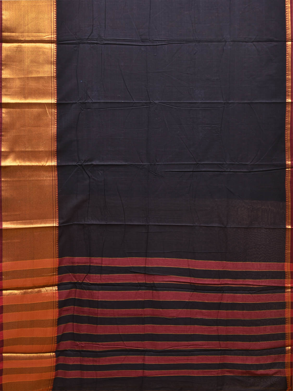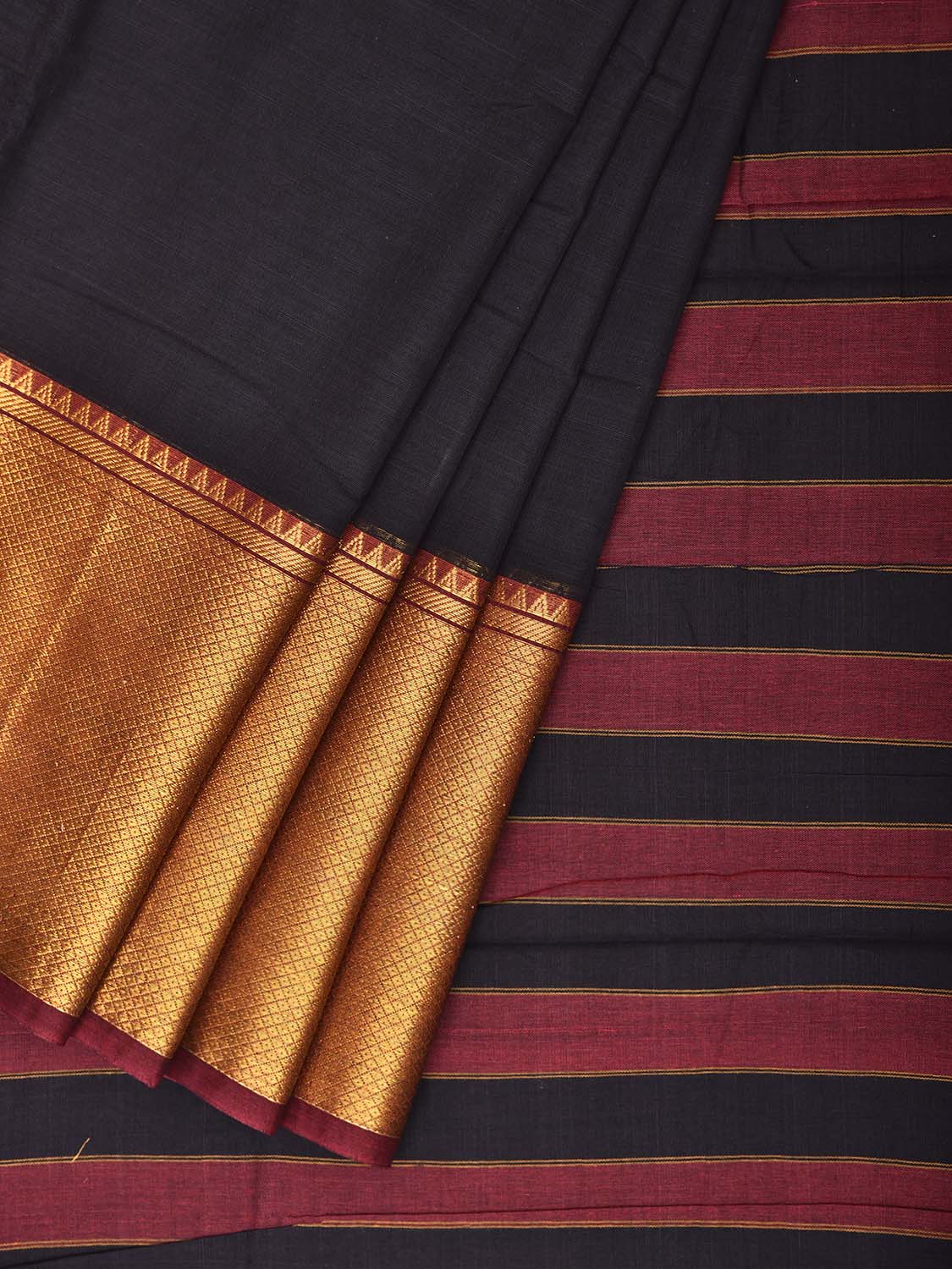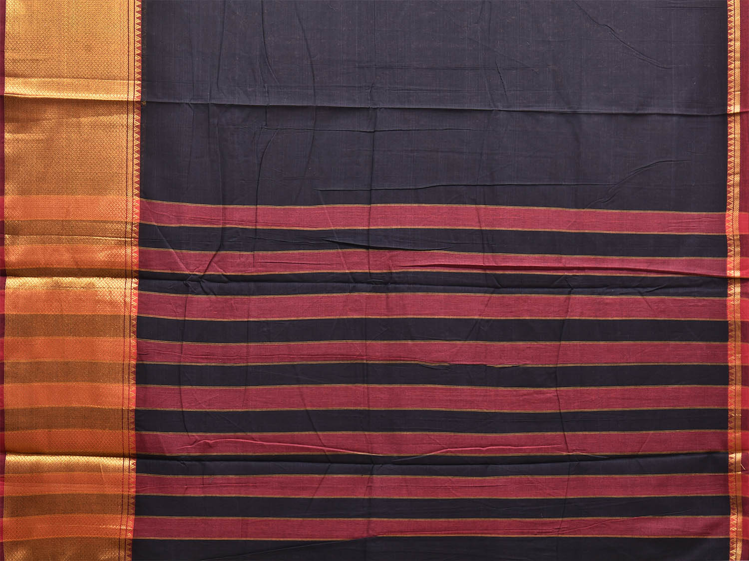 Black and Red Kanchipuram Cotton Plain Saree with Strips Pallu and Border Design No Blouse. Traditional South Indian Attire Saree for any Special Occasions. For fabric care we advice dry clean. This saree has no blouse.