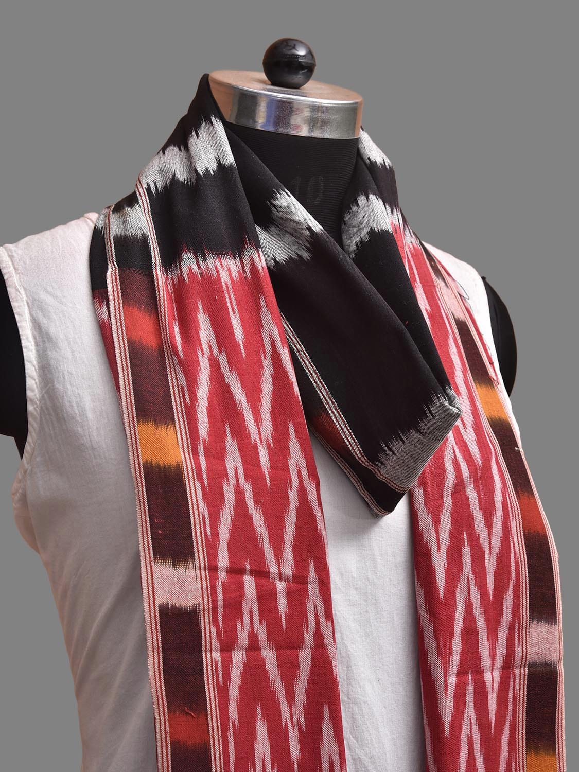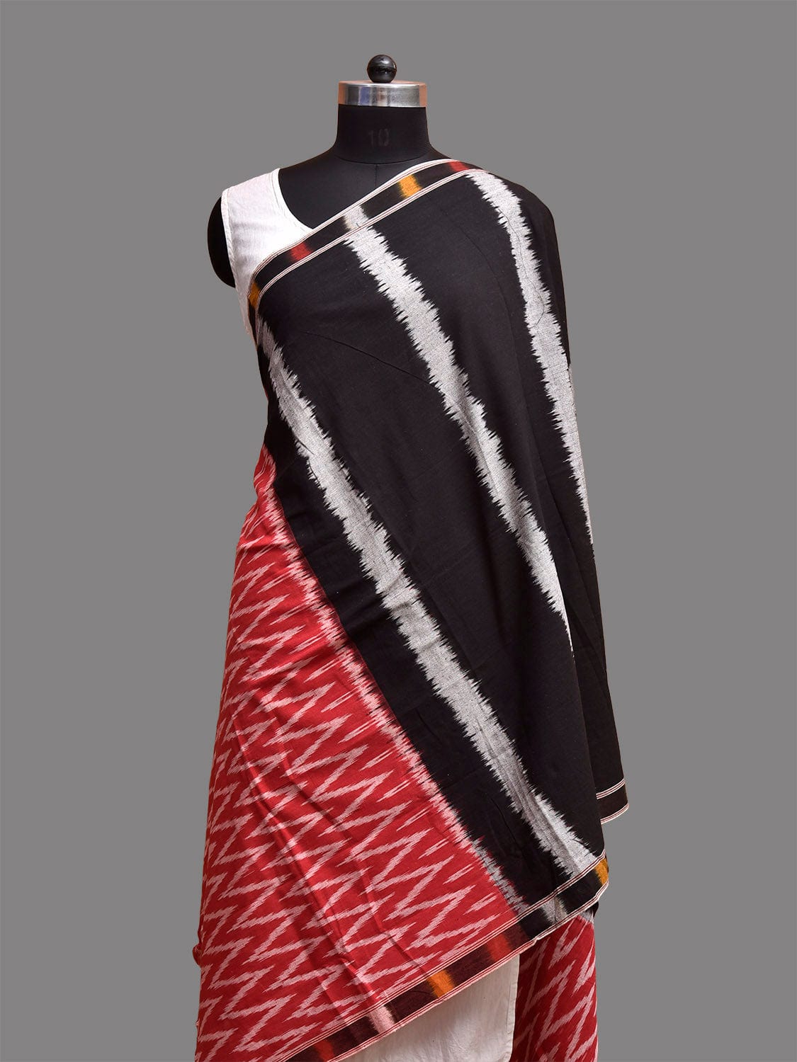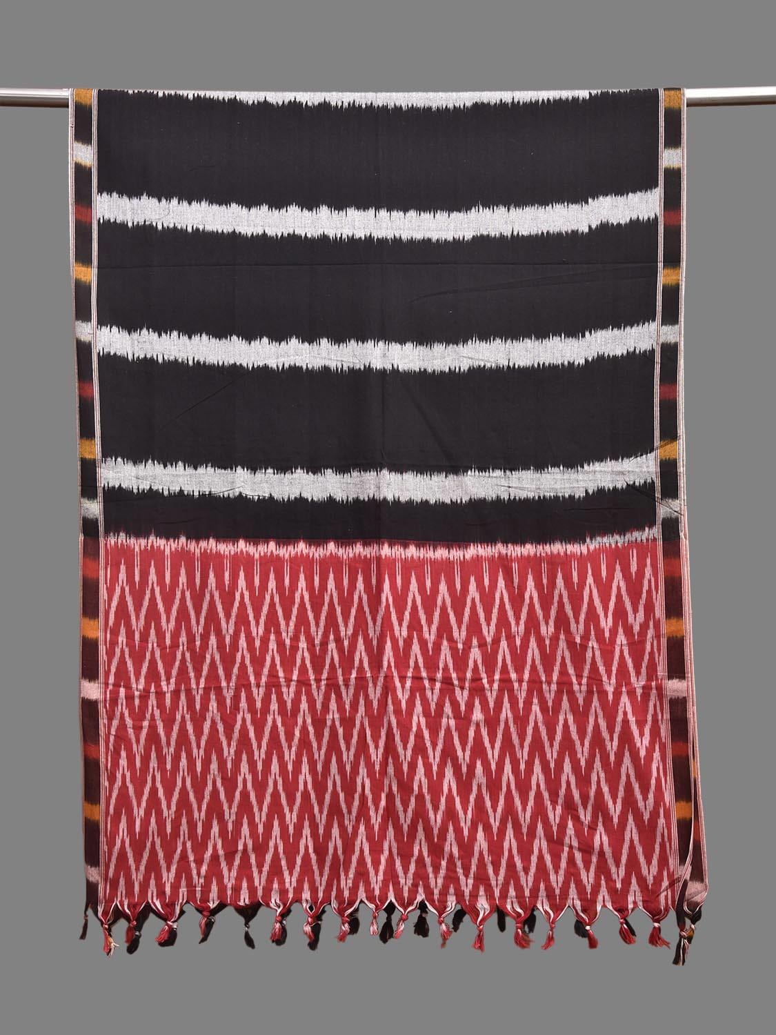Black and Red Pochampally Ikat Cotton Handloom Dupatta with Strips and Zig-Zag Design. This Handloom Saree has been woven using the resist-dyeing, which produces the unique patterns adorning the fabric. We advise gentle handwash separately for fabric care.