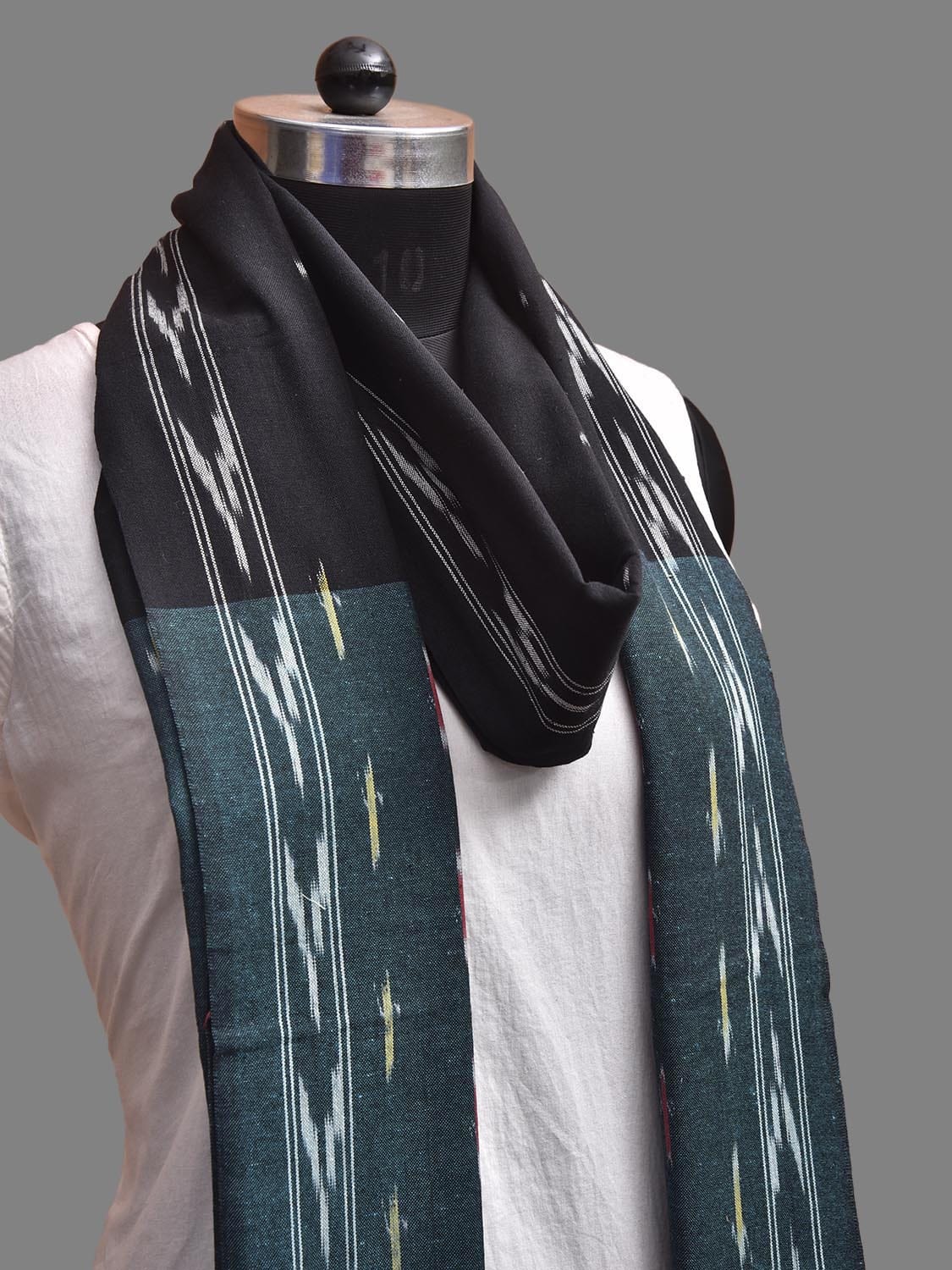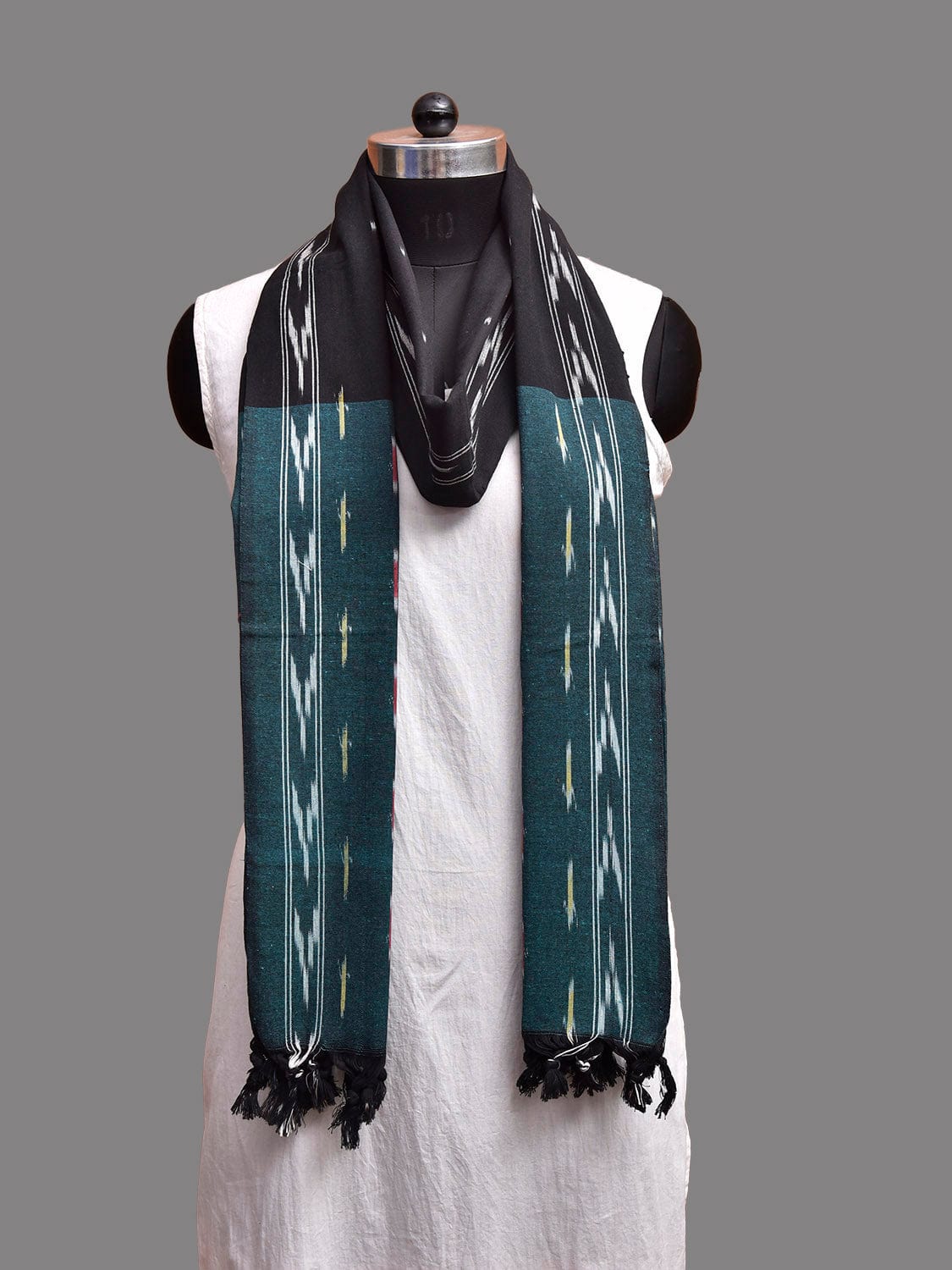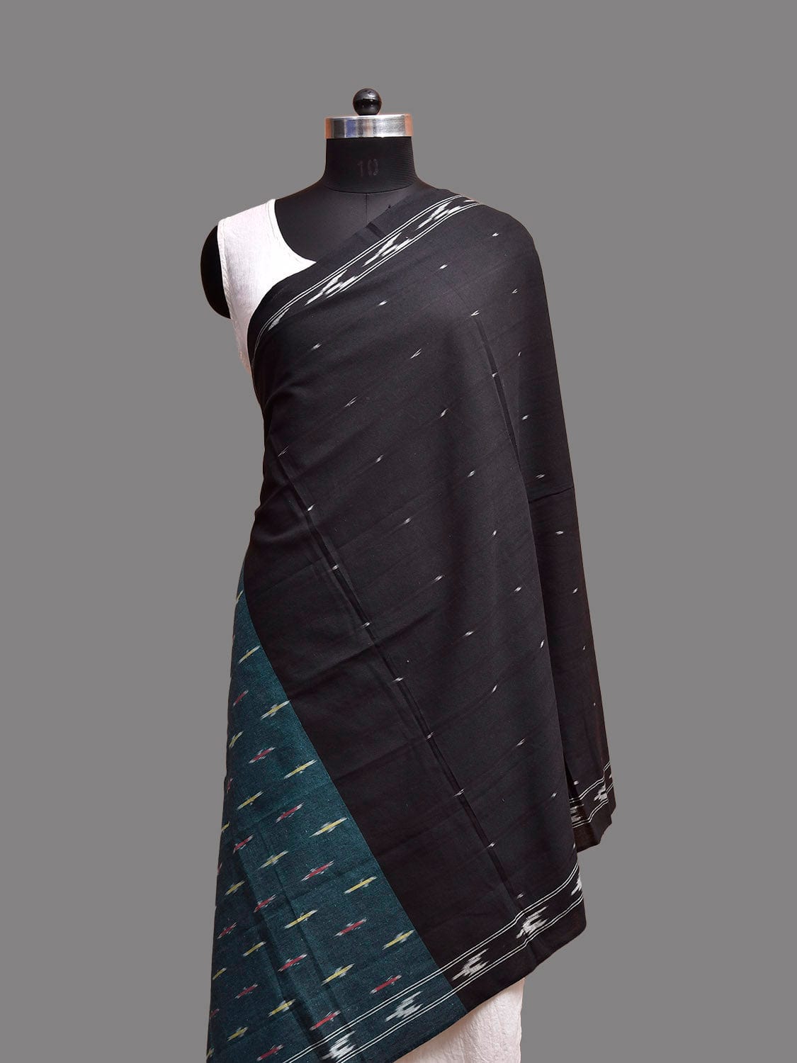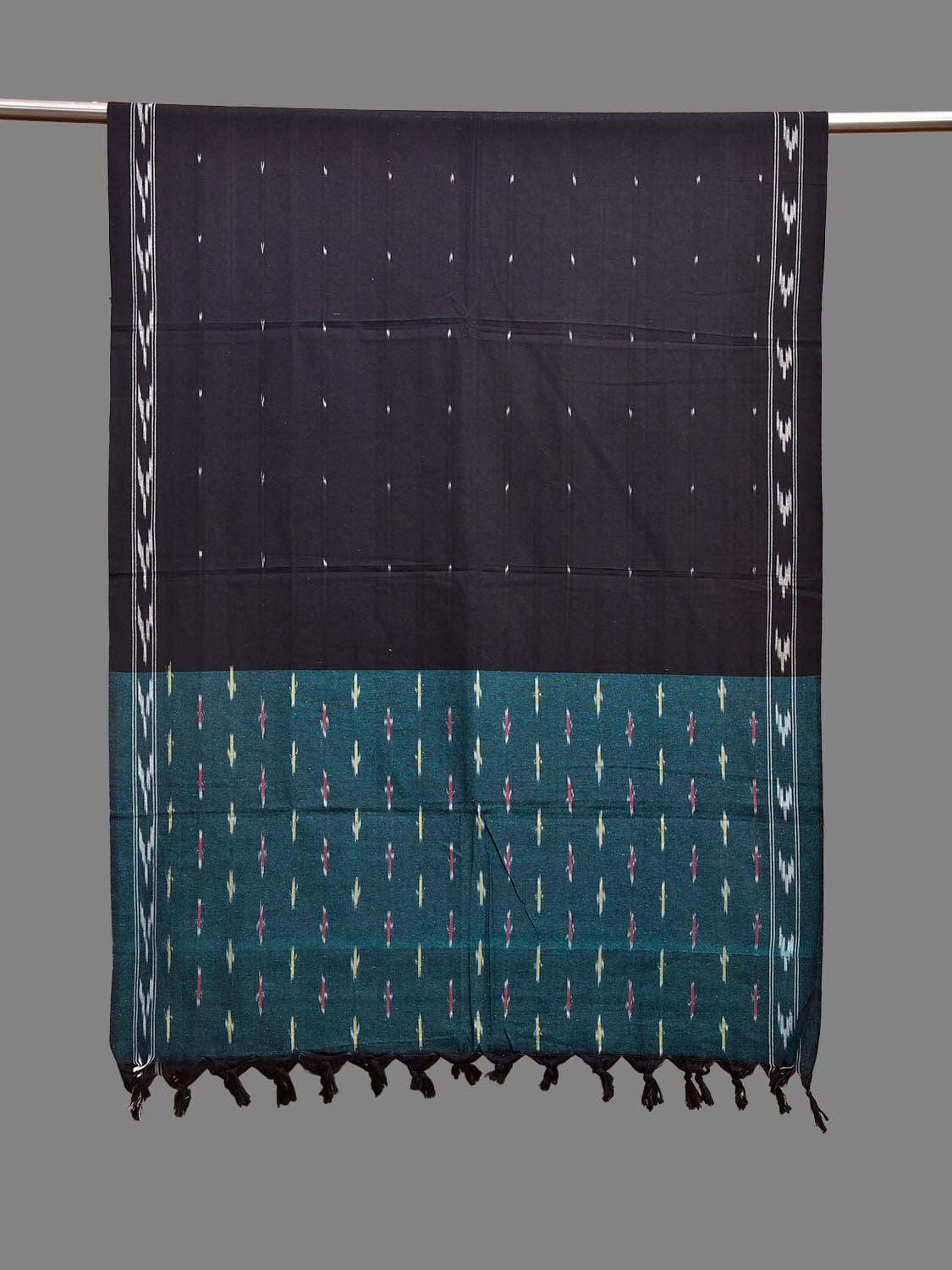 Black and Teal Pochampally Ikat Cotton Handloom Dupatta with Buta Pallu Design. This Handloom Saree has been woven using the resist-dyeing, which produces the unique patterns adorning the fabric. We advise gentle handwash separately for fabric care.