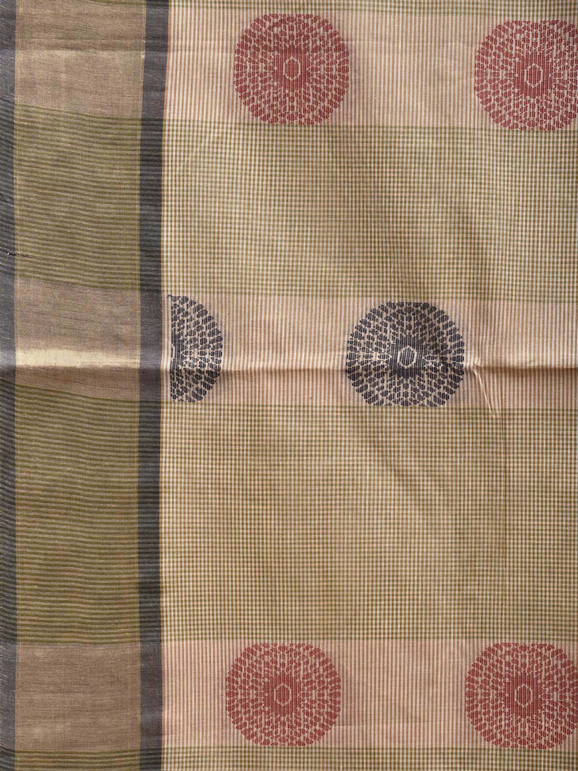 Cream and Green Venkatagiri Cotton Saree with Body Buta and Pallu Design. Venkatagiri sarees are known for very fine cotton hand woven cotton saree. They are light weight and are traditional saree made in Andhra Pradesh. For fabric care we advice gentle handwash separately.