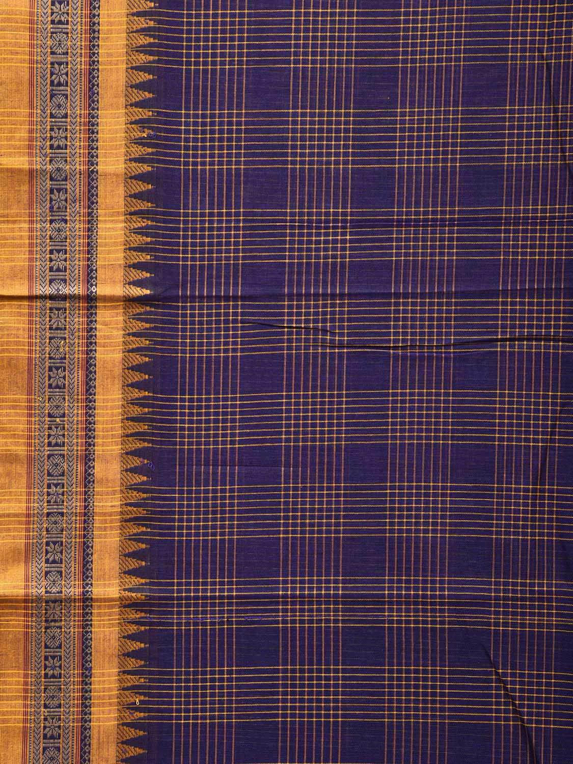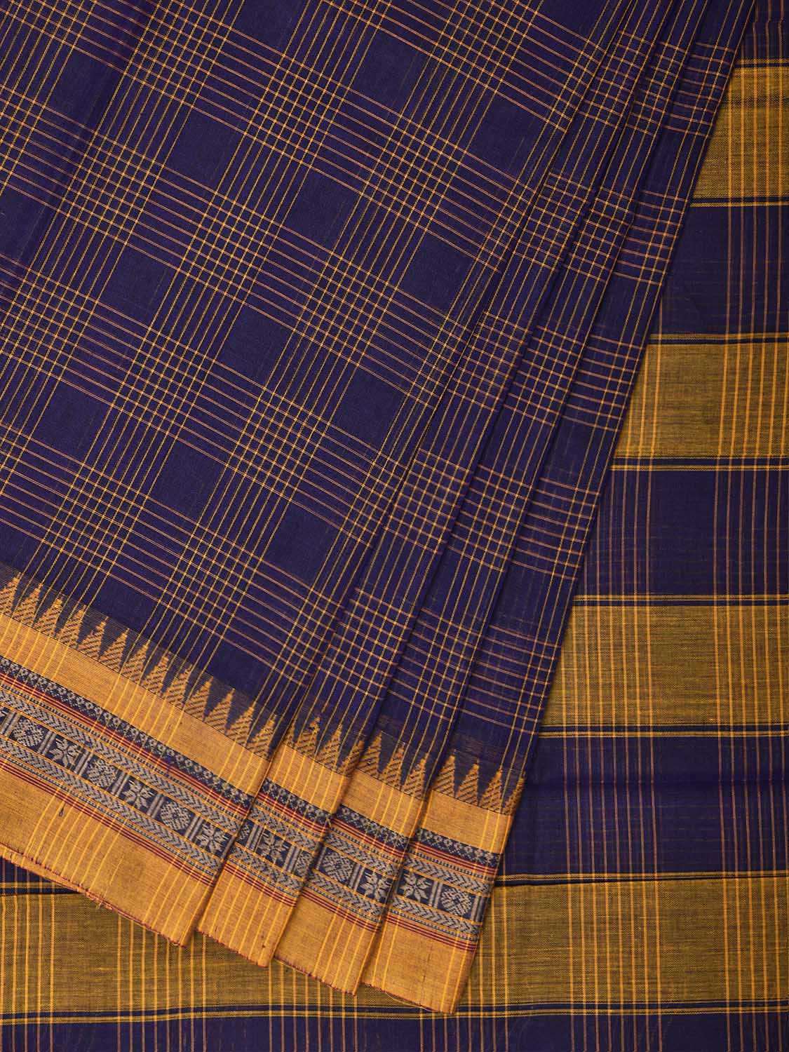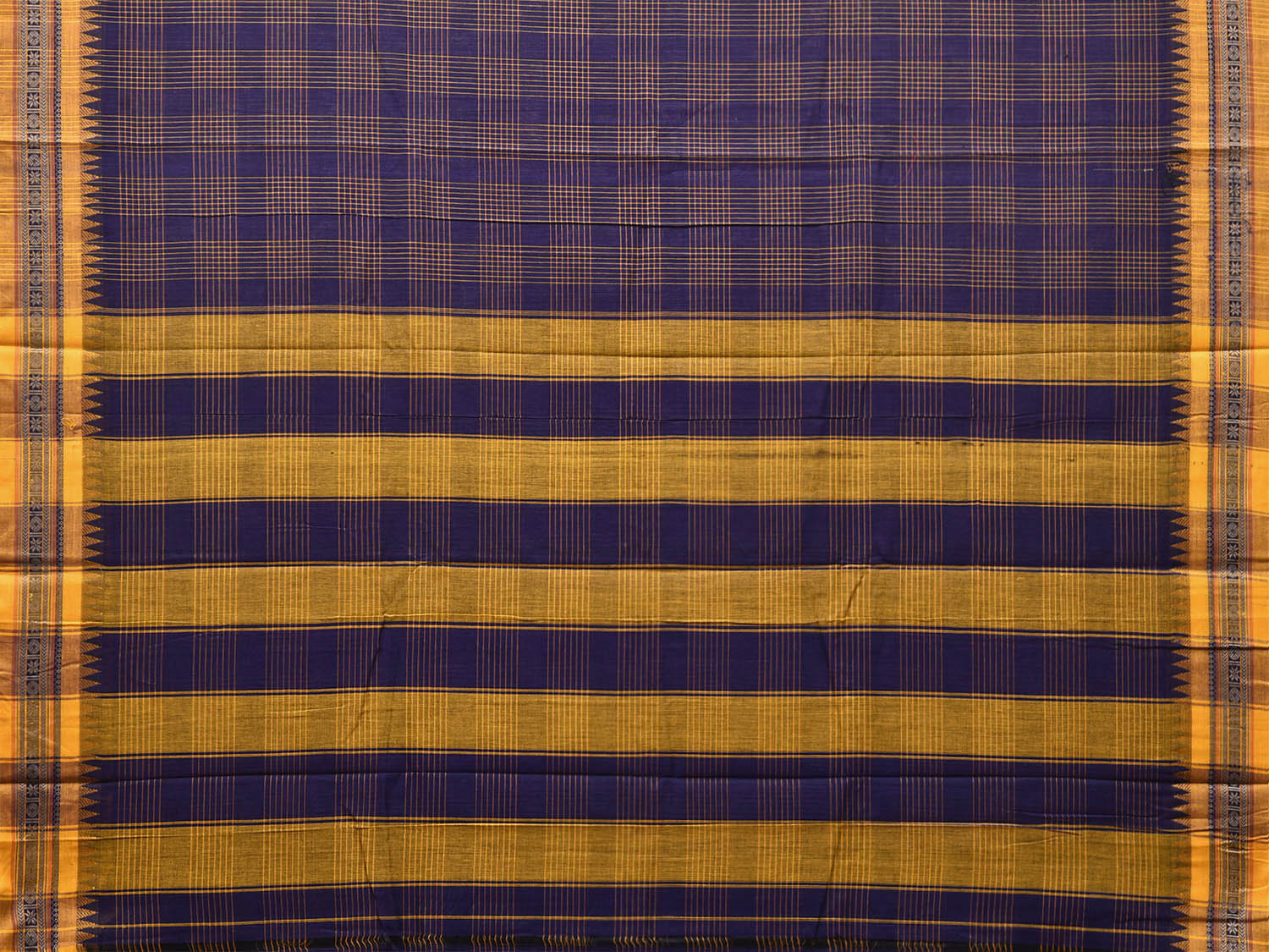 Dark Blue and Yellow Narayanpet Cotton Saree with Checks and Border Design No Blouse. This saree has no blouse.