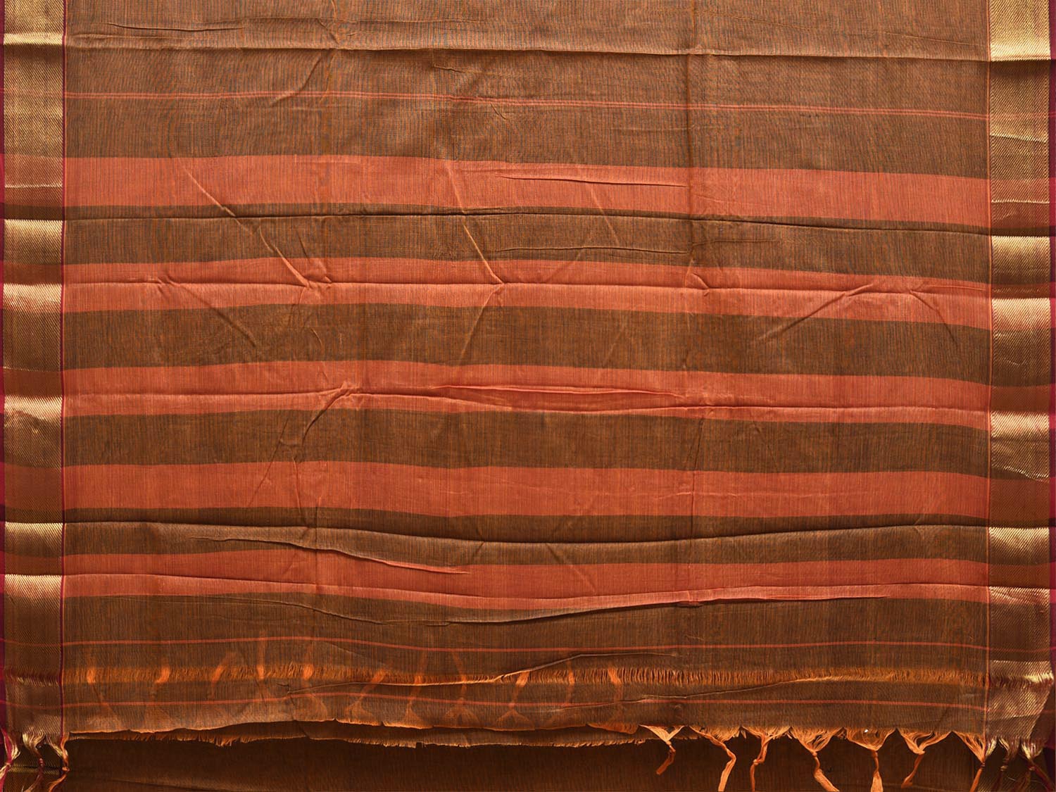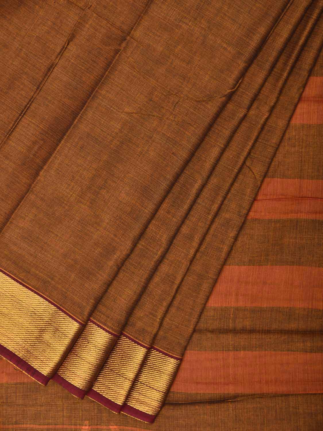 Dark Mustard Mangalgiri Cotton Viscose Plain Saree with Strips Pallu Design No Blouse. These are Simple and Traditional Andhra Pradesh Handloom Dupattas, being soft they are comfortable to wear. For fabric care we advise gentle handwash it separately. This saree has no blouse.