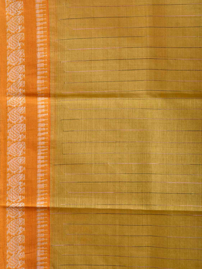 Light Green and Mustard Narayanpet Cotton Saree with Strips Body and Pallu Design No Blouse. This saree has no blouse.
