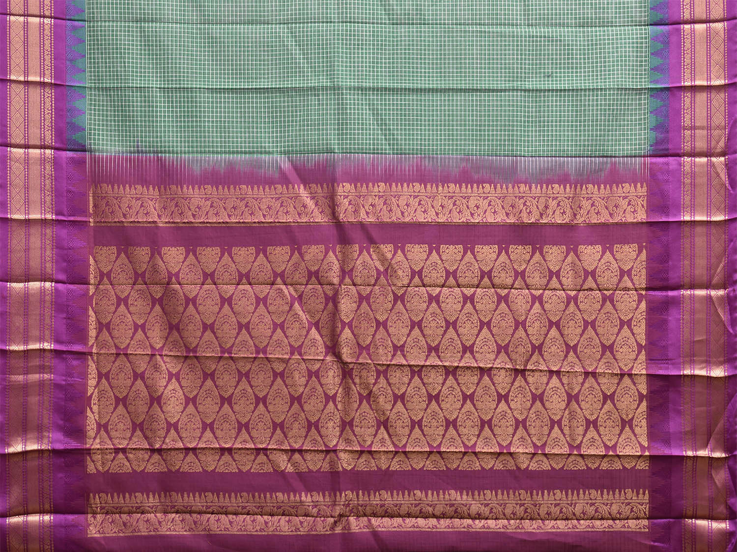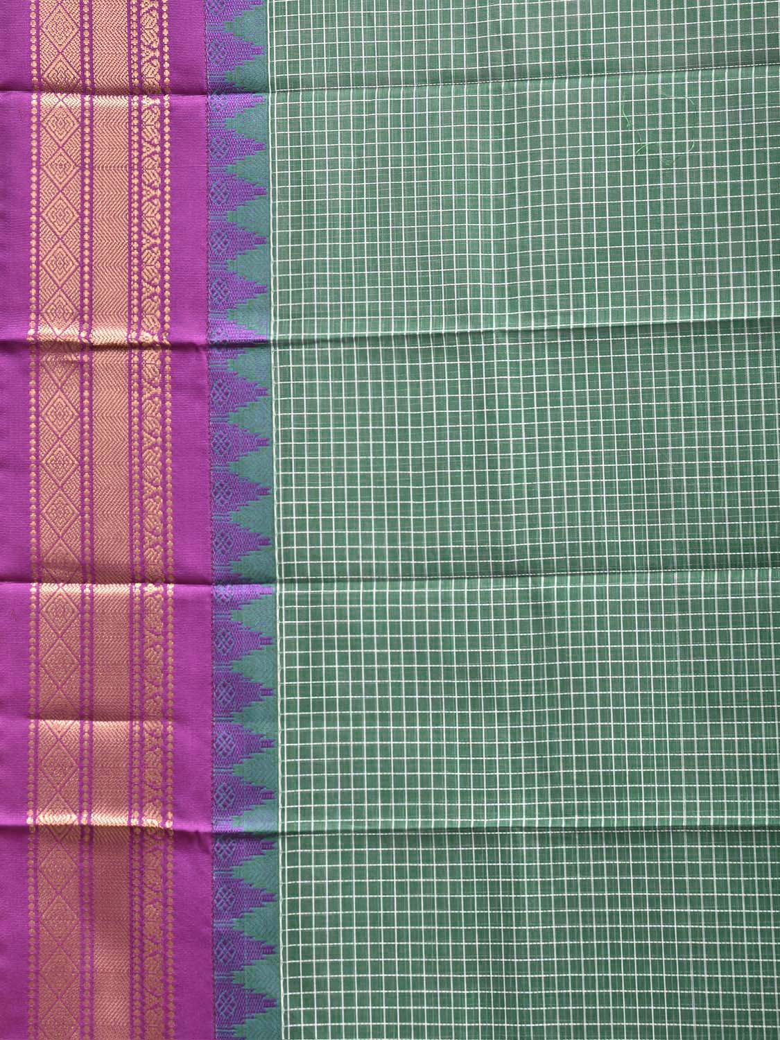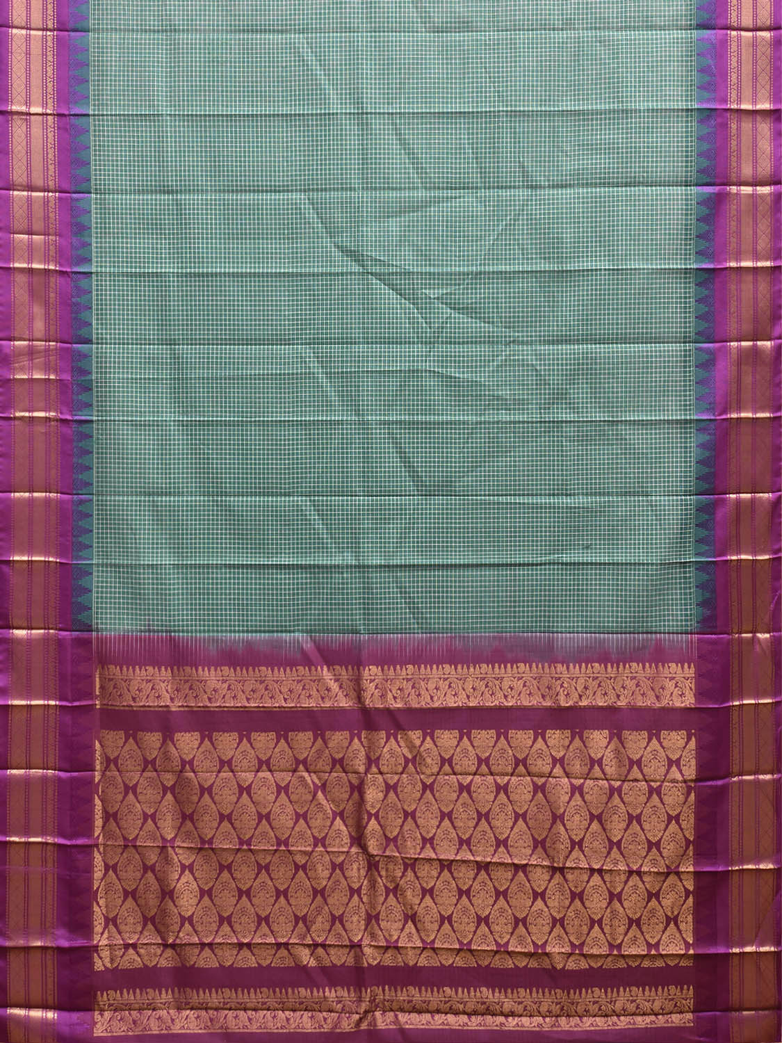 Light Green and Purple Gadwal Cotton Viscose Saree with Checks and Pallu Design No Blouse. Gadwal Sarees are known for their traditional design of border and pallu made of silk and body being either cotton or silk. They are known as Sico sarees for border and pallu being silk and body being cotton. We advice dry clean for fabric care. This saree has no blouse.